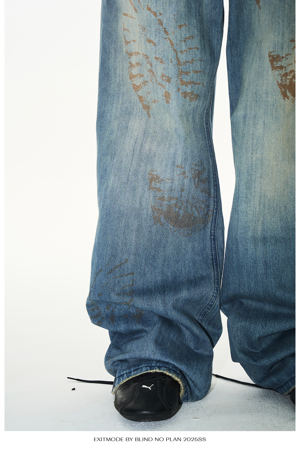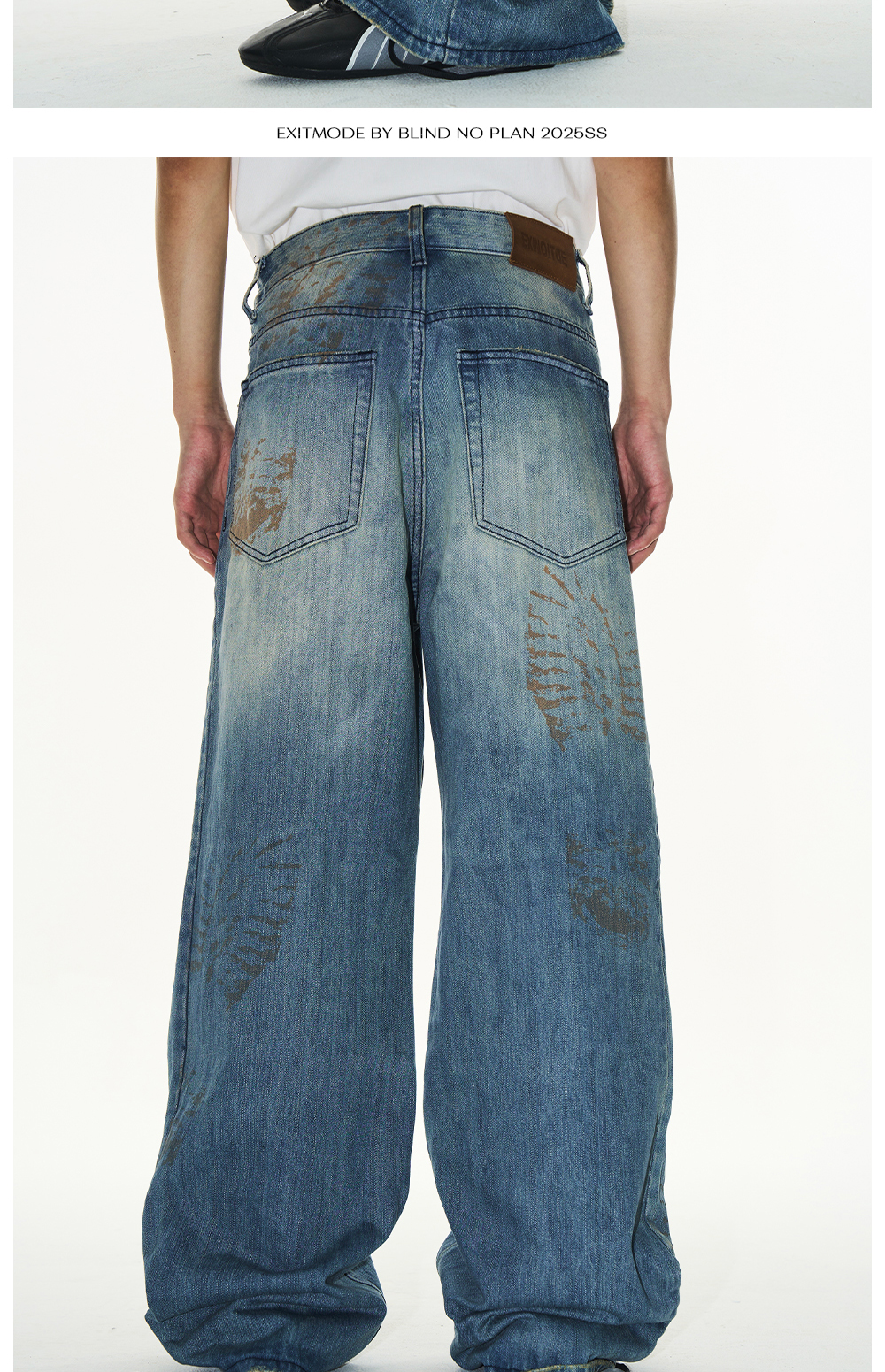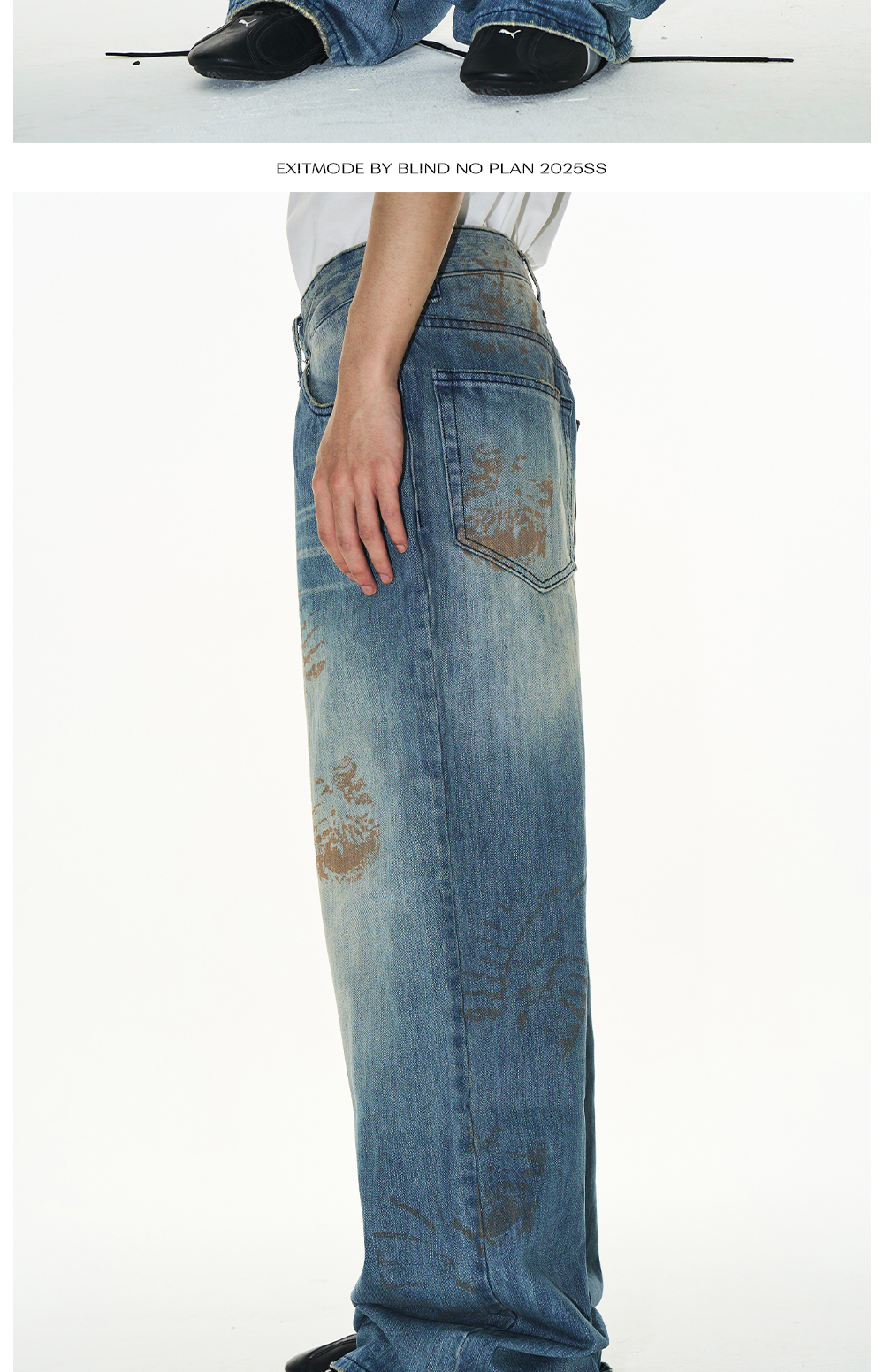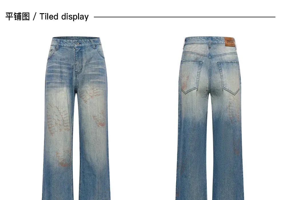 Design Details: These loose-fit jeans feature a washed effect combined with handmade whiskering for a natural worn look. The standout detail is the footprint print, created using digital spray technology, adding a unique and innovative visual appeal.