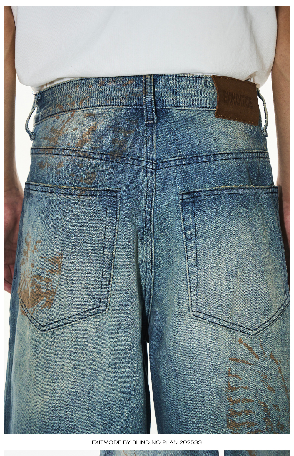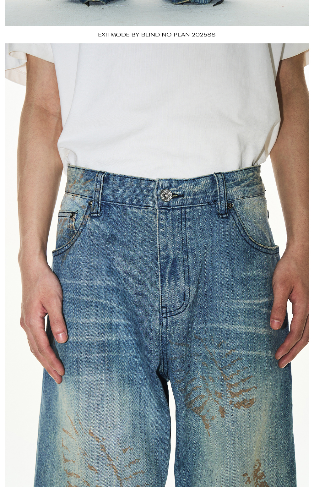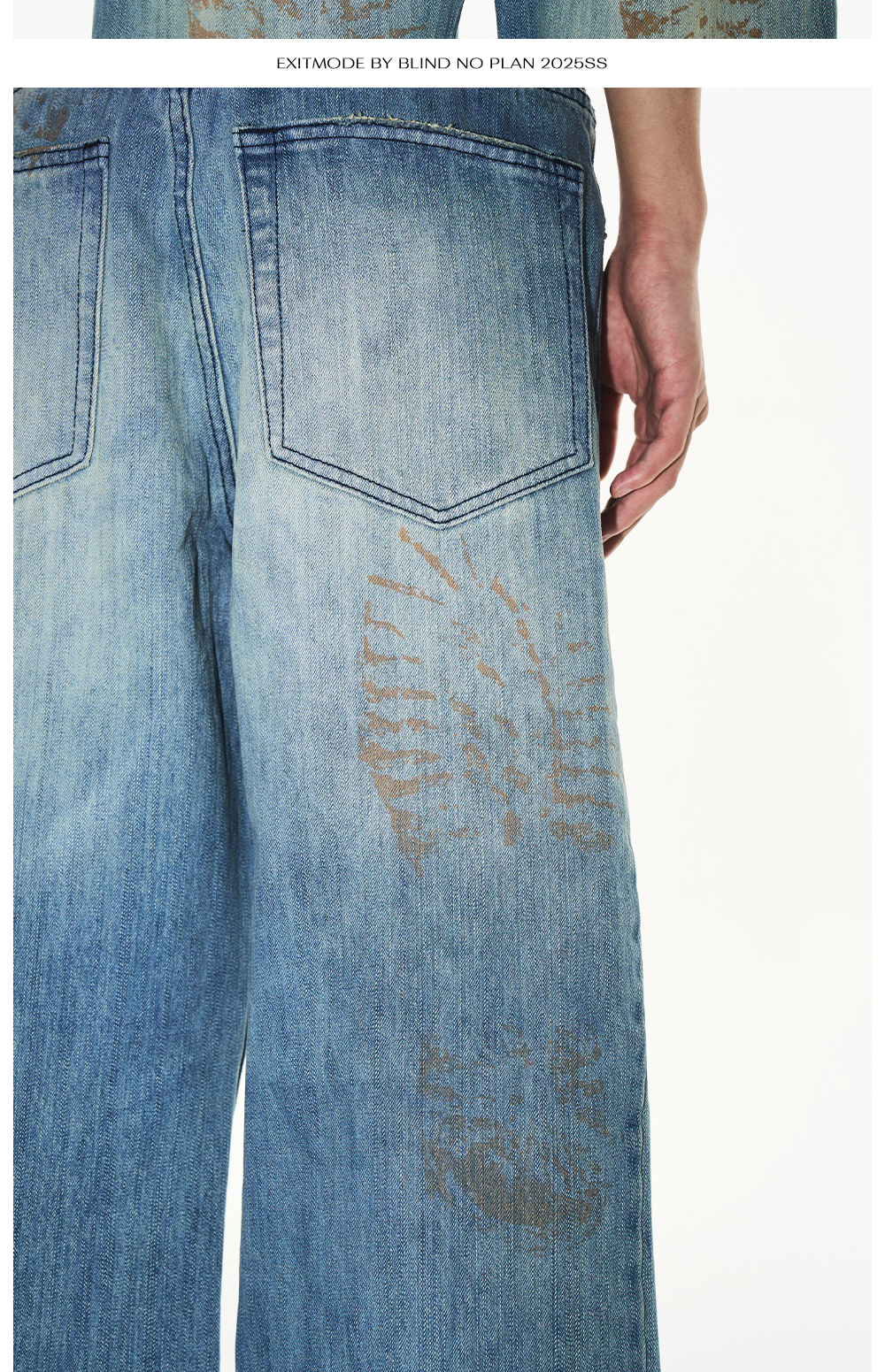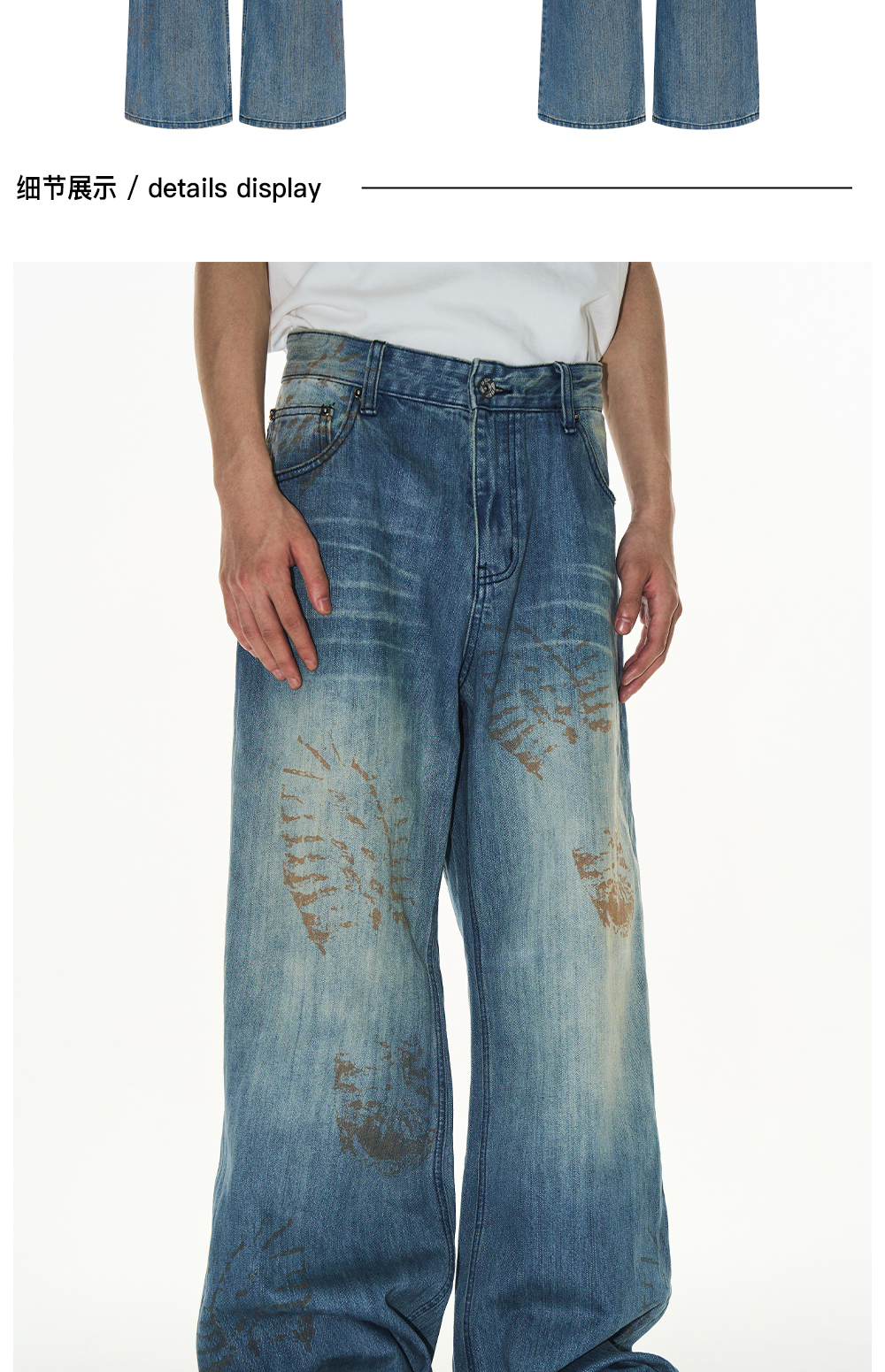 Design Details: These loose-fit jeans feature a washed effect combined with handmade whiskering for a natural worn look. The standout detail is the footprint print, created using digital spray technology, adding a unique and innovative visual appeal.