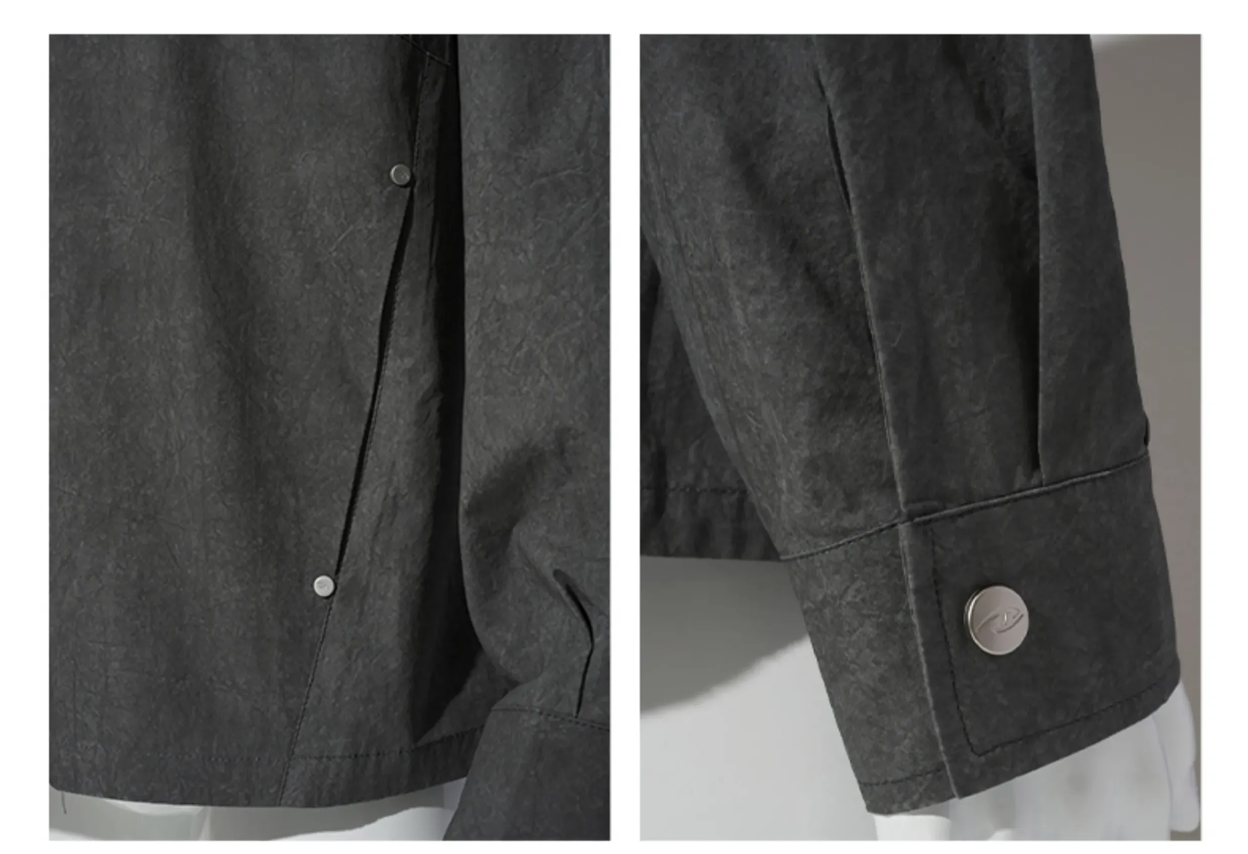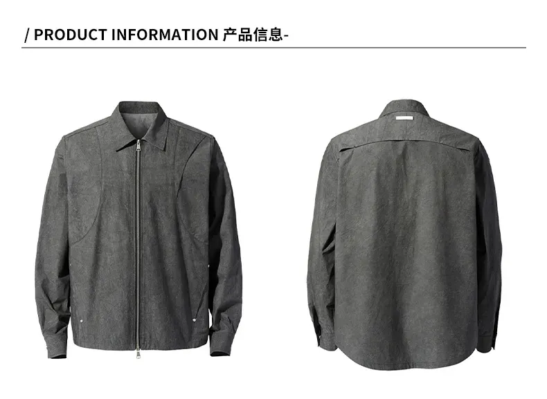 - The signature piece from the Frost Collection uses premium cotton yarn as its base, treated with textured ice-dyeing to create subtle crackle-patterned veining. Straddling the line between jacket and shirt, it features a shortened front and curved back hem with slightly enlarged chest measurements for subtle volume. Custom metallic silver corn-tooth brass zipper with dual sliders offers smooth adjustment. Symmetrical articulated paneling and a dramatic floating back panel create visual impact. Rendered in gray tones with silver hardware, it layers effortlessly as both outerwear and mid-layer—a versatile spring-summer essential.