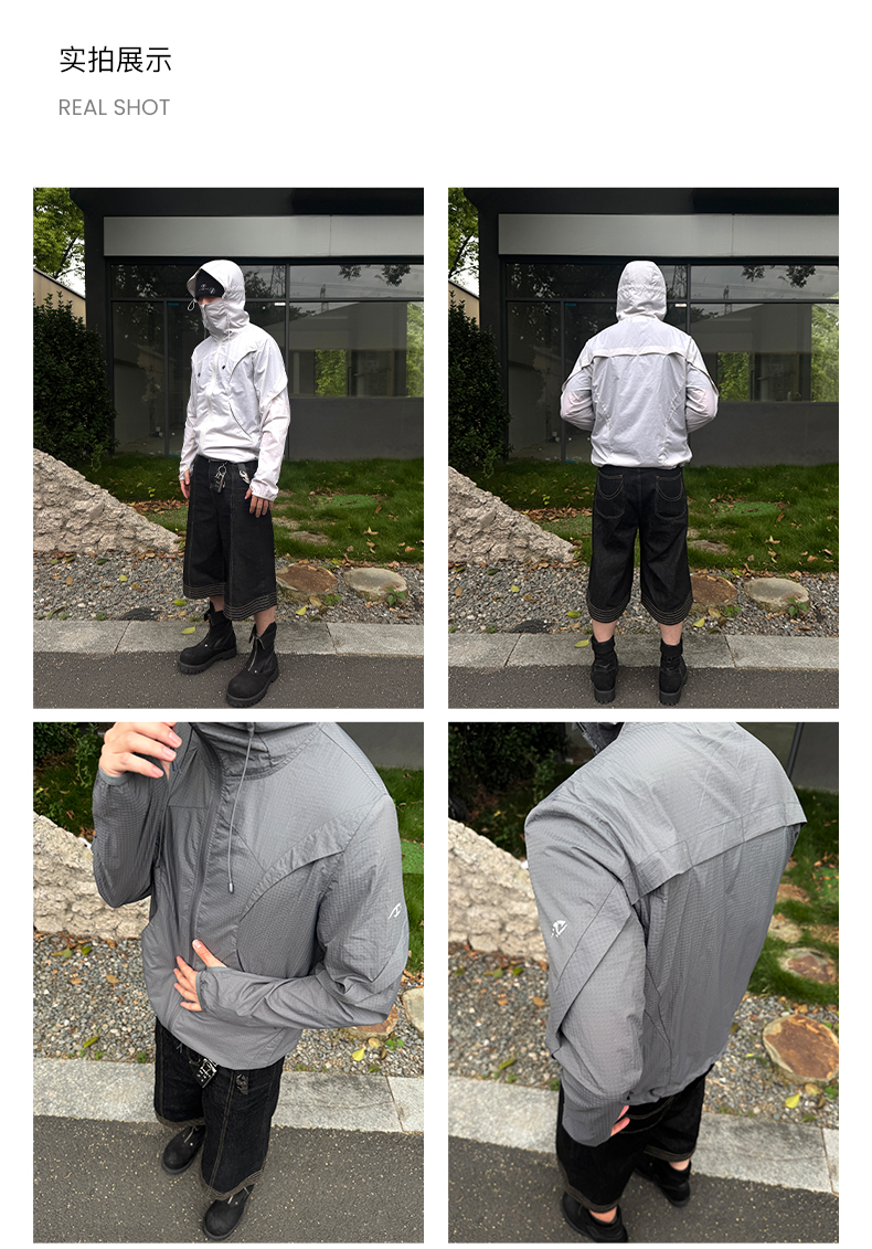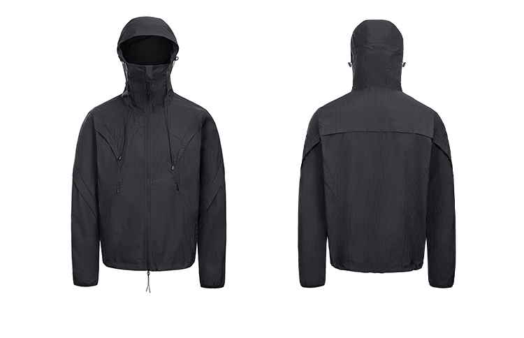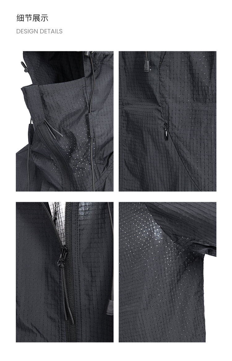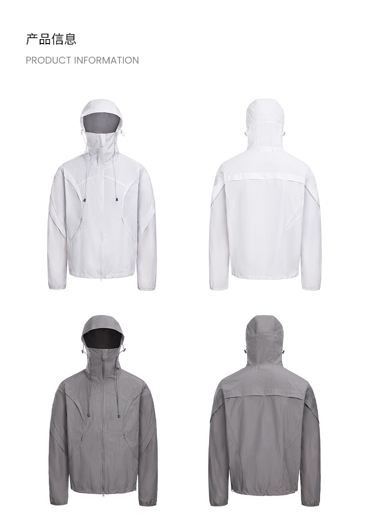 In neutral base colors that resist dirt and pair effortlessly with any outfit, this jacket boasts UPF 50+ sun protection. The lightweight nylon fabric feels soft and burden-free against the skin, with excellent moisture-wicking properties that absorb sweat and keep you cool in high temperatures, preventing any stuffy or muggy sensation. Highly abrasion-resistant, it handles intense outdoor activities like hiking and trekking without stress—resists deformation, dries quickly after washing, and requires minimal maintenance.Continuing the artistic beauty of loose-leaf panel cutting with upgraded refinements. The double-ended zipper allows free opening from top or bottom, forming ventilation triangles (open for rapid heat release, closed for wind and sun blocking), complete with a chin guard to prevent pinching. Integrated stand collar and hood (with elastic drawcord and ventilation holes) deliver full-coverage protection: front laser-perforated vents on the stand collar eliminate stuffiness, while the hood drawcord tightens the brim for "zero dead-angle sun defense" from chin to nape. Inward-curved seams combined with loose panel tailoring create dynamic contouring—curved lines from armholes to waist sides, paired with underarm laser ventilation, enhance air circulation and dramatically boost arm mobility; hidden zipper pockets below the seams offer secure storage without disrupting the streamlined look. Ninja sleeves with gusseted armholes prevent fabric ride-up during overhead movements, while elastic cuffs seal the wrists to block UV penetration through gaps. Large rear ventilation panel accelerates sweat evaporation, and the adjustable hem drawcord allows tightening for wind resistance (ideal for cycling) or loosening as needed.