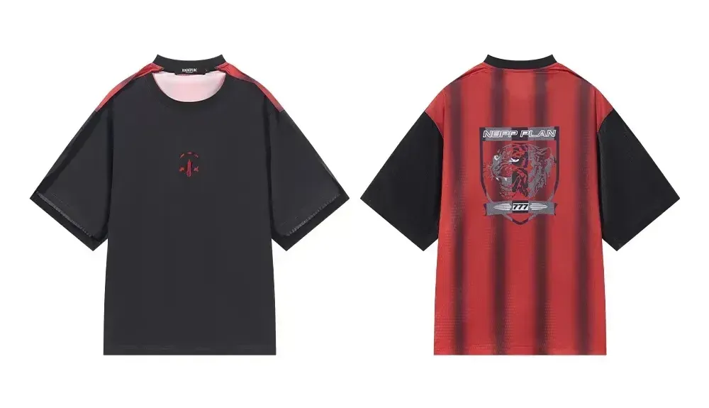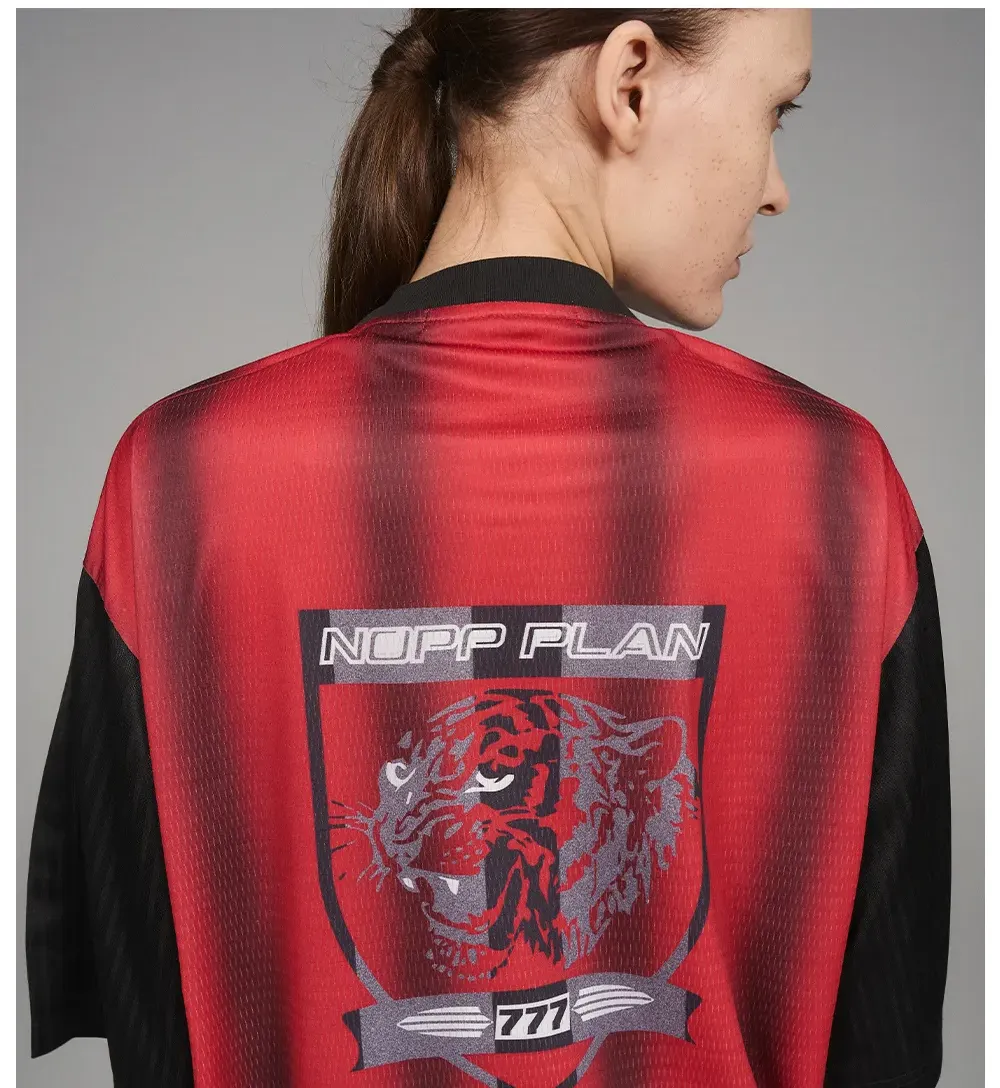Design Details: This loose-fit shirt combines contrasting color stitching with gradient stripes, reinterpreting traditional tennis jersey aesthetics. The gradient embroidered logo adds a dynamic and modern visual effect, balancing sport-inspired style with casual versatility.