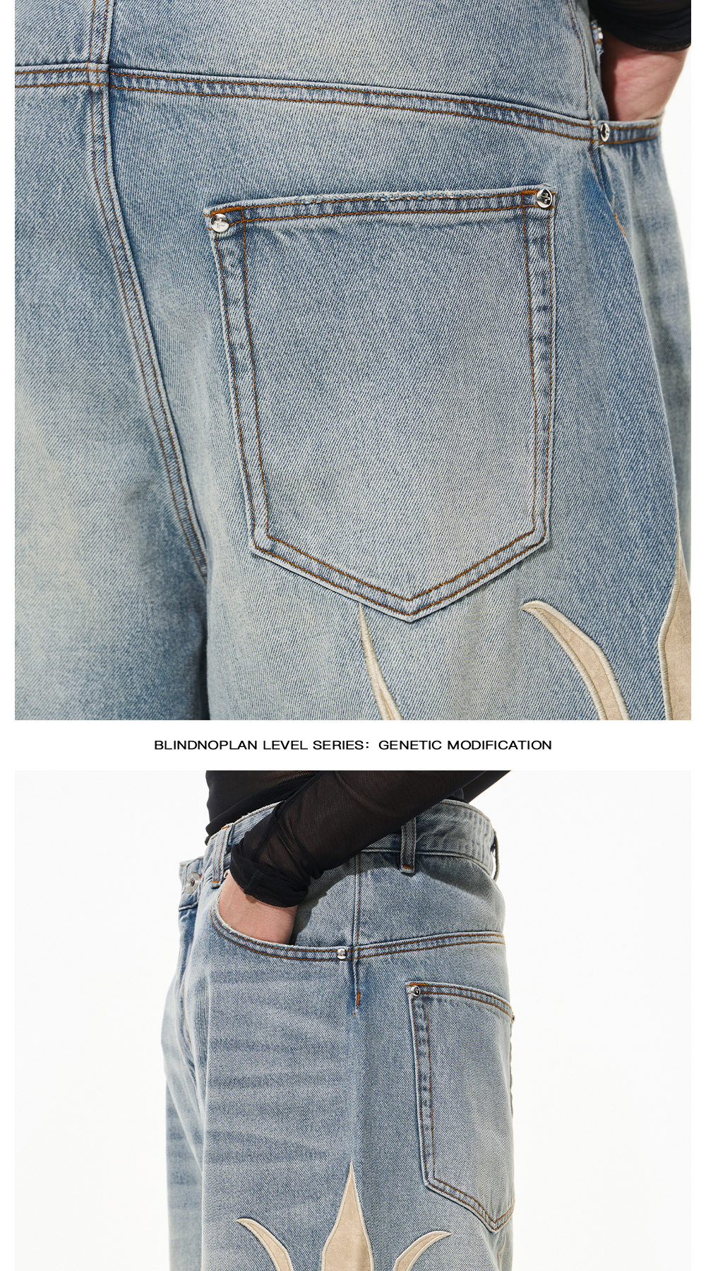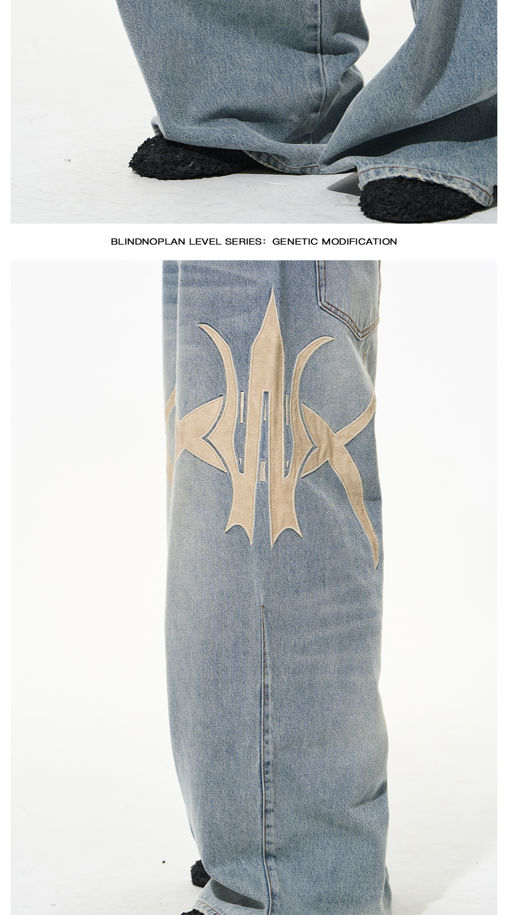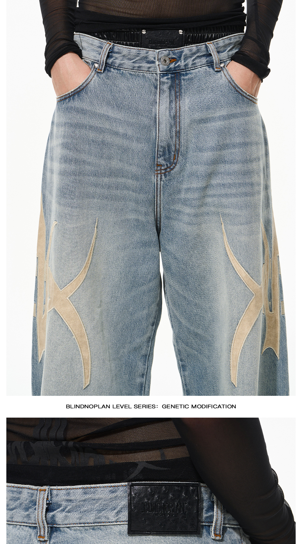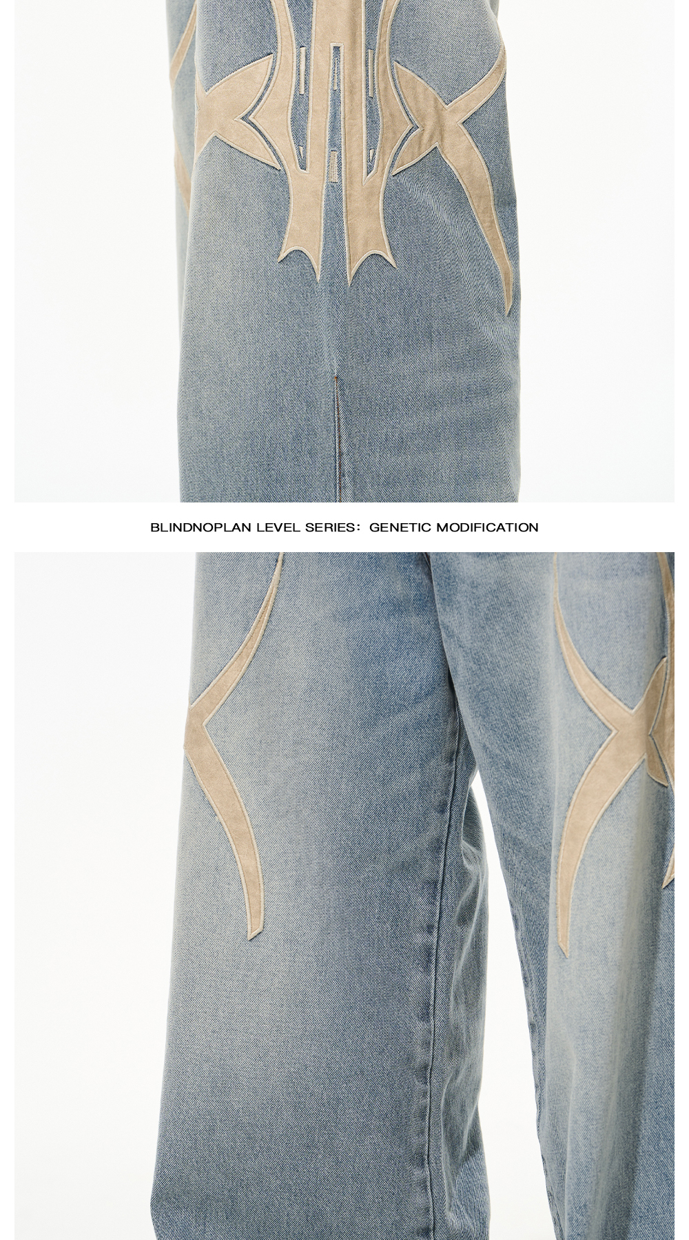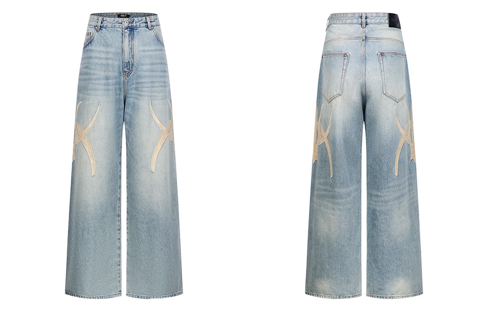 Design Details: The pants are designed with patchwork embroidery and handmade cat whisker effect. Theoverall design is done with old water washing technology, and the pockets and ankles areslightly worn out, adding details.Made from 100% cotton, these jeans are durable and breathable. The washed effect, combined with graphic logo patches and embroidery, adds a unique and stylish touch.