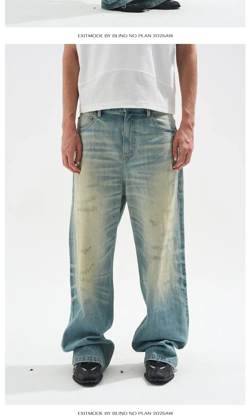 - These jeans feature a washed blue finish with a faded yellow effect, combined with distressed details and handcrafted whisker techniques, creating a simple yet versatile style.
