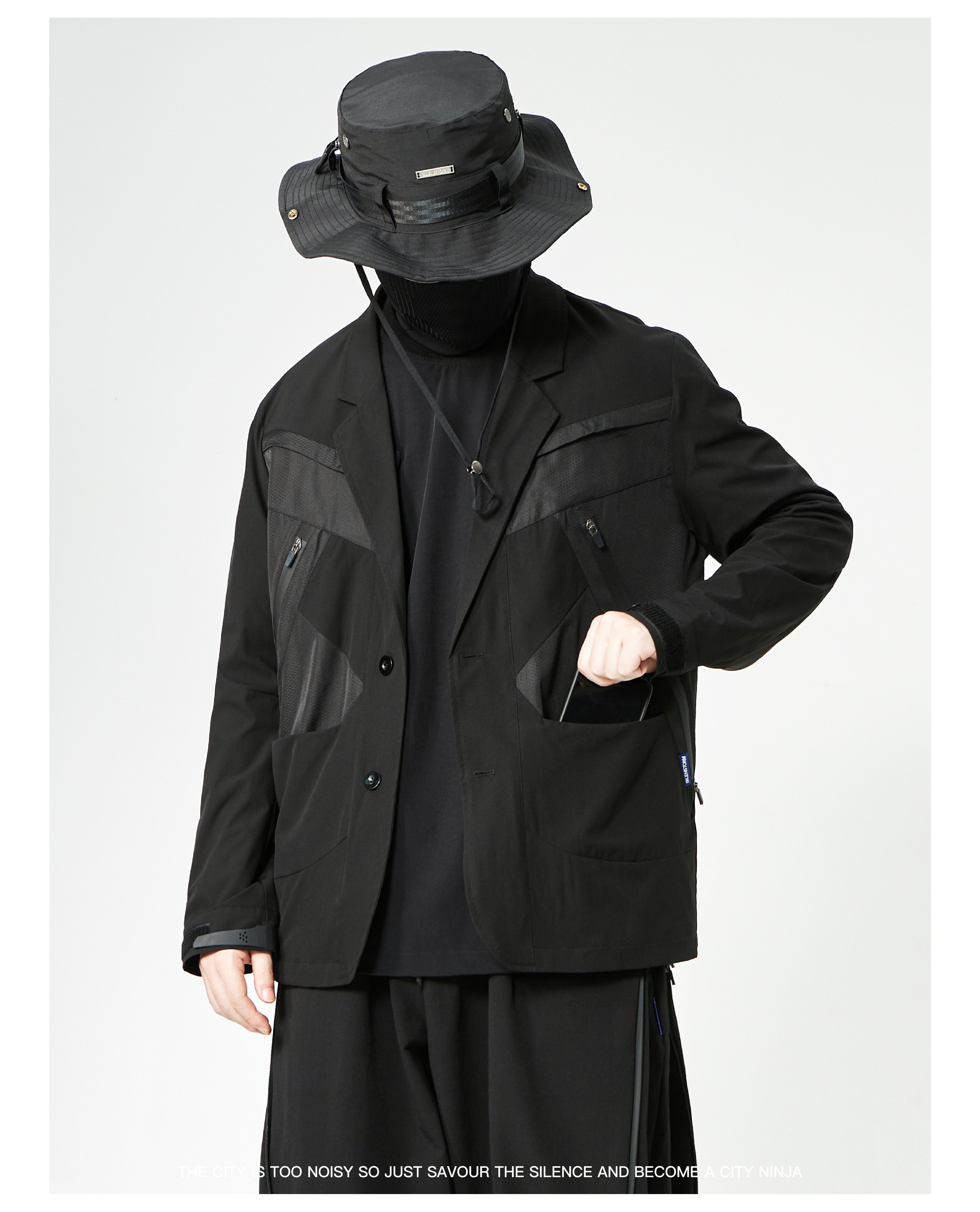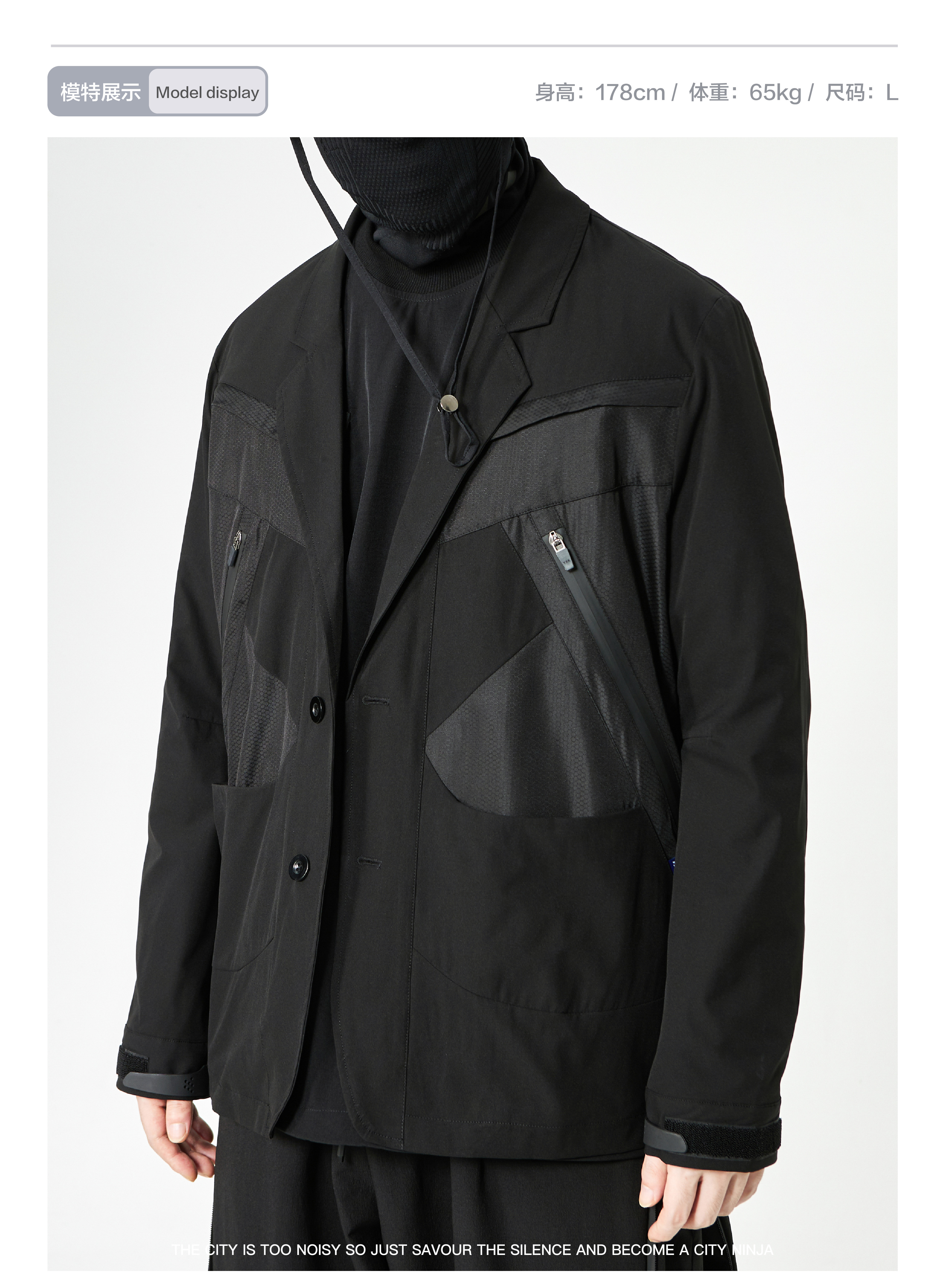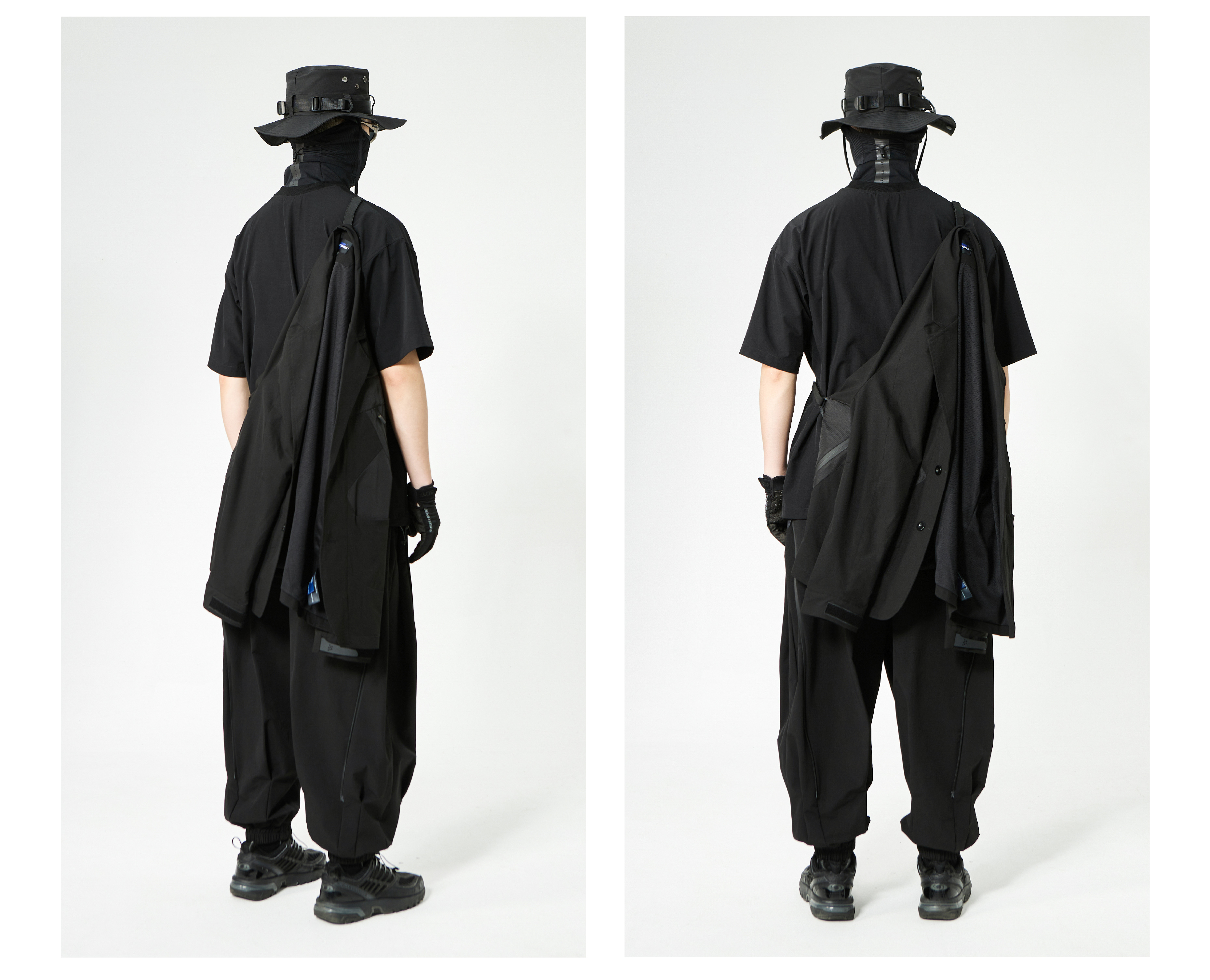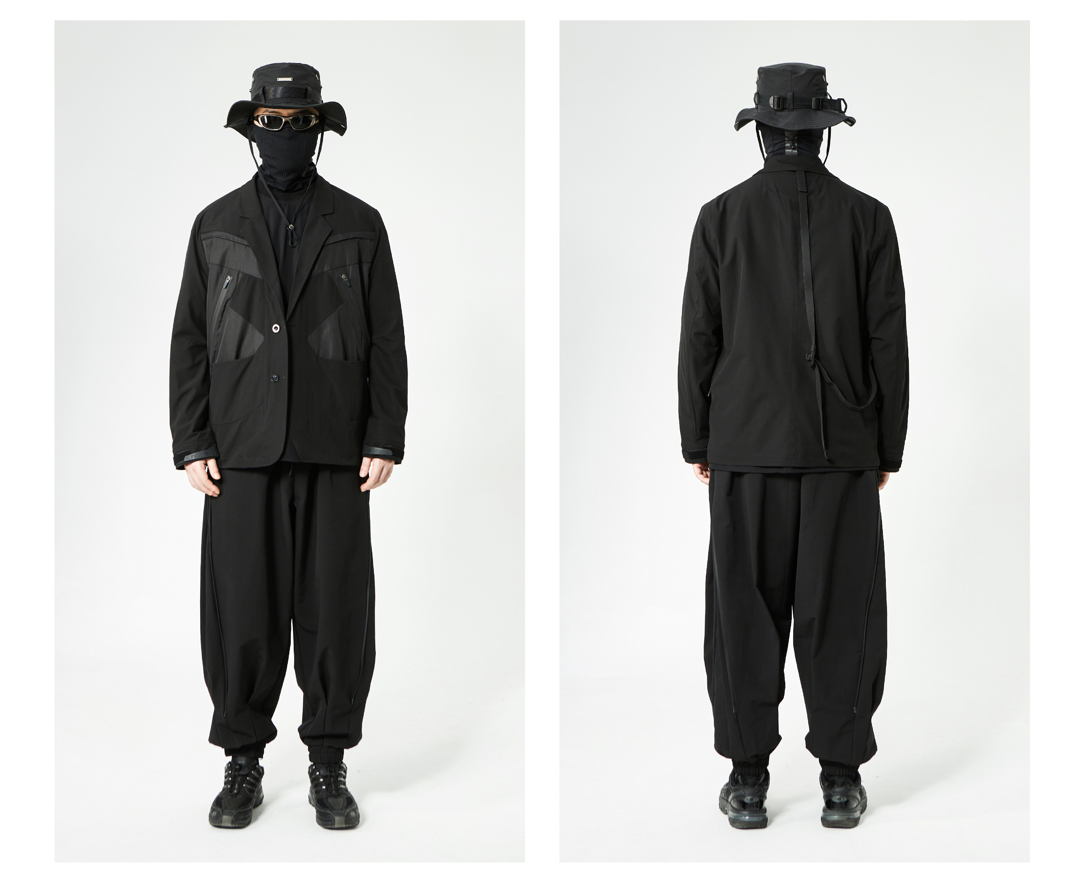 - This suit integrates a functional harness-inspired design with tailored construction for a modern urban-tech aesthetic. The spliced panels create visual depth and contrast, while maintaining a structured and comfortable fit. Designed to merge formal wear with functional streetwear elements, the suit is suitable for dynamic, style-conscious environments.