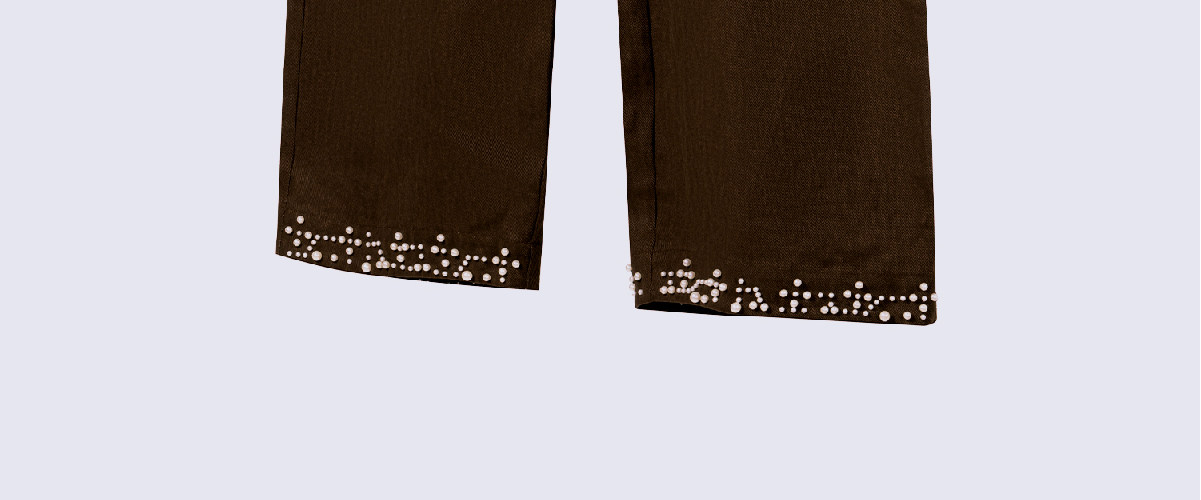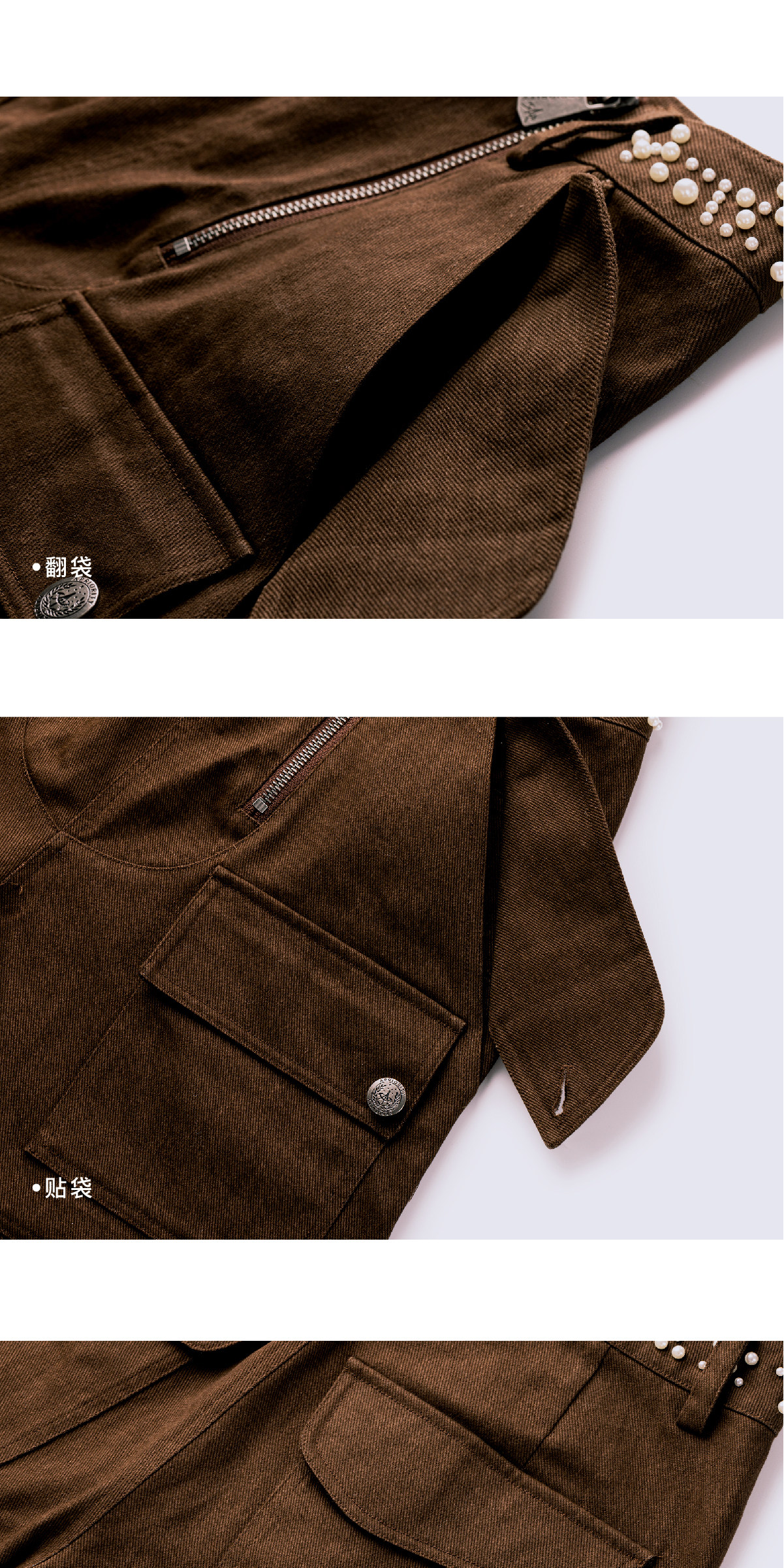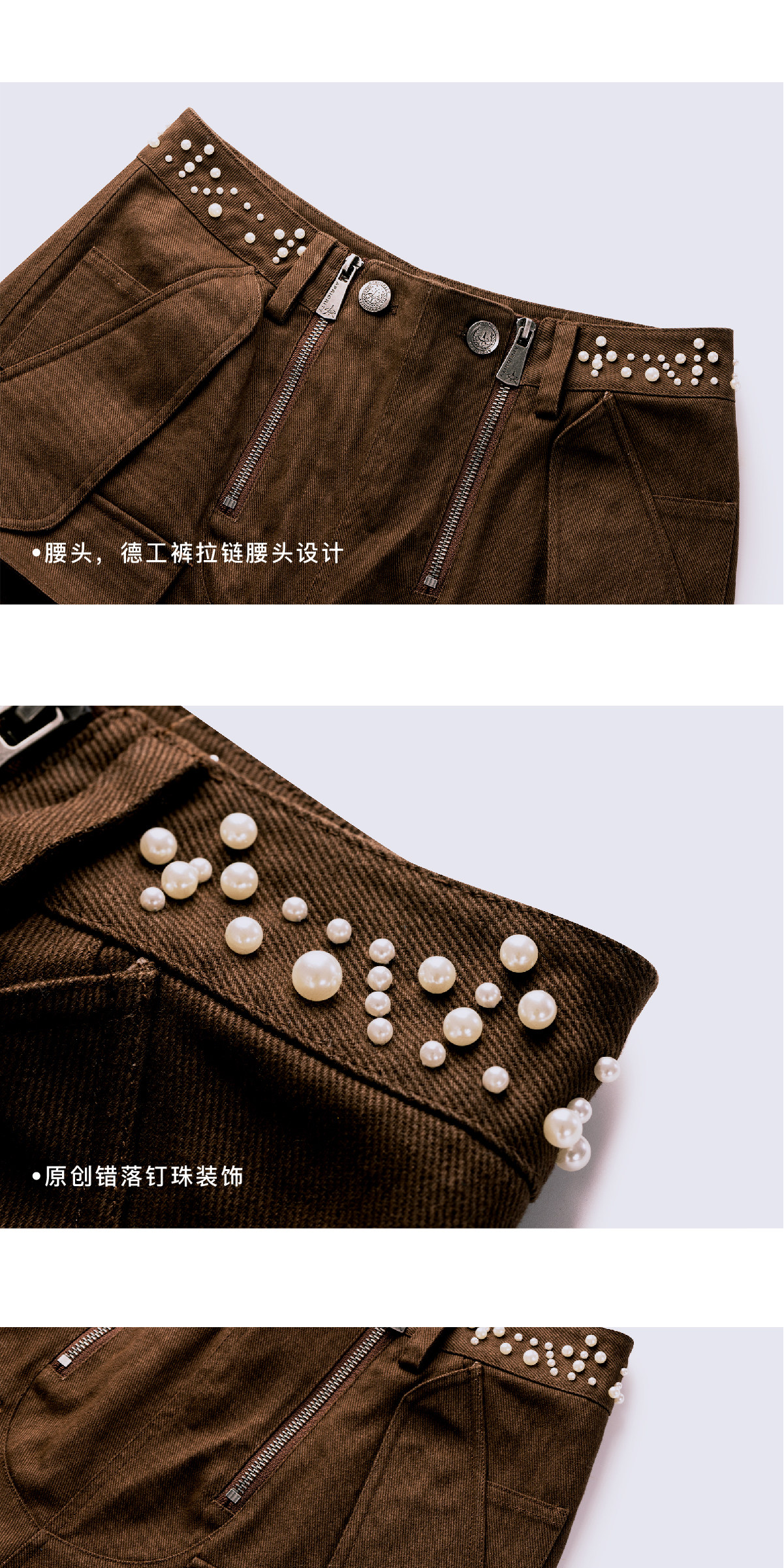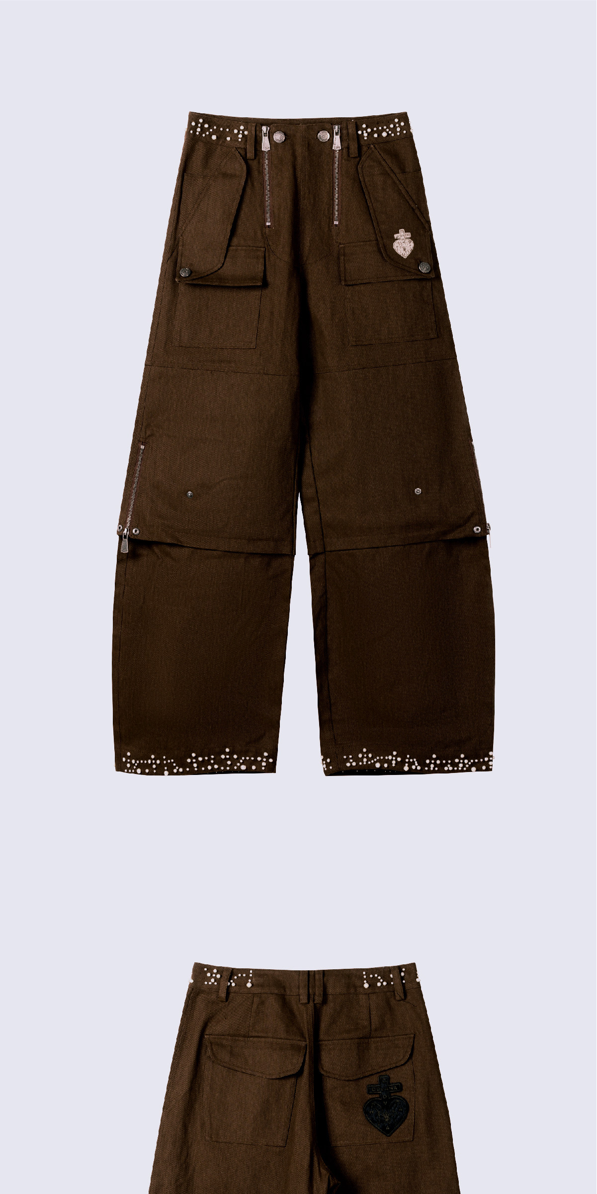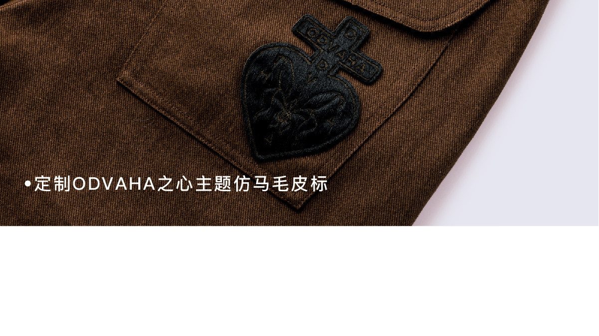 Design Details: Made from 100% cotton washed twill fabric. Features sewn ODVAHA Heart horsehair leather patch, original ODVAHA Heart theme print, irregular scattered pearl bead decoration at waistband and hem, custom metal buckle pocket design, and a calf zipper opening with flap decorative structure.