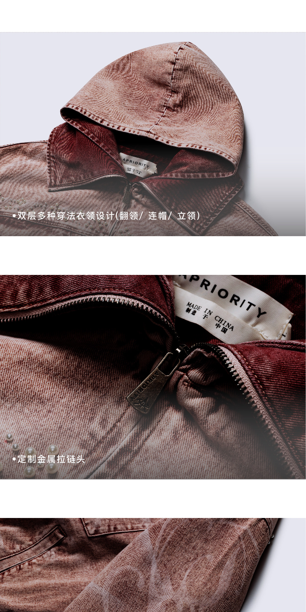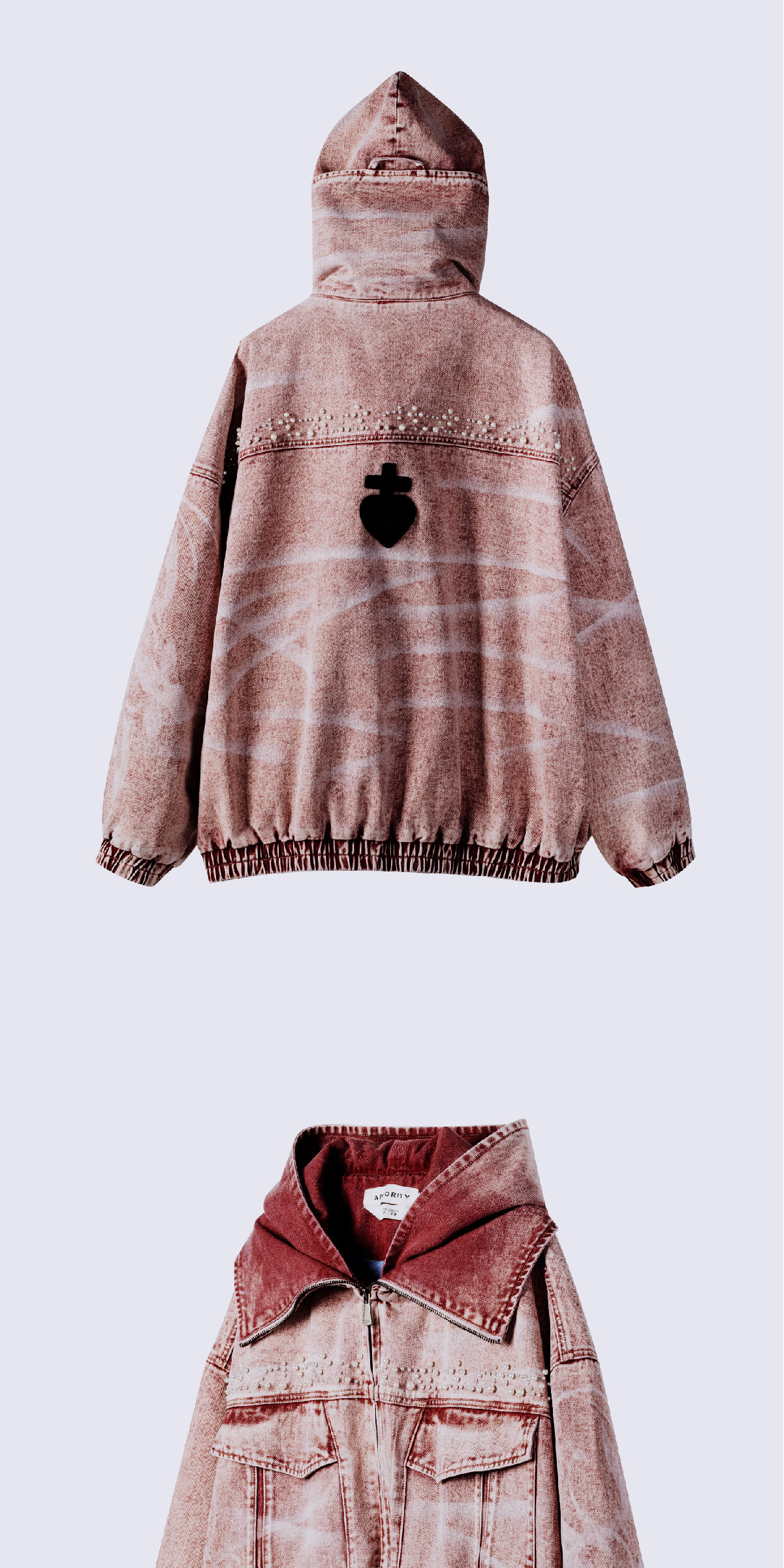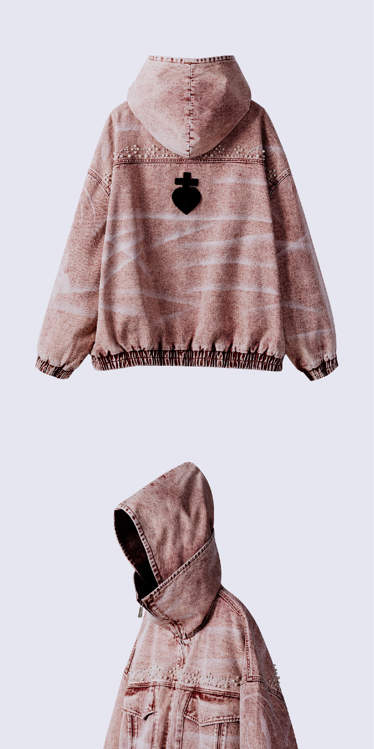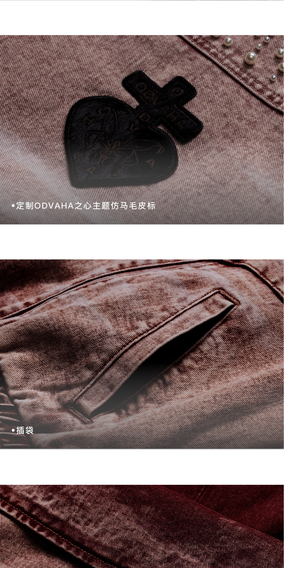 Design Details: Made from high-quality Xinjiang cotton blend denim fabric with rich texture. Features original irregular scattered pearl bead decoration across the body, original design prints on left sleeve and right body using laser-burned flower technique, full garment enzyme wash finish, elastic hem and cuffs for enhanced inclusivity, custom ODVAHA Heart horsehair leather patch sewn on the back, custom metal zipper pull, chest patch pocket tailoring, and multi-wear double-layer collar design.