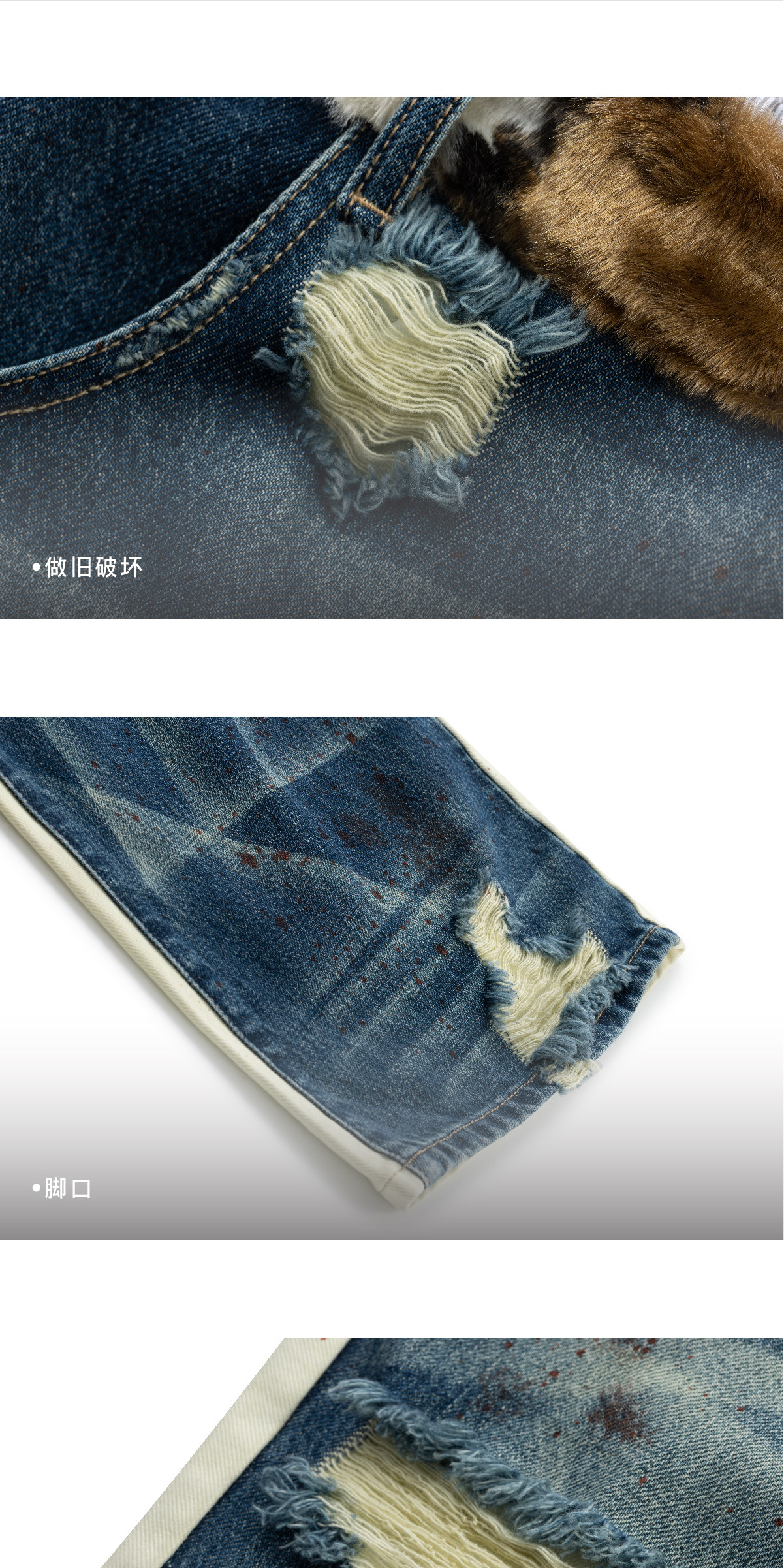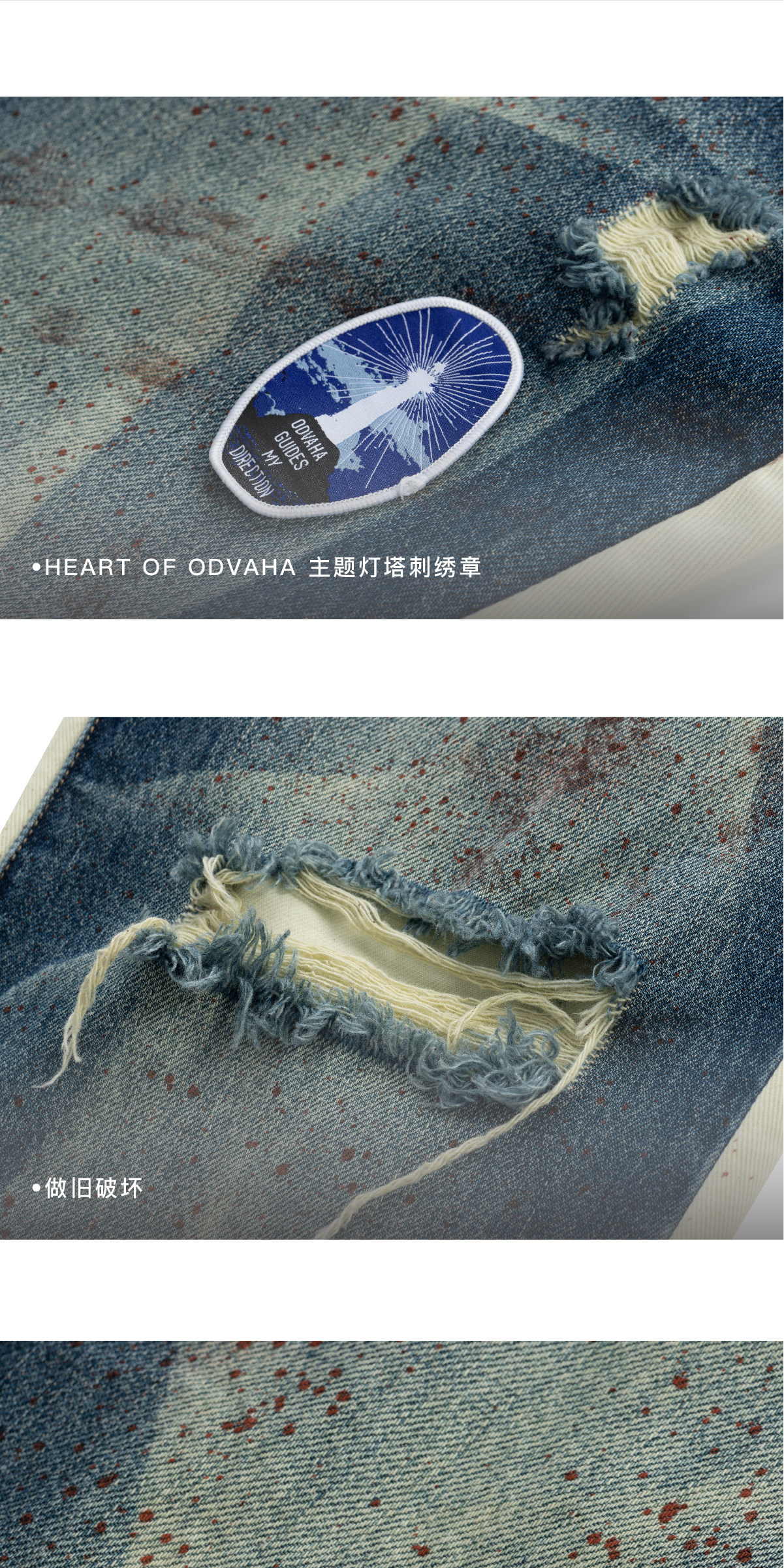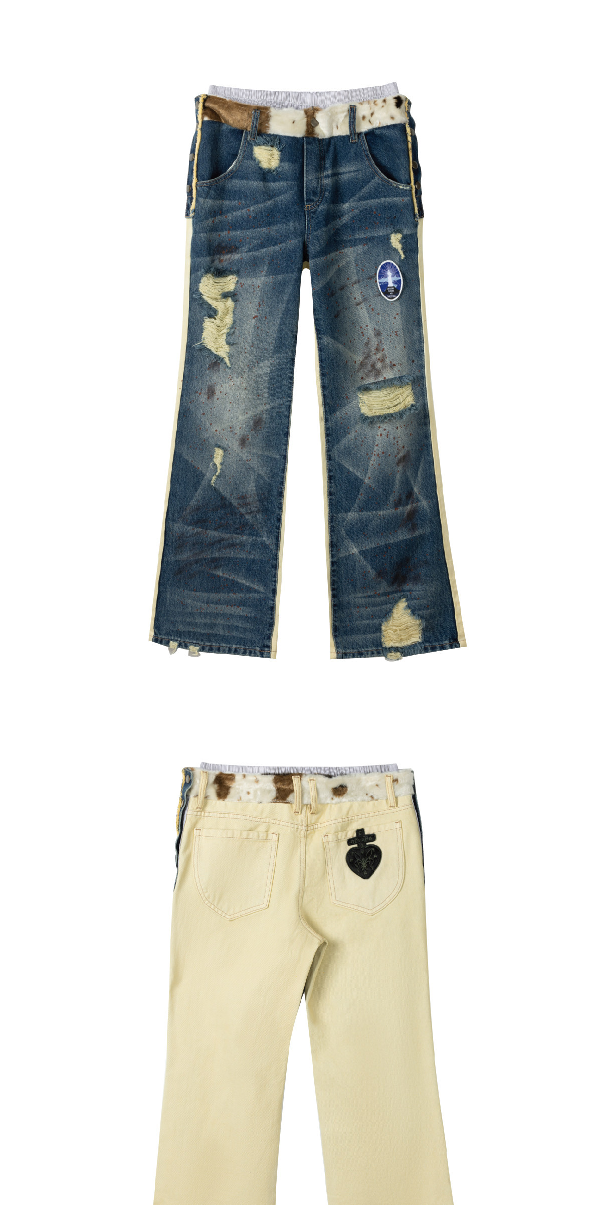 Design Details: Denim treated with washes, spray dyeing, and layered wash techniques for a vintage aesthetic. Extensive hand-distressing throughout. Panels of cow-print eco-friendly faux fur at waistband. Custom horse leather patch featuring the Heart of ODVAHA motif sewn at back waist. Faux two-layer waistband design with internal striped elastic waistband. Original "HEARTOFODVAHA" lighthouse-themed embroidered patch sewn on thighs. Side slits at waistband secured with 8 YKK aged bronze metal buttons. Fly closure with YKK aged bronze metal buttons. Dual-sided fabric paneling creates a visually slimming effect on the front.