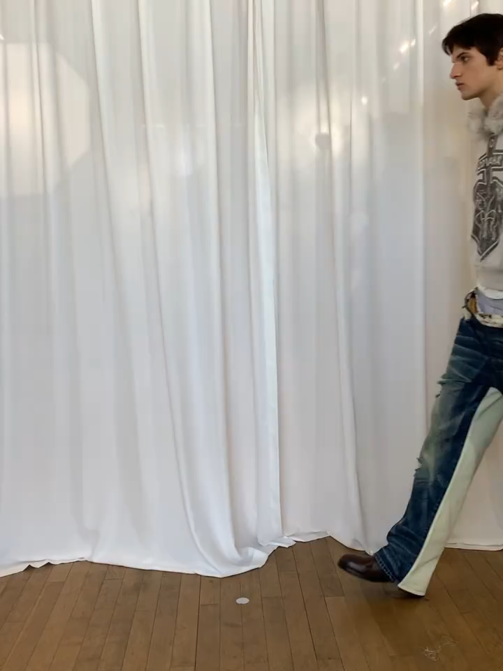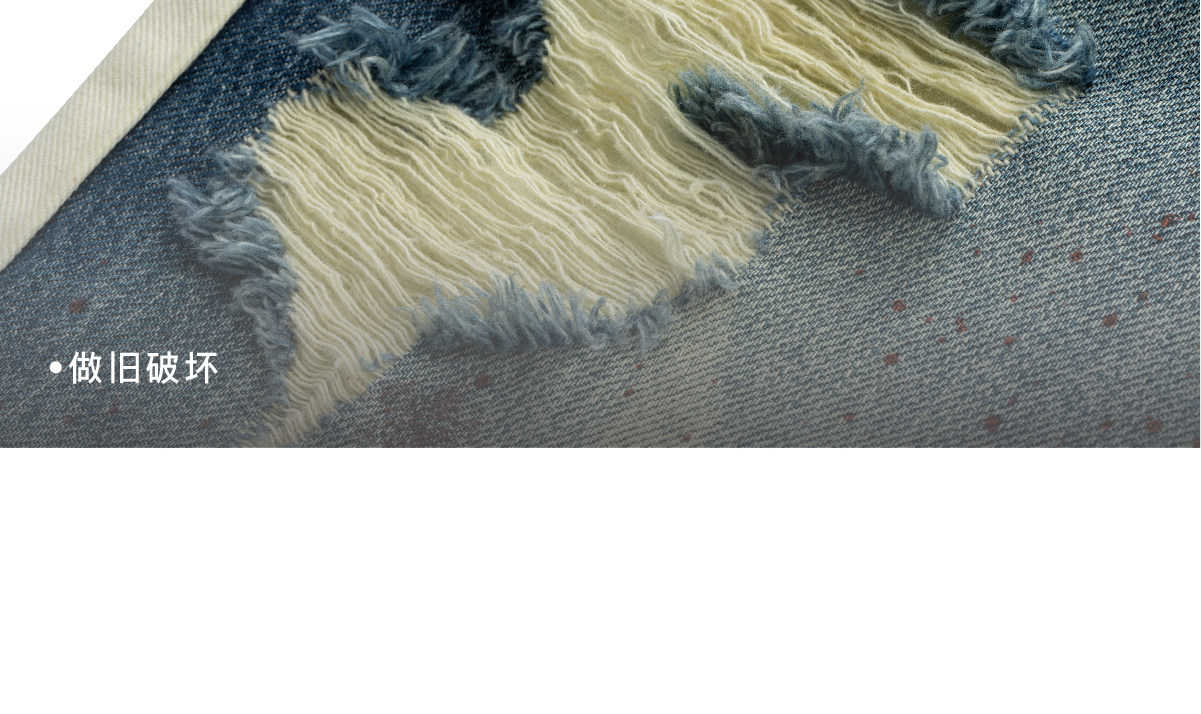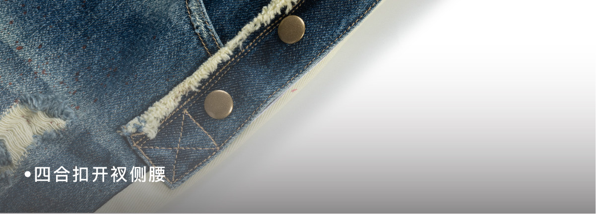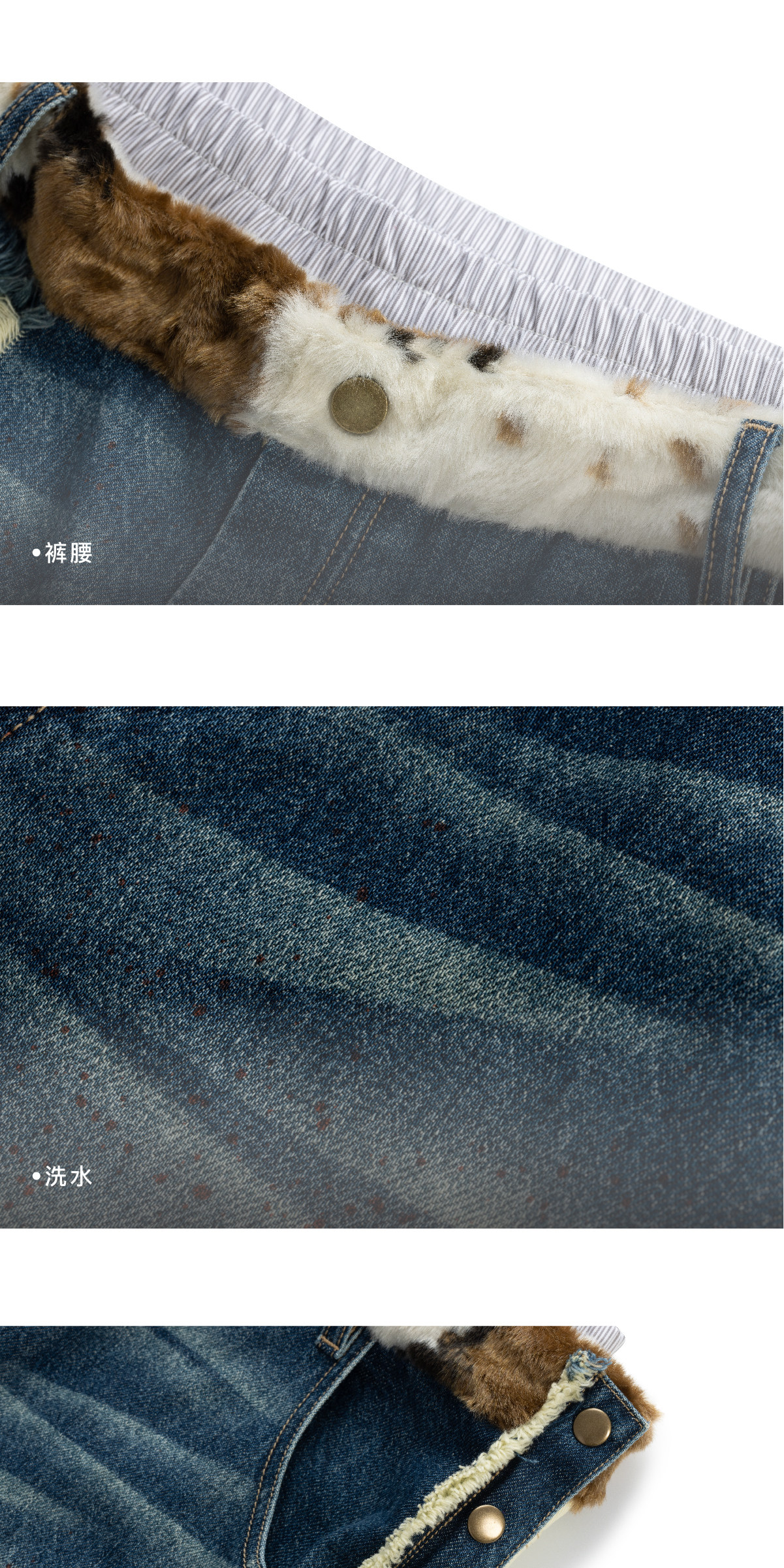 Design Details: Denim treated with washes, spray dyeing, and layered wash techniques for a vintage aesthetic. Extensive hand-distressing throughout. Panels of cow-print eco-friendly faux fur at waistband. Custom horse leather patch featuring the Heart of ODVAHA motif sewn at back waist. Faux two-layer waistband design with internal striped elastic waistband. Original "HEARTOFODVAHA" lighthouse-themed embroidered patch sewn on thighs. Side slits at waistband secured with 8 YKK aged bronze metal buttons. Fly closure with YKK aged bronze metal buttons. Dual-sided fabric paneling creates a visually slimming effect on the front.