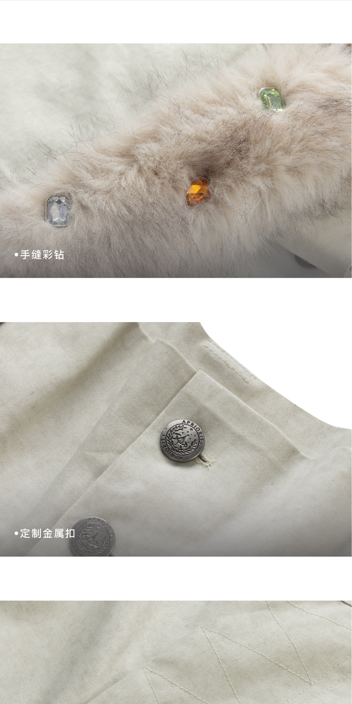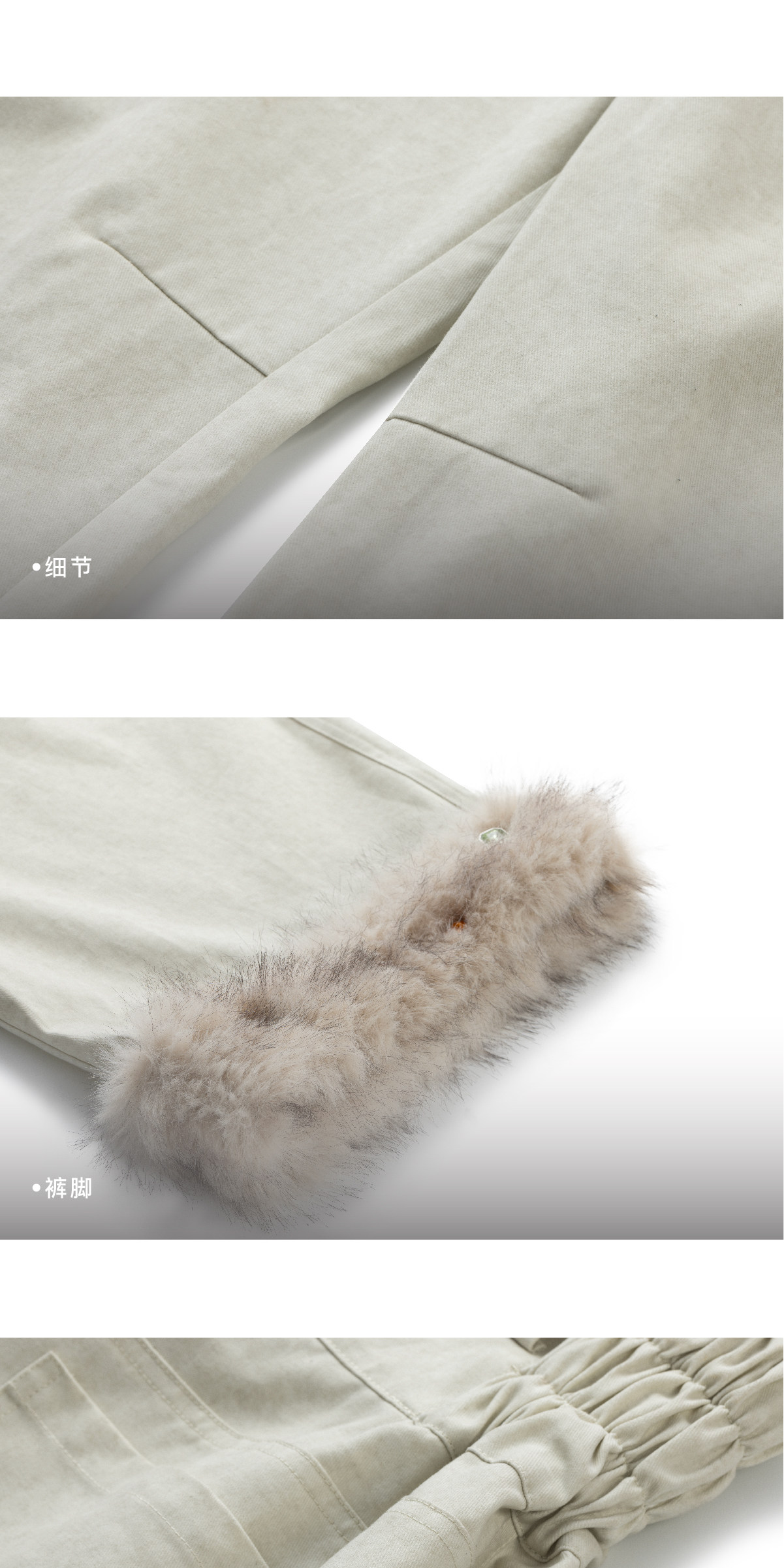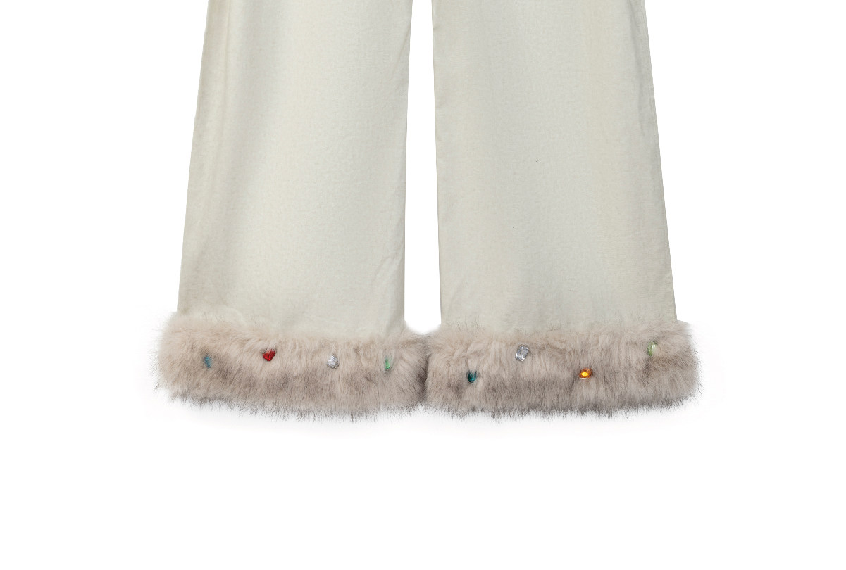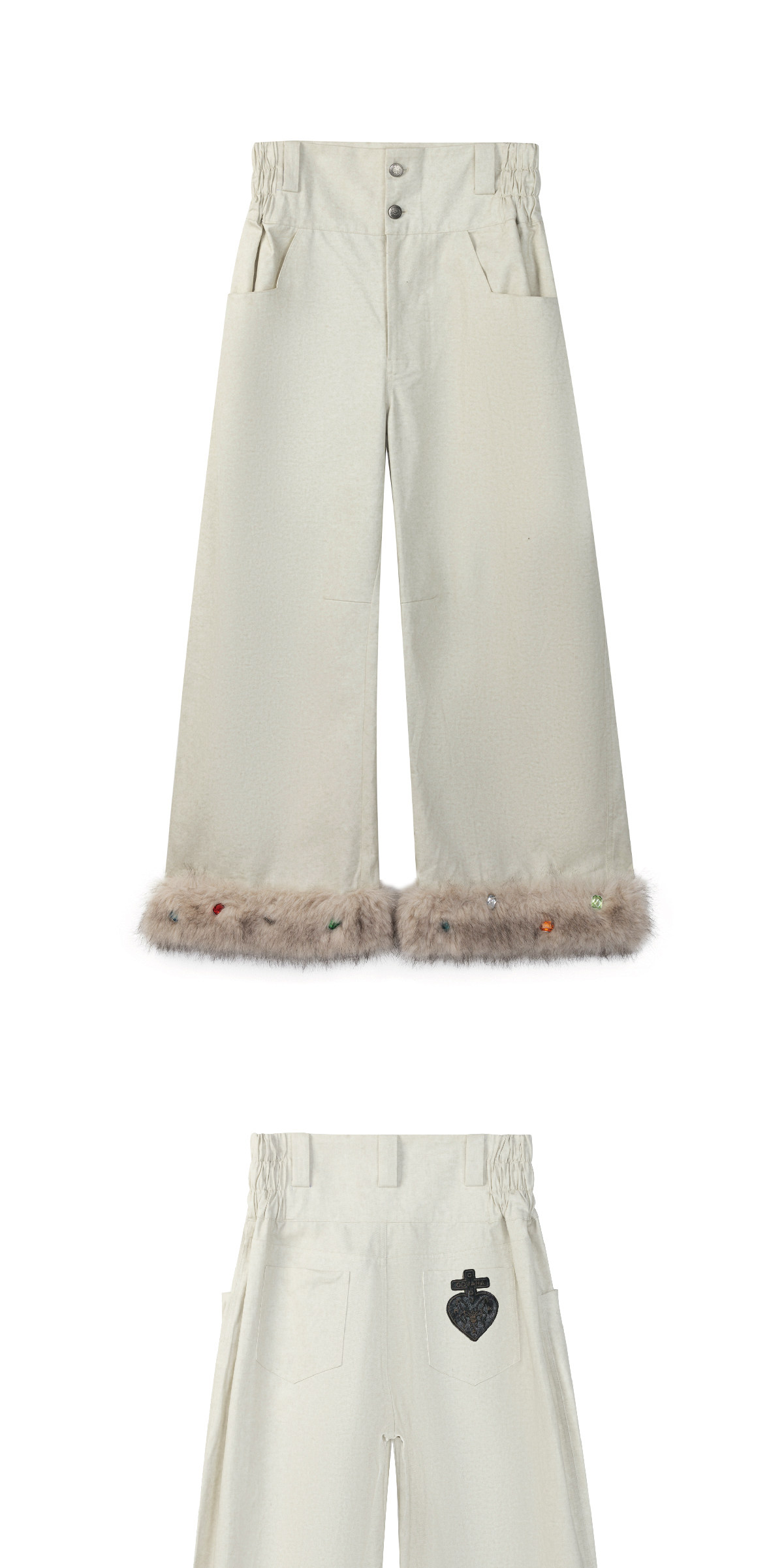 Design Details: Crafted from 250g 100% combed cotton twill fabric with garment-dyed and distressed finish. Faux wolf fur hem detailing (symbolizing "mud/struggle") adorned with hand-sewn crystal embellishments (symbolizing "spiritual wealth"). High-rise elasticized waist on both sides for inclusive fit. Decorative stitched seam detailing at fly closure secured with two custom metal buttons. Angled pocket design.