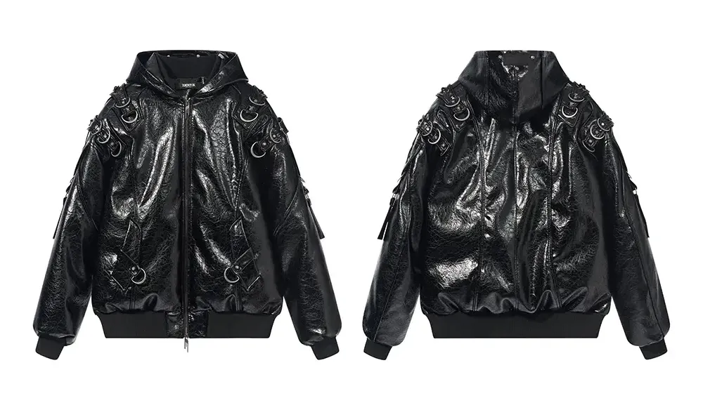 Design Details: Cracked leather fabrics are used, the body is split and spliced with biker line design, and metalrings and rivets are added to increase the overall sense of heavy industry.