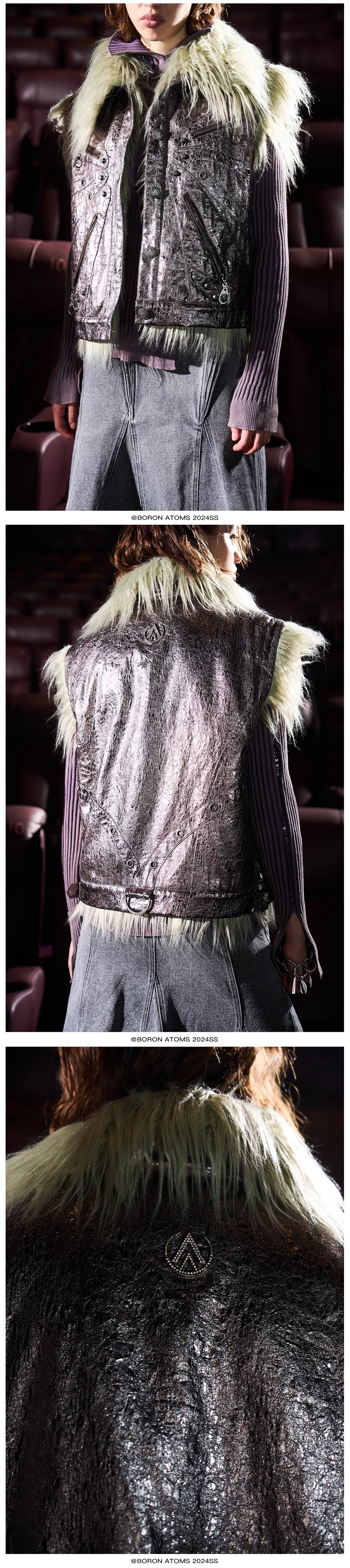 - This piece incorporates a unique crinkle-textured fabric and is designed with motorcycle elements. The front closure features custom distressed buttons adorned with metal accessories, while the back collar is embellished with a custom rhinestone metal tag in a contrasting color. The inner lining is crafted from plush faux fur in a contrasting color, providing both aesthetic appeal and excellent warmth.