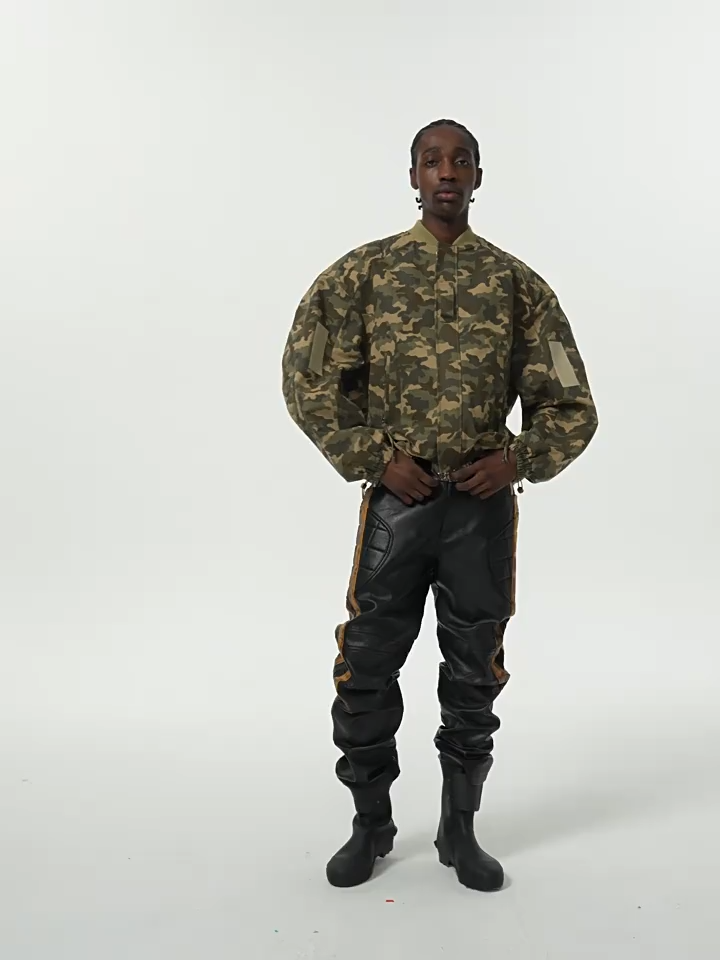 - Featuring an oversized silhouette with quilted stitching along the shoulders and sleeves for enhanced structure and volume. Strip quilting details add a rugged, moto-inspired touch, while hook-and-loop patches on the sleeves provide functional accents. The hem is finished with an elasticated cuff for a secure fit.