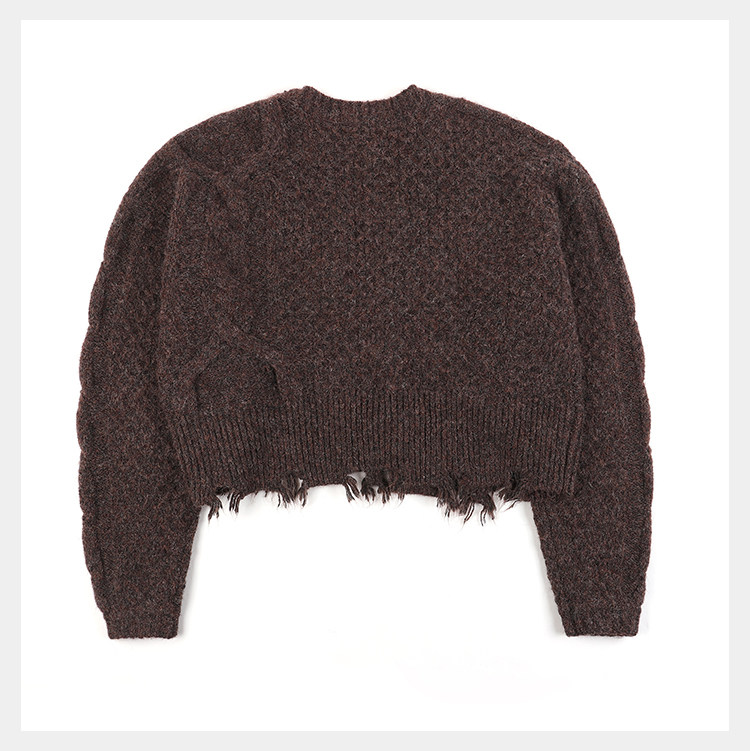 • Featuring an updated loose boxy silhouette with a richly textured knit design. The wool-blend, chunky knit construction delivers a substantial knit texture, while the cropped, wide cut and extended sleeves create a lazy silhouette and effortless feel. Combined with irregular hand-distressed detailing at the hem, the piece gains unique character and depth. Made from a premium wool blend that is den