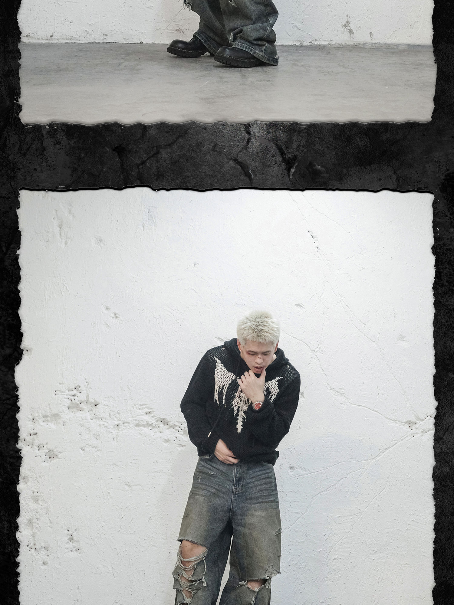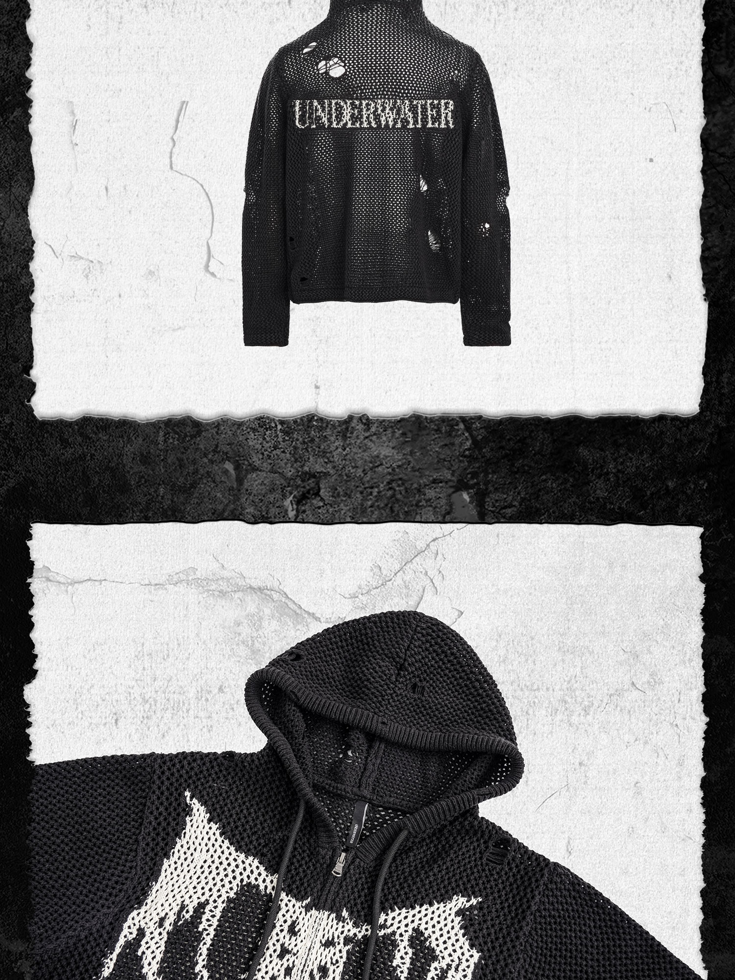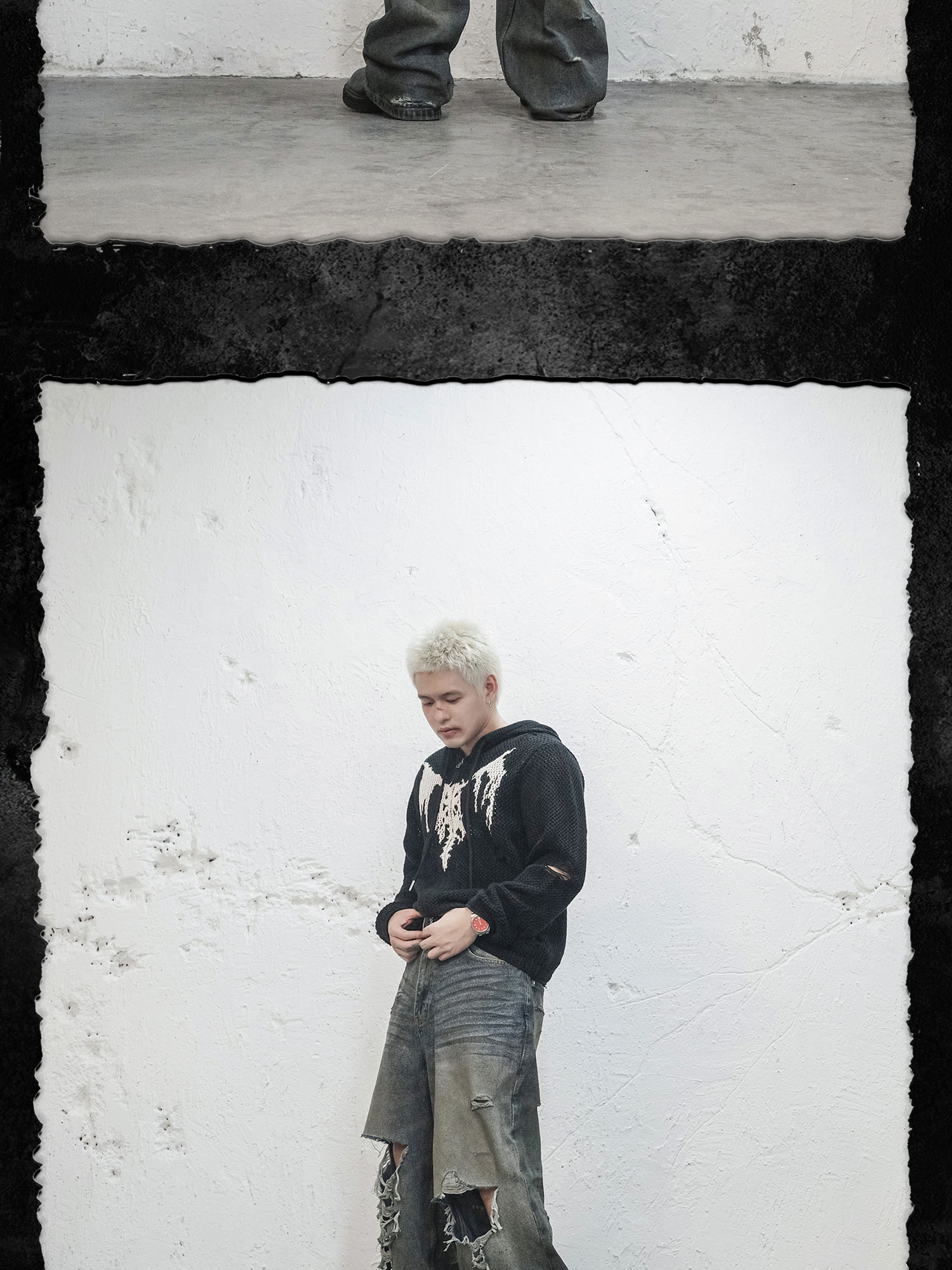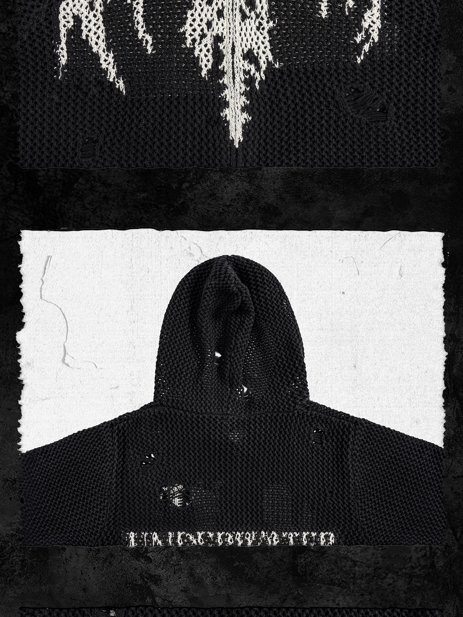 - Designed in a UW Boxy fit, this sweater features a soft, skin-friendly fabric that balances comfort with texture. Distressed details and claw-like rips slash across the garment, evoking the marks of demonic forces hidden within. The hood provides an enveloping sense of shelter, like a refuge lurking in the shadows. A bone motif jacquard emblazoned on the chest serves as a demonic insignia, while the back logo declares allegiance to the abyss. This piece embodies apocalyptic aesthetics of destruction and rebirth—an unmistakable dark battle robe that summons the spirit of rebellion.