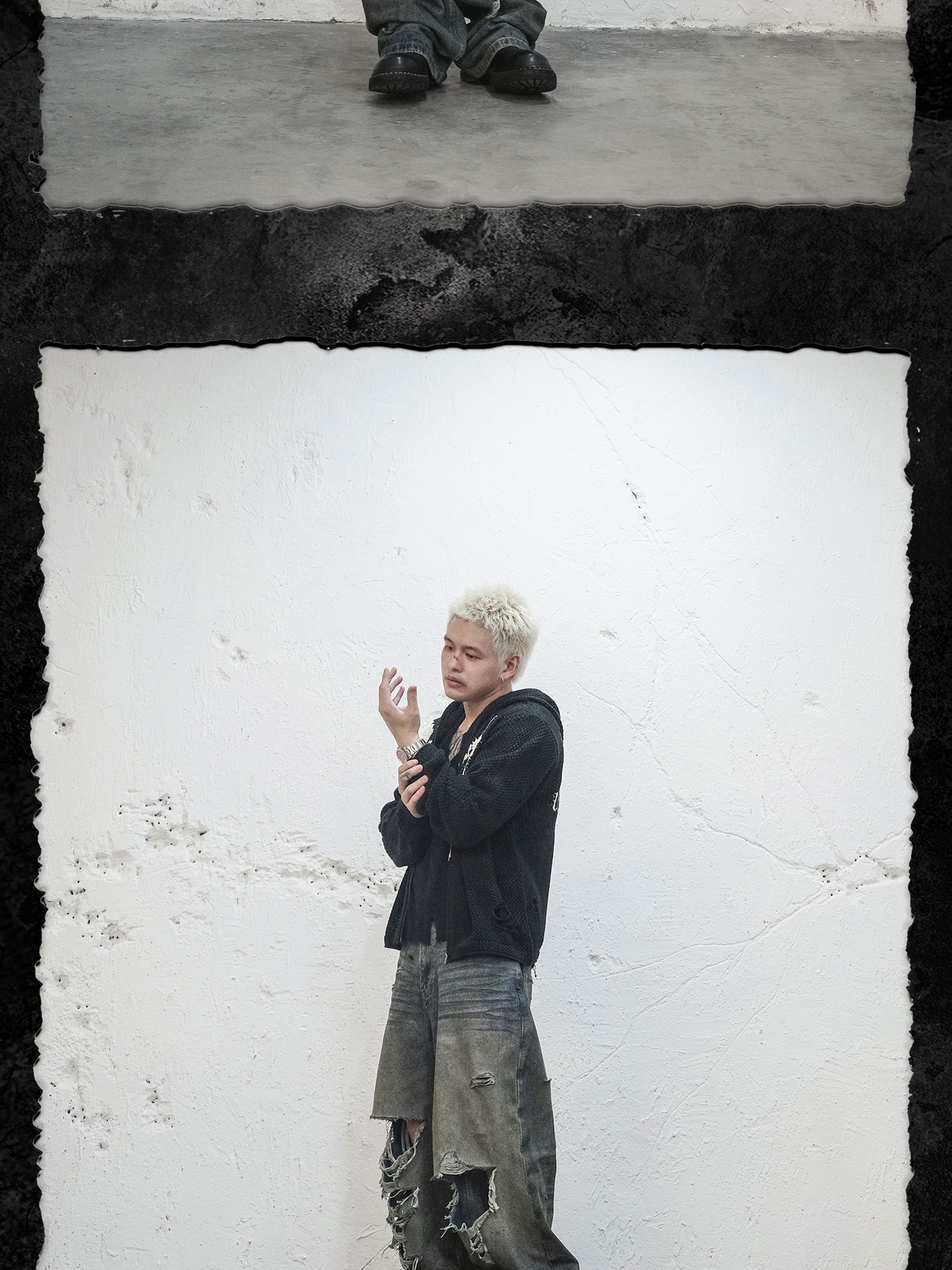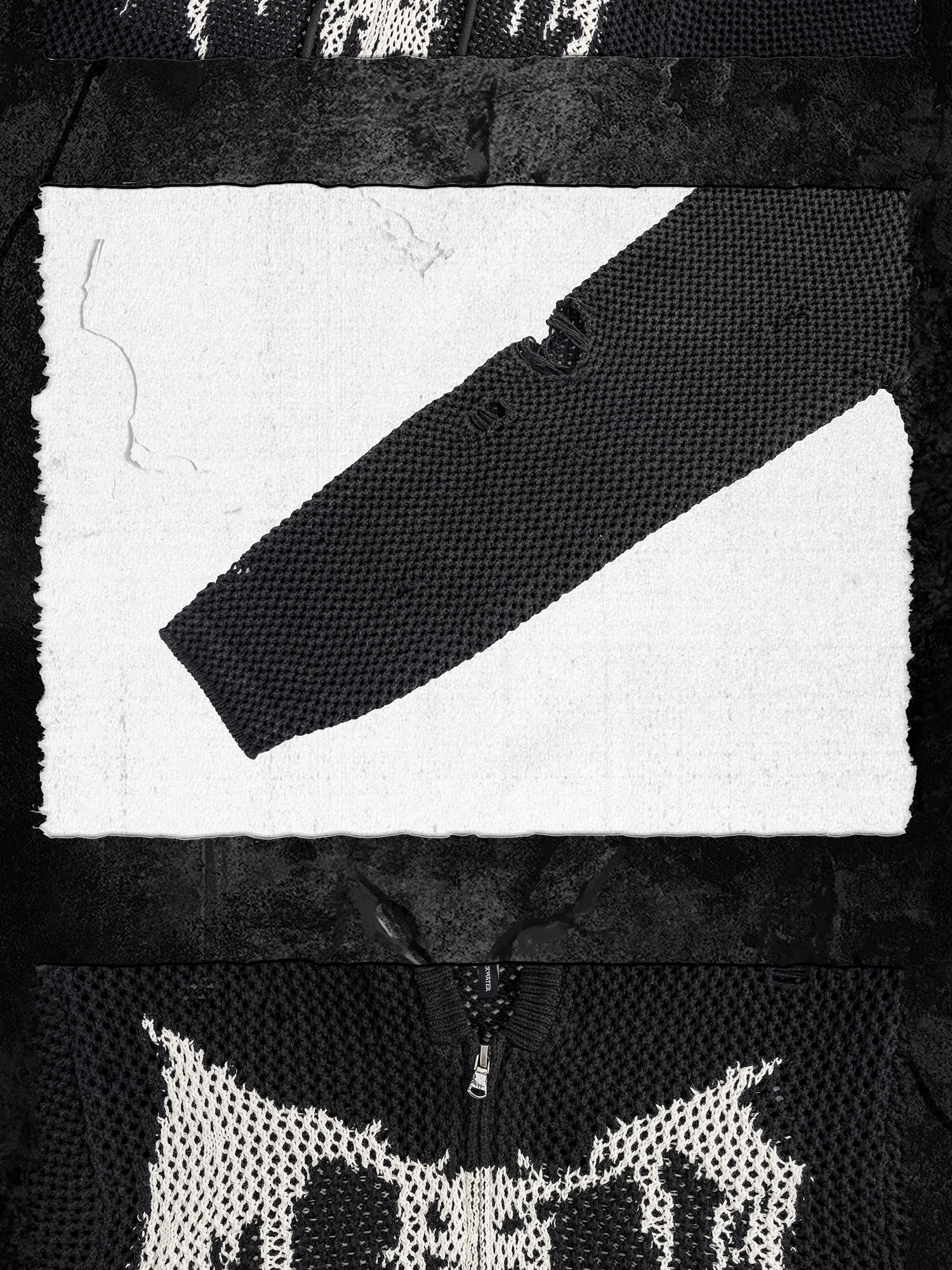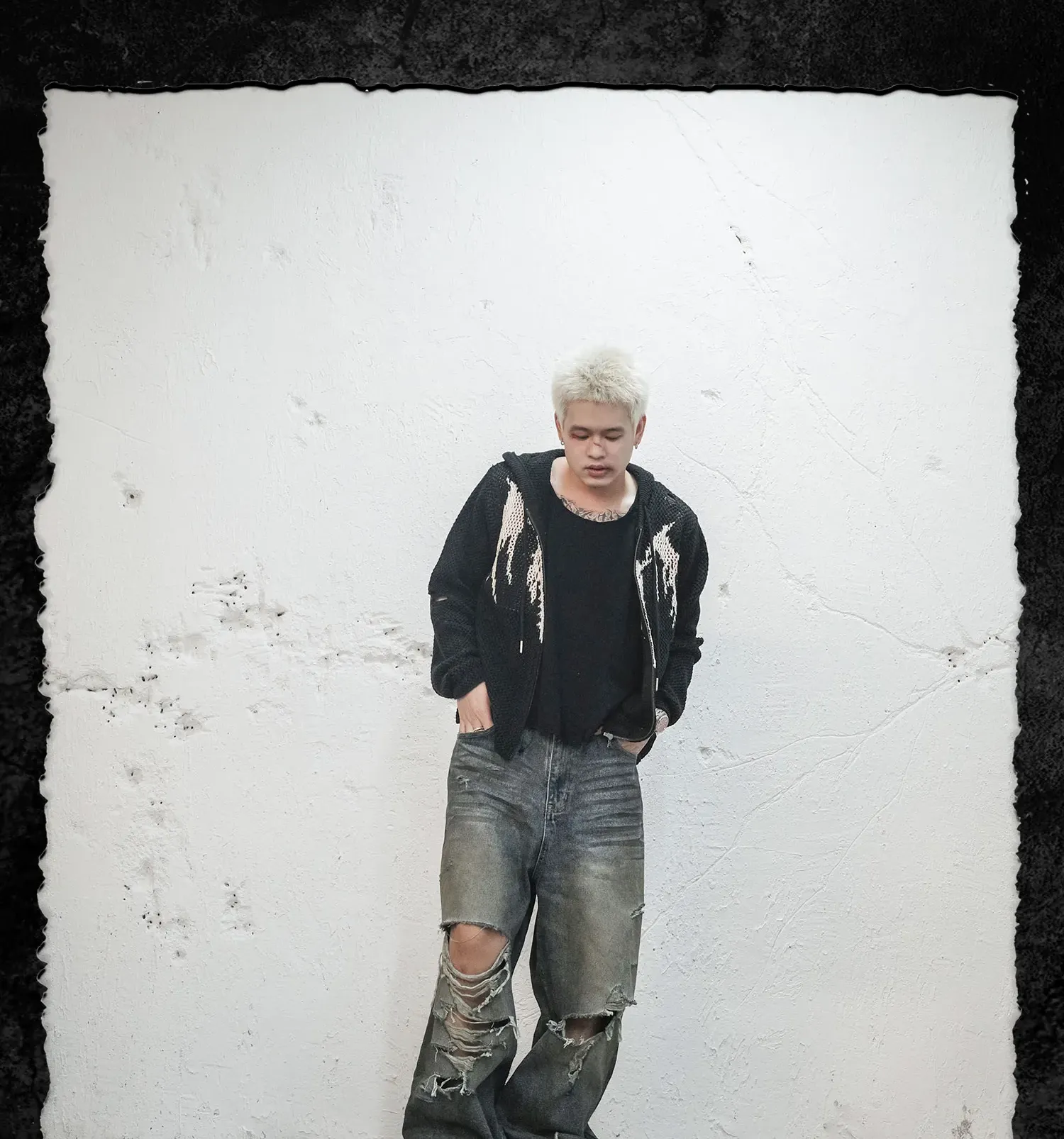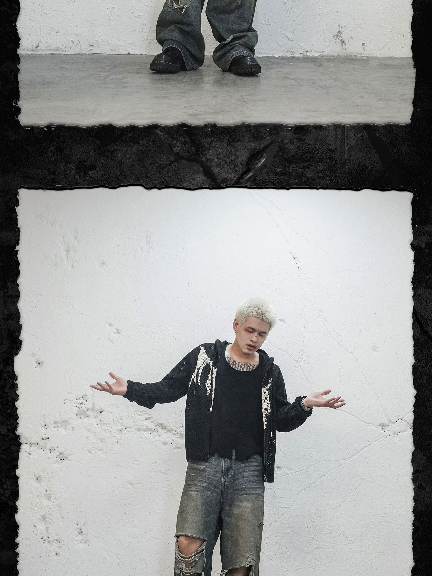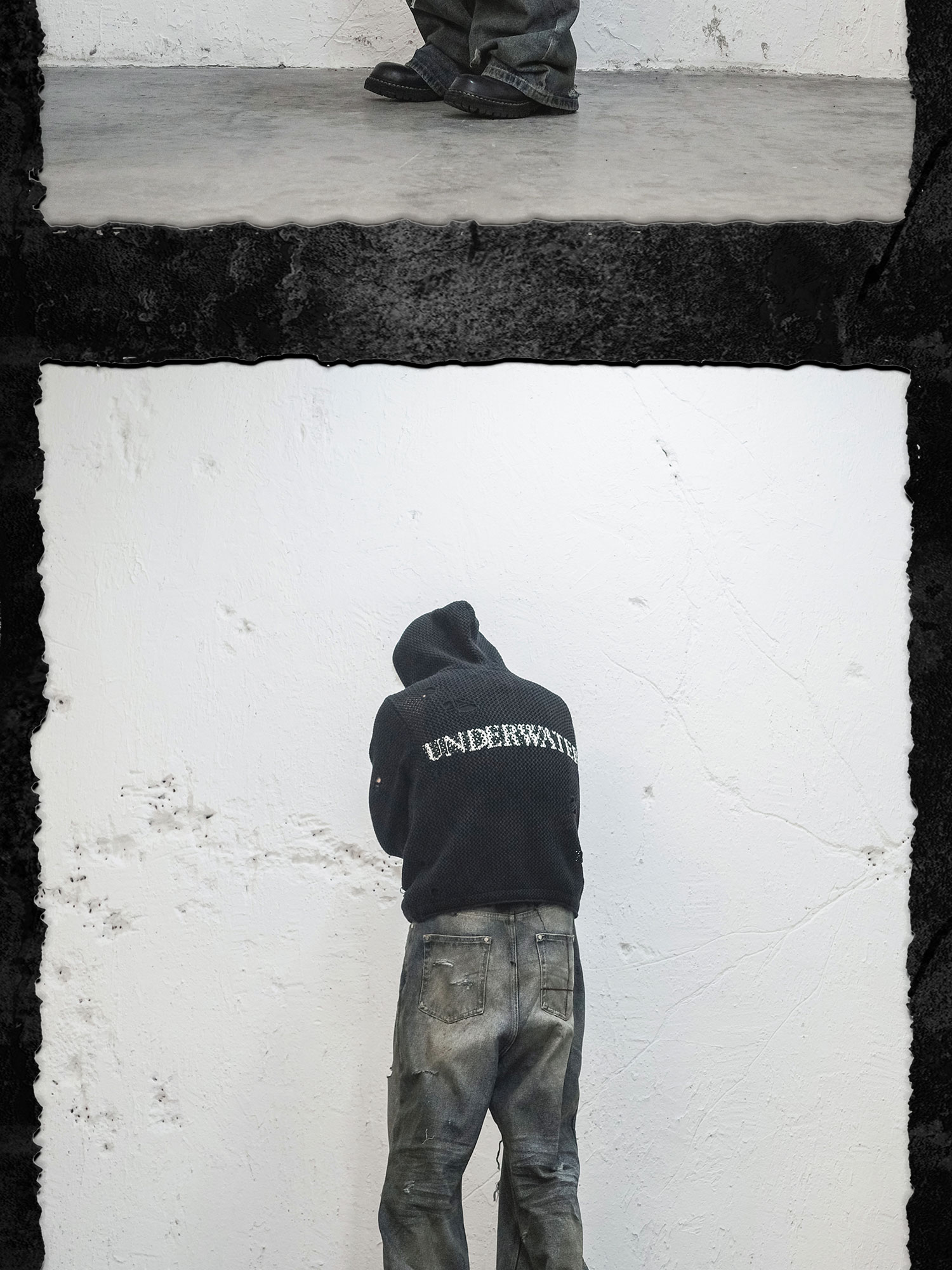- Designed in a UW Boxy fit, this sweater features a soft, skin-friendly fabric that balances comfort with texture. Distressed details and claw-like rips slash across the garment, evoking the marks of demonic forces hidden within. The hood provides an enveloping sense of shelter, like a refuge lurking in the shadows. A bone motif jacquard emblazoned on the chest serves as a demonic insignia, while the back logo declares allegiance to the abyss. This piece embodies apocalyptic aesthetics of destruction and rebirth—an unmistakable dark battle robe that summons the spirit of rebellion.