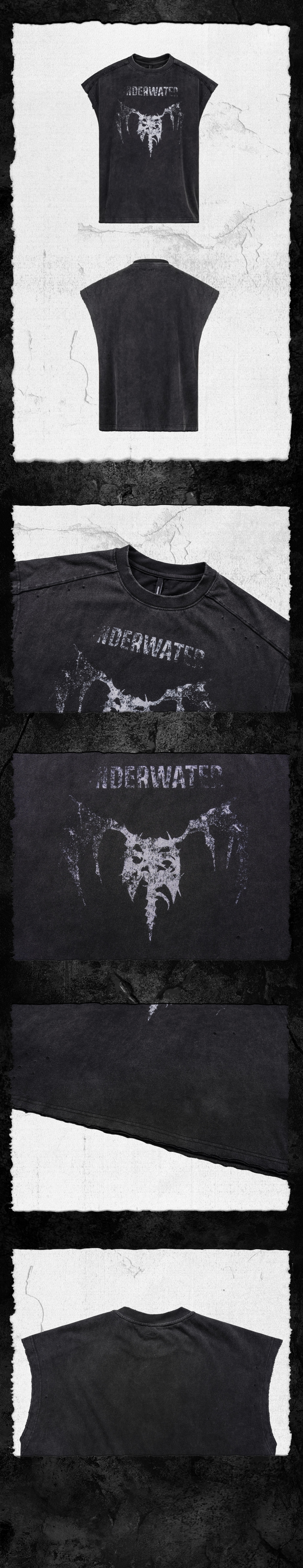 - This UW boxy-fit tank is made from soft cotton fabric, with a silhouette resembling the untamed wings of a fallen demon. The chest features a demon bone graphic created with imported Kornit direct-injection printing, each rib rendered in a fractured, cold white that feels carved by time in a desolate wasteland. The garment undergoes a mottled sand-wash treatment, producing a unique underwater-faded effect. Raw-cut edges and multiple hand-distressed details embody the silent erosion of darkness—true demons never roar, they linger in silence, veiled above the night sky.