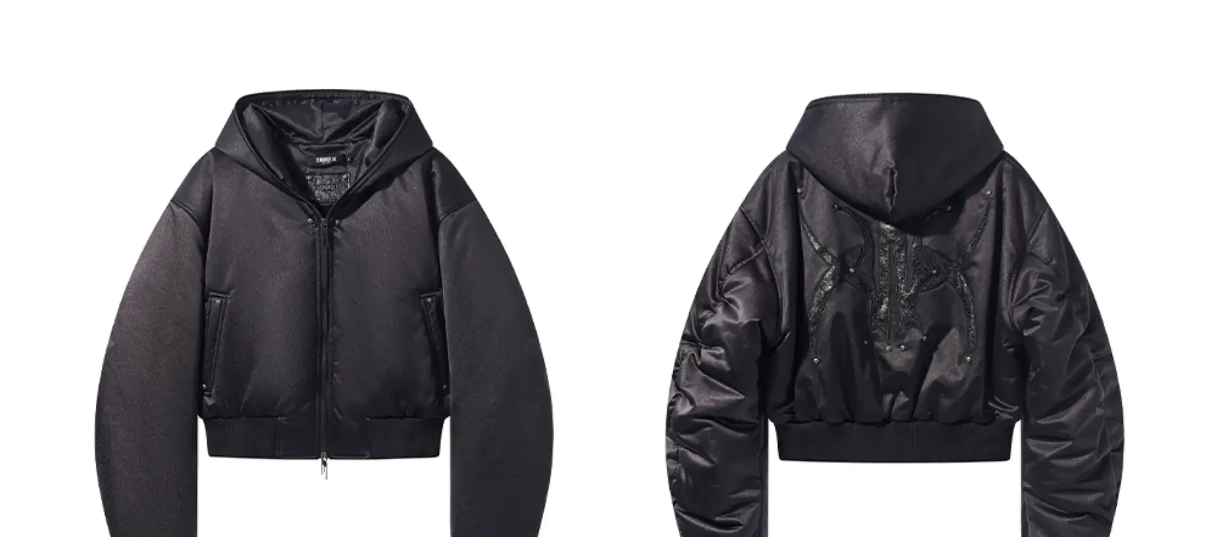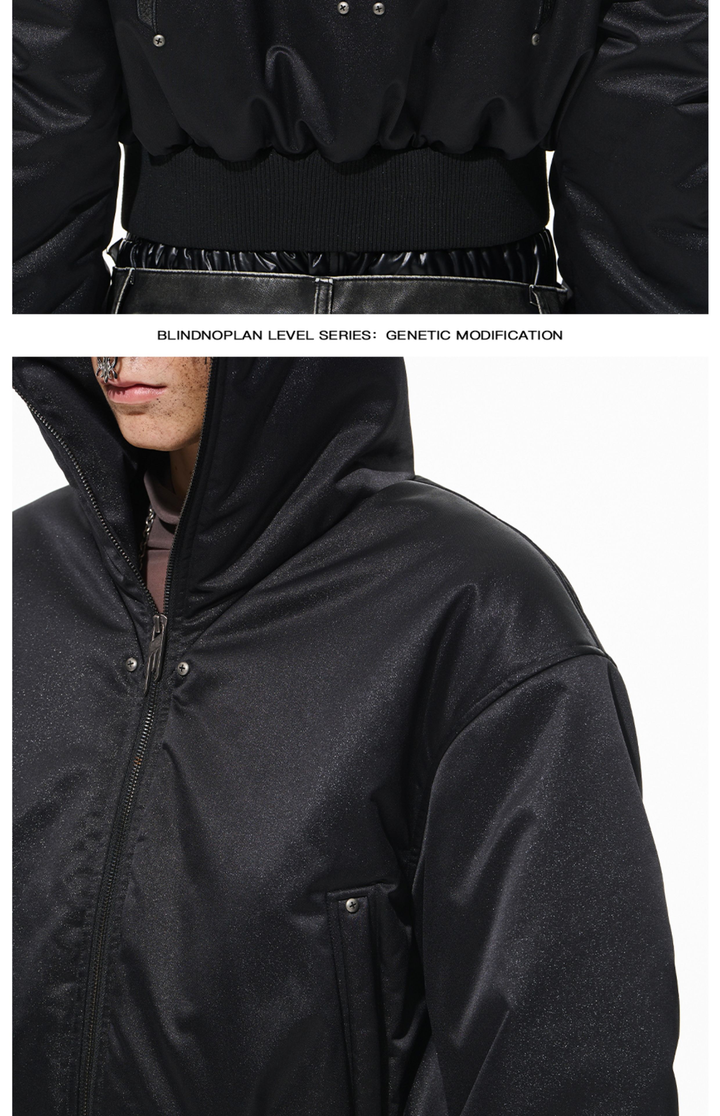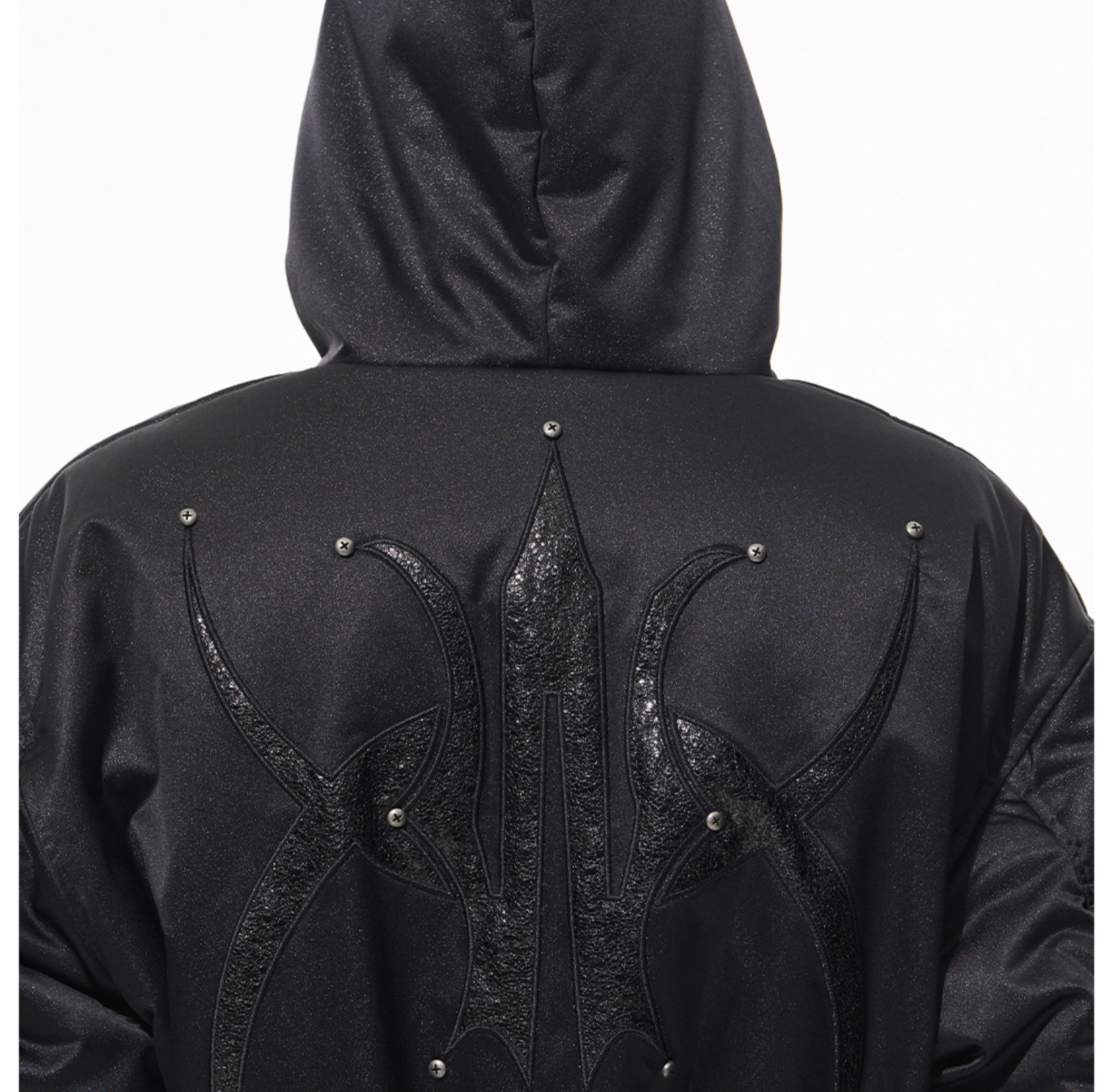 Design Details: Hooded loose-ftting body, sihouette sense of full, hit nail embelishment, details of texture.The fabric has a smooth texture and a clear pattern, providing excellent warmth and comfort, perfect for colder weather.