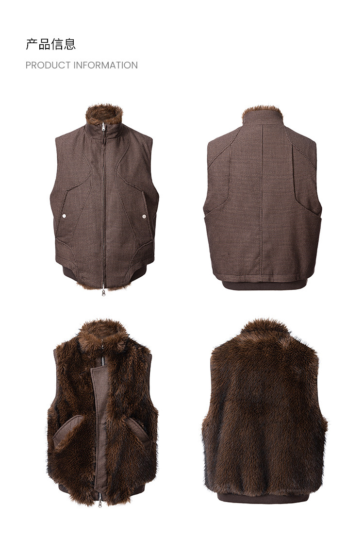 - The reversible construction allows "two styles in one garment." The houndstooth side is structured and sharp, while the faux fur side is soft and cozy—the textural contrast elevates the "reversible" concept from simple style-switching to layered sophistication. Both sides are precision-cut to fit the body comfortably without restricting motion, whether in the tailored check or plush pile form. The faux fur stand collar combines strong warmth with style, protecting the neck in cool weather while adding a "luxe relaxed" vibe to everyday looks. The tone-on-tone ribbed hem cinches the silhouette to block drafts and flatter proportions, keeping the vest sleek and defined on both sides.