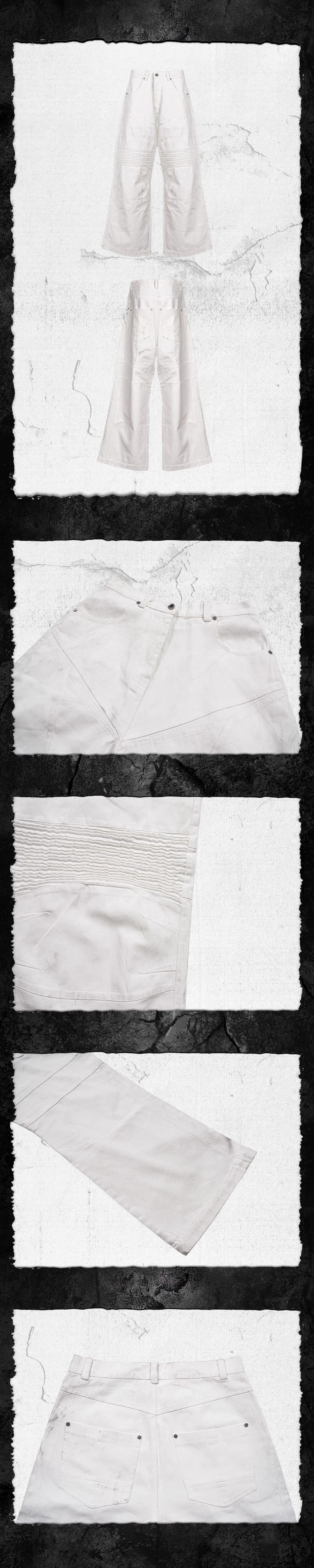 Design Details: Designed in a relaxed, slightly flared fit, these jeans are crafted from premium denim and undergo a hand-brushed wax aging process, evoking a sense of revival from the ruins. The distressed texture, marked by time and chaos, gives the piece a raw and rugged character. Motorcycle-style pleats at the knees enhance the three-dimensional wasteland aesthetic, while custom metal hardware embodies a striking contrast between grit and refinement. The deconstructed "Demon's Eye" motif symbolizes a gaze into mystery and descent amidst the apocalypse.