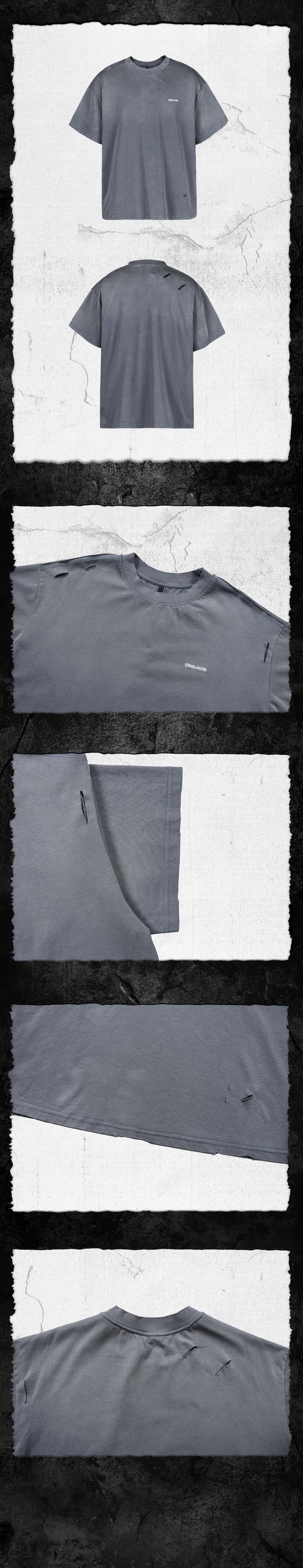 - This UW slim-fit tee is crafted from soft, comfortable cotton, forming a second skin for the nightwalker. Featuring the brand’s signature mottled sand-wash fading, it evokes the appearance of dried blood washed by rain—echoing the remnants of alleyway skirmishes. Hand-cut irregular slashes along the body and edges mimic the scars of close-quarters combat, while the ribbed collar with knife-cut detailing balances subtle destruction with practical wearability. A precise embroidered logo on the chest serves as silent evidence of neon-lit retaliation, making this shirt your accomplice in silence.