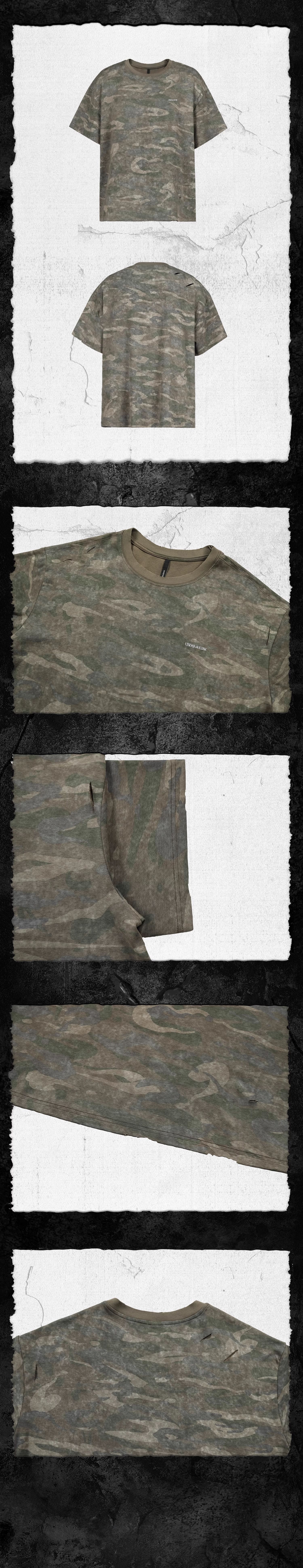 - Designed in a UW slim fit, this tee uses soft, comfortable fabric reimagined as a frontline camouflage battle garment. The brand’s signature washed-distressing finish gives the surface the look of dried bloodstains repeatedly washed away by rain, evoking the remnants of back-alley skirmishes. Hand-cut slashes and irregular raw edges run across the body, like scars from close-quarters combat with cold steel. The ribbed collar is paired with knife-cut detailing, balancing understated destruction with durability. A finely executed embroidered logo at the chest stands as evidence of a neon-soaked ambush—silent proof of conflict. From the moment the chamber loads, this shirt becomes your quiet accomplice.