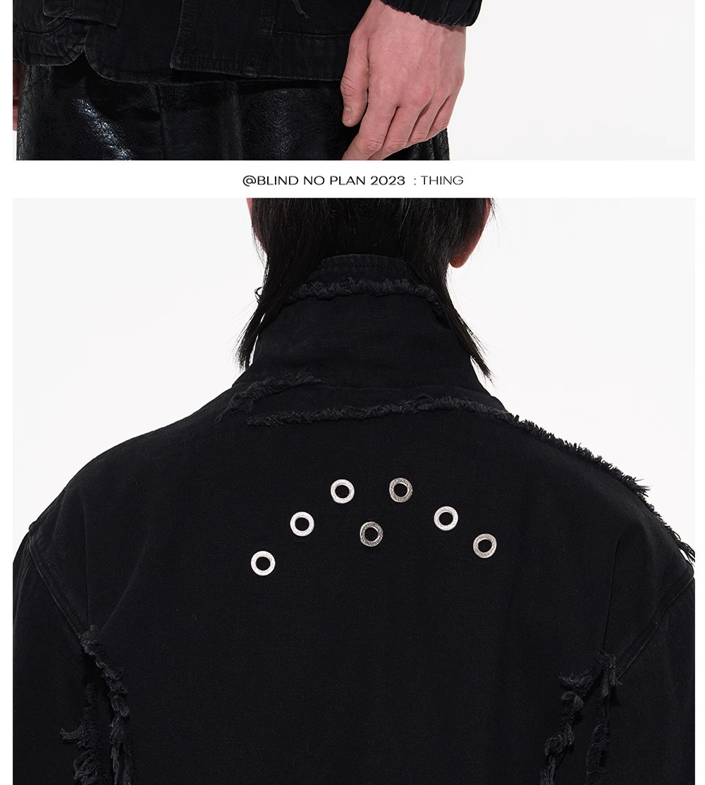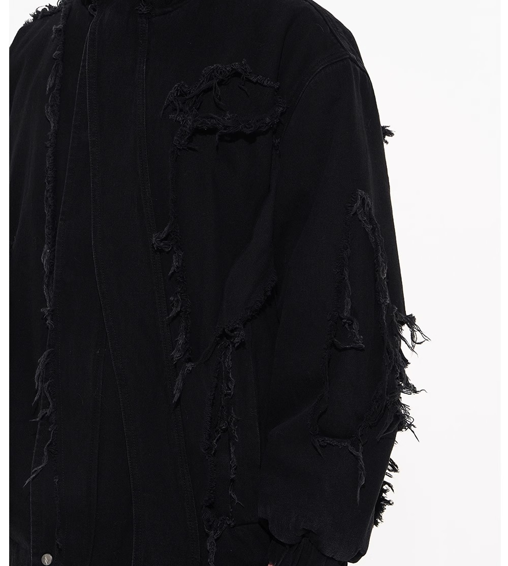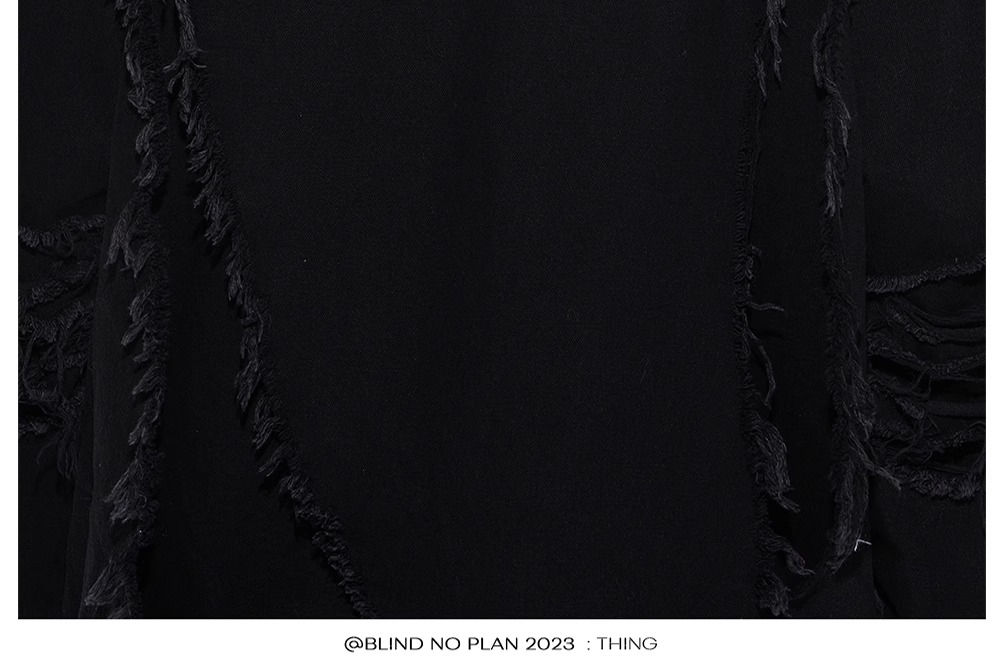 Design Details: The garment features a distressed and cutout design, creating a knife-cut appearance. The edges undergo a washed and distressed treatment to form a naturally frayed effect, adding rich layers.