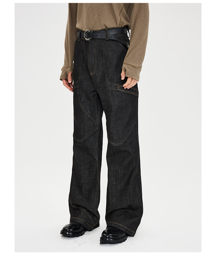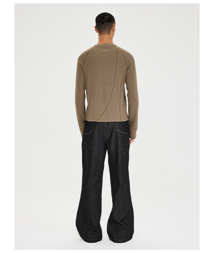 Design Details:3D Deconstructed Paneling: The front thighs feature a multi-panel construction. Off-white stitching accentuates the seam structure, enhancing visibility and preventing monotony in the solid-color fabric.Functional Reinforcement: Symmetrical double dart lines at the knees, combined with a lozenge-shaped reinforcement gusset above, distribute stress during movement, increasing durability for daily sitting and squatting.Dynamic Curve Tailoring: A long, curved seam from the back waist to the hem follows the natural contour from hip to calf. Paired with a back yoke seam, it enhances the wrap and fit through the waist and hips.