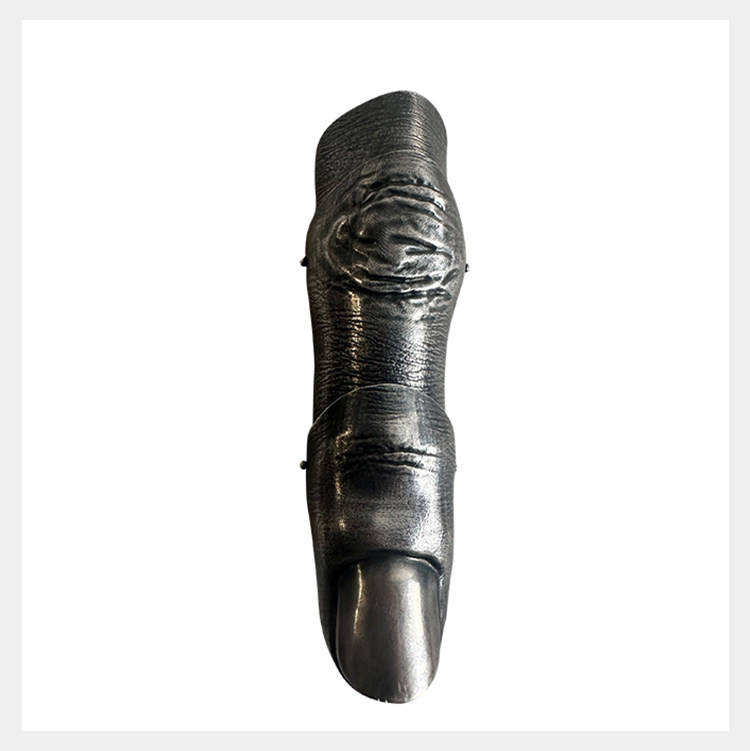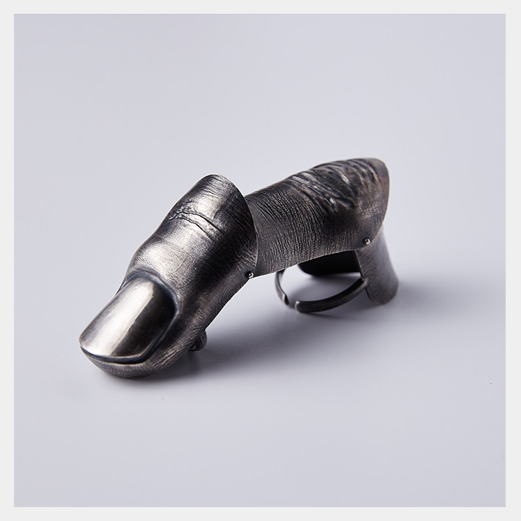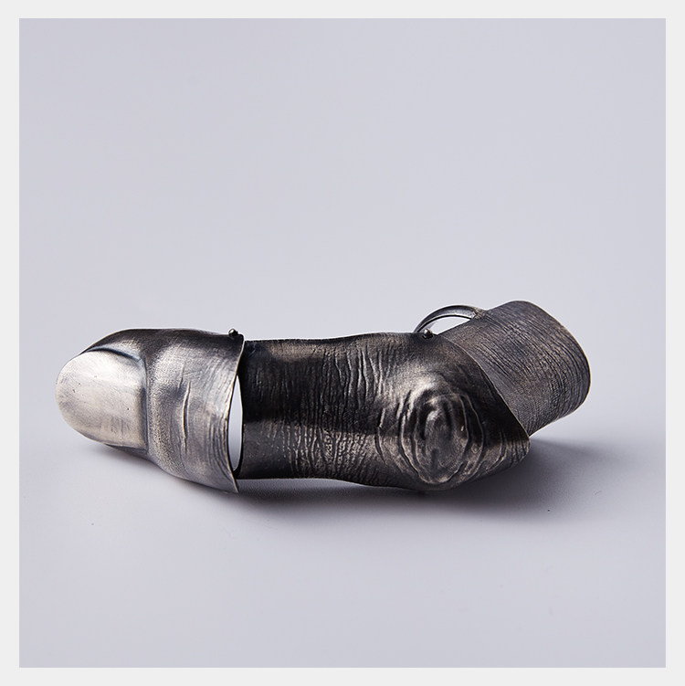 • This season draws inspiration from Egyptian mummification culture, with death and rebirth as its core theme. The design carries a primal, organic aesthetic—each piece is cast and sculpted to follow the natural contours of the finger and finished with hand-detailed craftsmanship. The sectional, articulated construction follows the ergonomics of the hand, resulting in a bold sculptural presence. Finished in a mottled, antiqued silver tone for a refined texture and layered character.