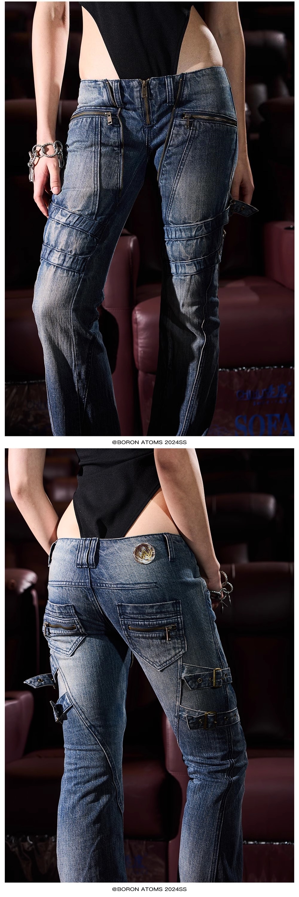 - The entire pair of pants features a slim fit, slightly flared cuffs, an ultra-low waist design, and adjustable leg straps for tightening or loosening. The distressed wash adds a strong overall texture, creating a visually rich and impactful look.