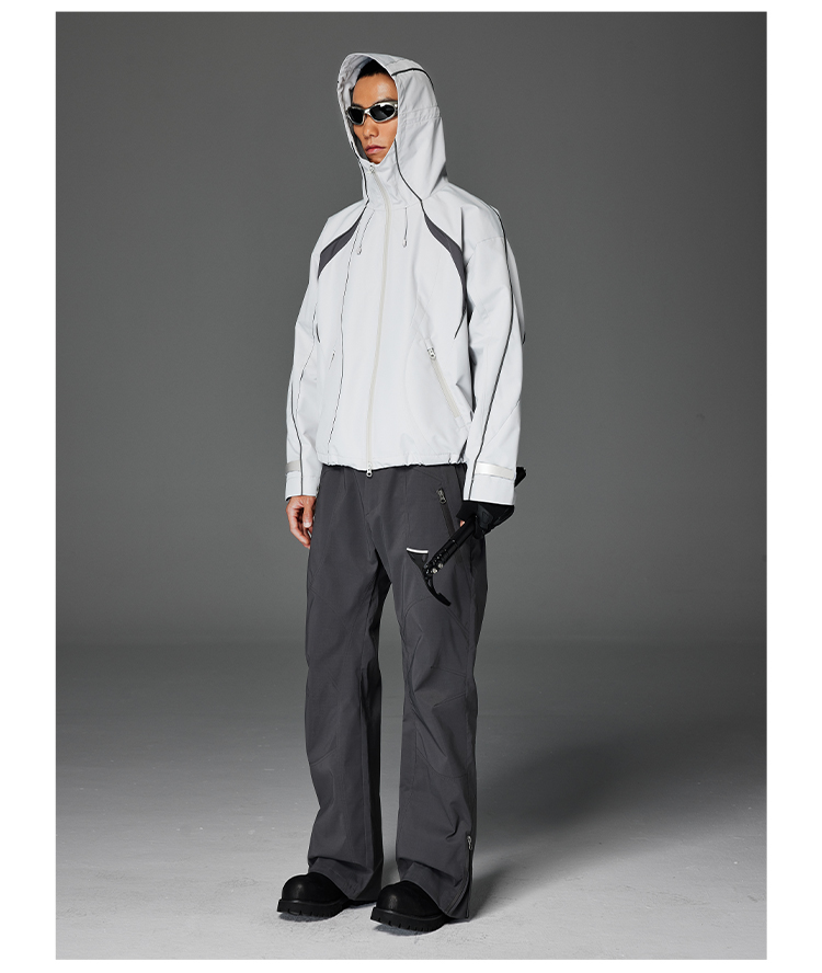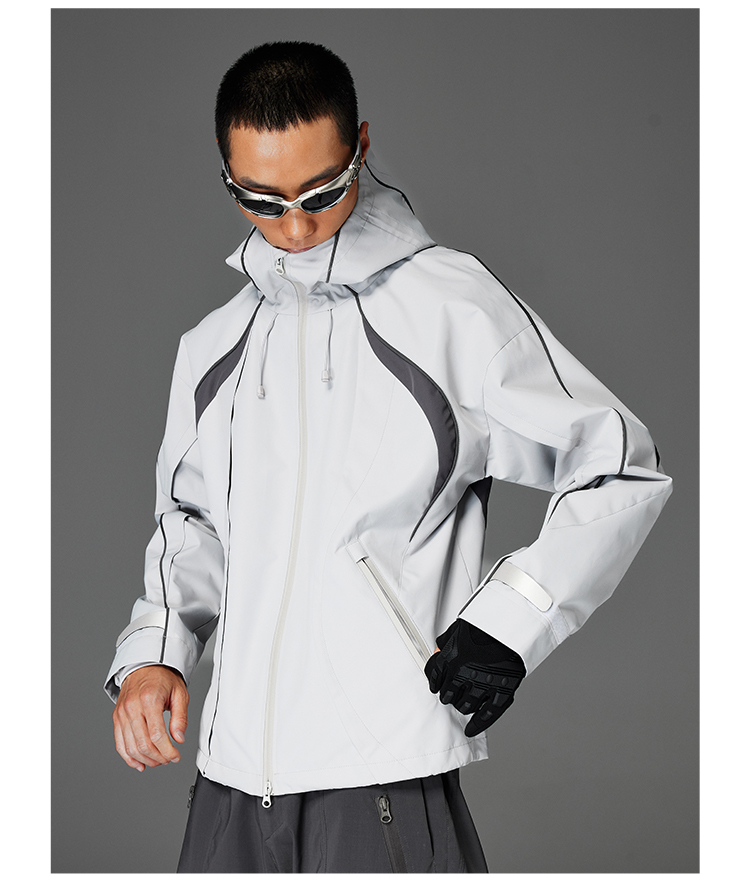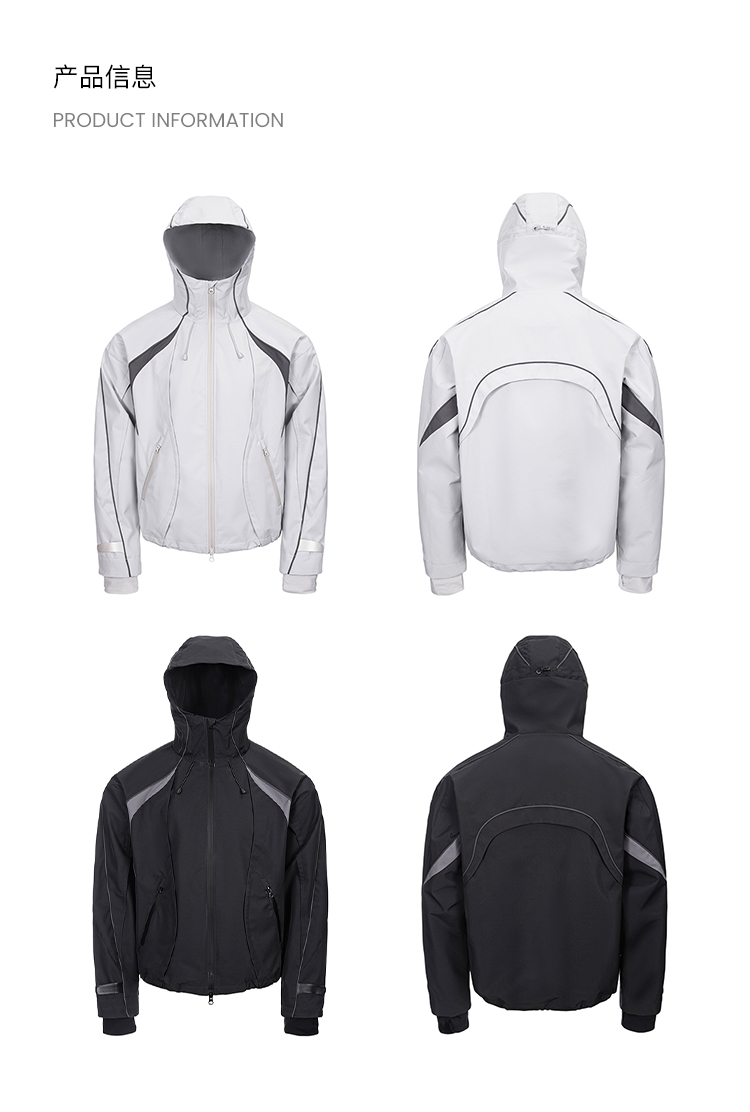 Contrasting Fabric Panels: Utilizes a primary-secondary fabric layout to enhance visual depth and modern appeal.Cuff & Hem Adjustments: Hook-and-loop cuffs with reflective strips allow for quick adjustment to block wind and increase nighttime visibility. Side hem drawcords feature a one-pull cinch system for sealing in warmth and blocking wind.Balanced Fit & Pockets: A mid-weight, standard fit reduces wind resistance and prevents excess fabric bulk, balancing protection with mobility. Low-set side zippered pockets store phones or gloves without affecting balance, with exposed zipper pulls for easy access. All pockets are zippered for quick access and water-shedding security.Streamlined Aesthetic: The matte fabric and clean, minimalist design offer a sharp look with minimal bulk, ideal for spring-summer transitions or light autumn outdoor use.