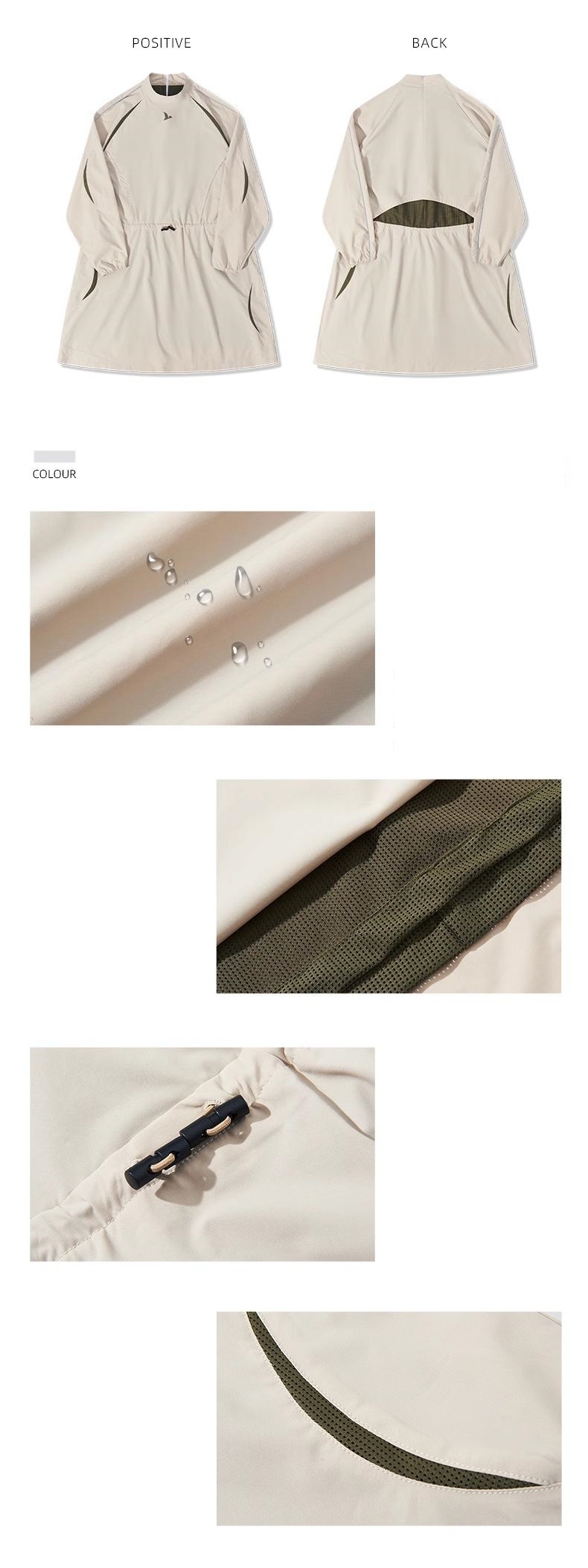 - Fabric waterproof, breathable moisture; Ammonia-free elastic fabric, soft and skin-friendly. Color contrast splicing adds layers, texture interleaving enhances breathable semi-high neck design, modifies head and shoulder ratio. Waist pleating design, adjust the profile. Reflective strip design provides fun during night exercise