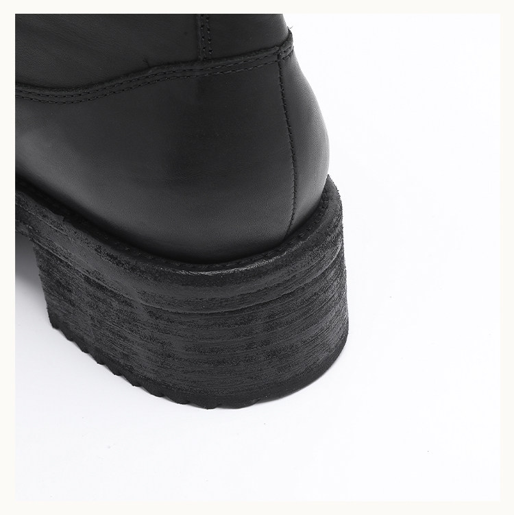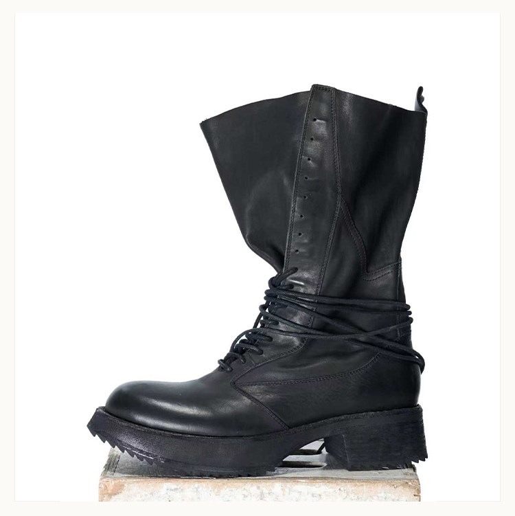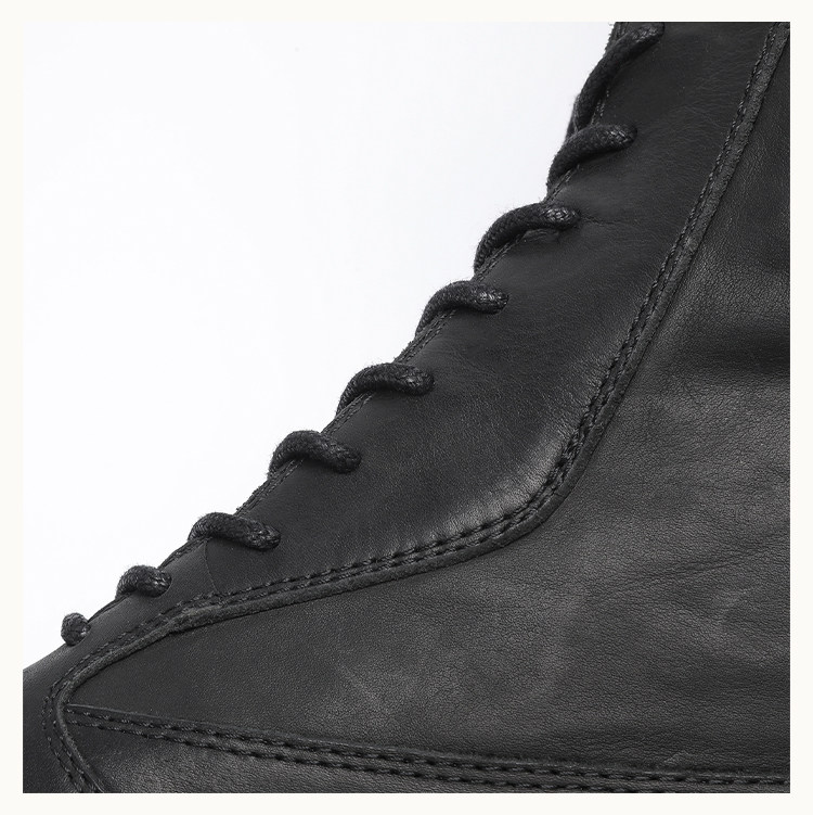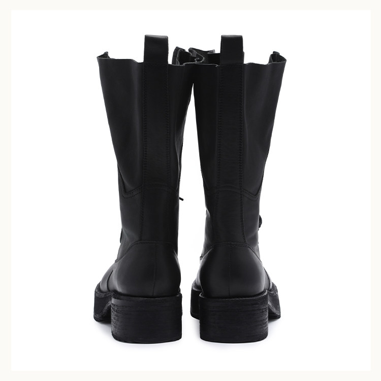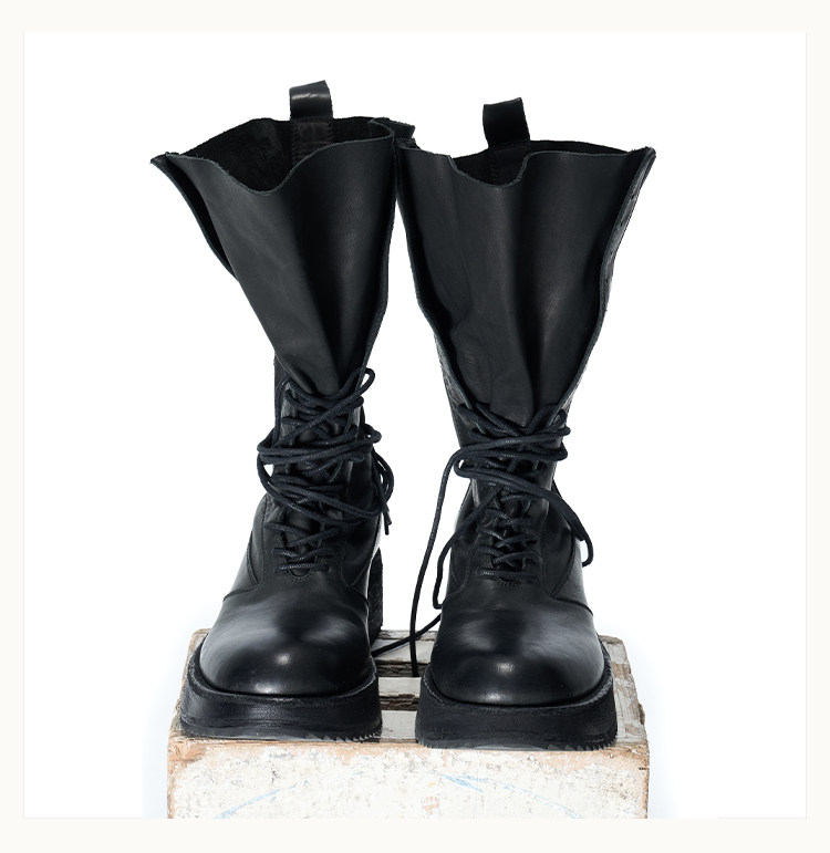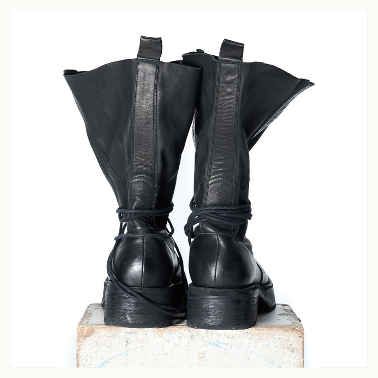• A high‑top boot reaching the upper calf, featuring streamlined panel detailing on the upper, a sculpted midsole, and a lugged outsole. The shaft is shaped with a backward‑lean profile and includes a rear pull tab. Can be worn lace‑less for a sleek look. Crafted from French calfskin using vegetable‑tanning, then garment‑washed through multiple drum‑tumbling cycles—left unpolished to retain a raw matte finish that gradually develops a subtle shine with wear.