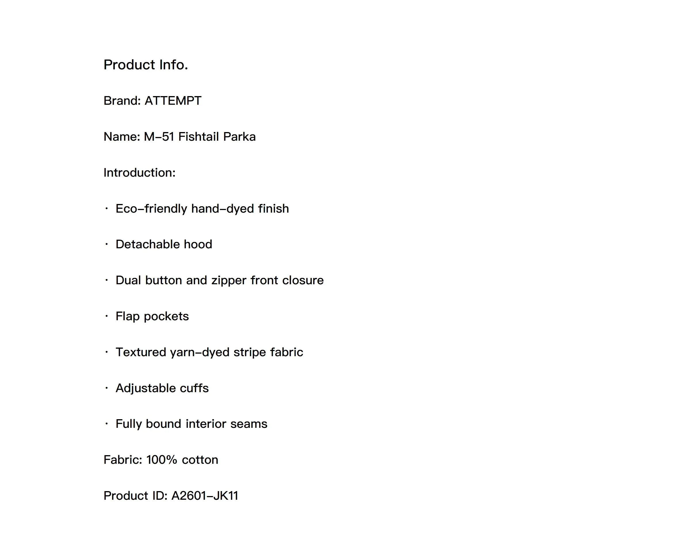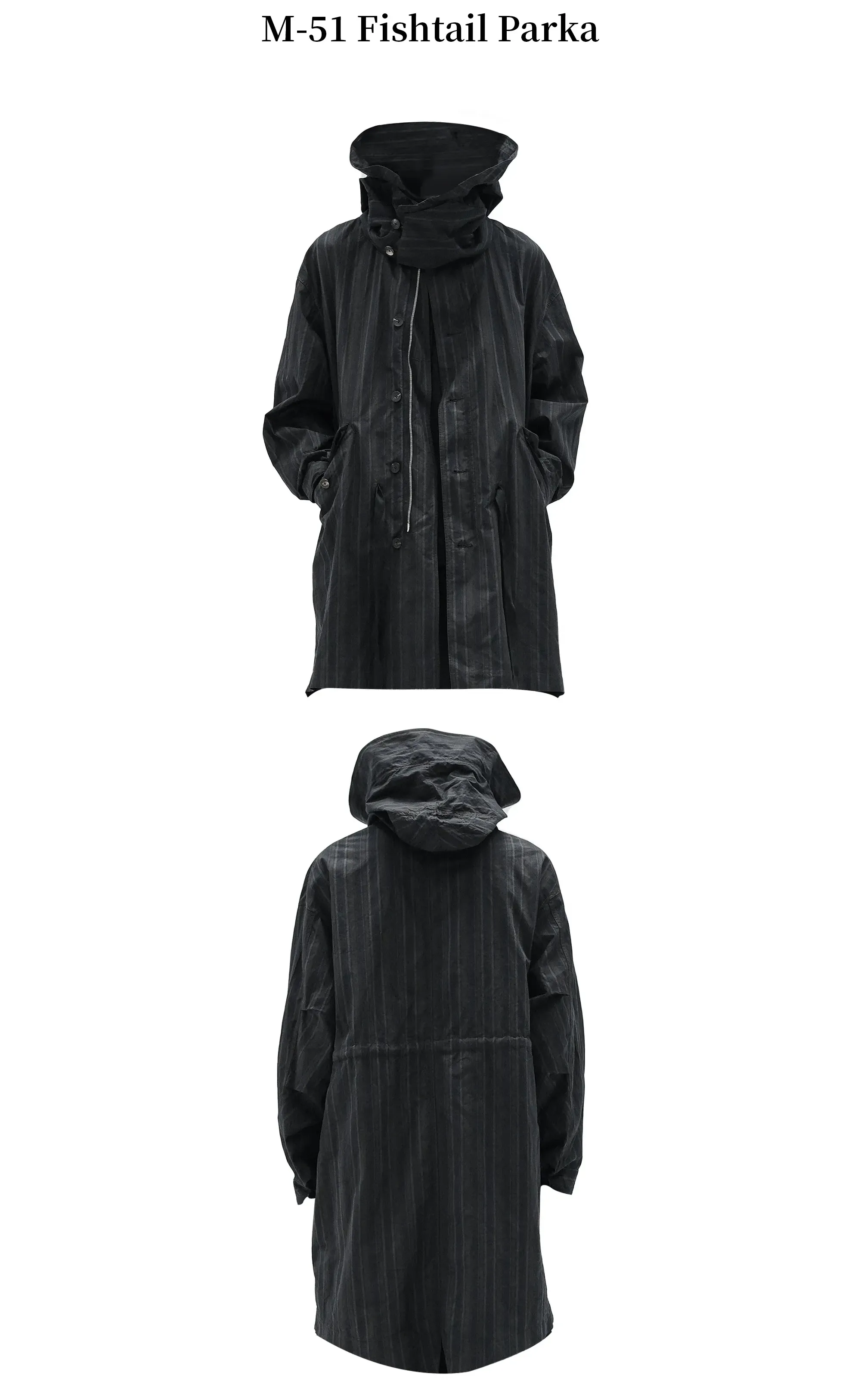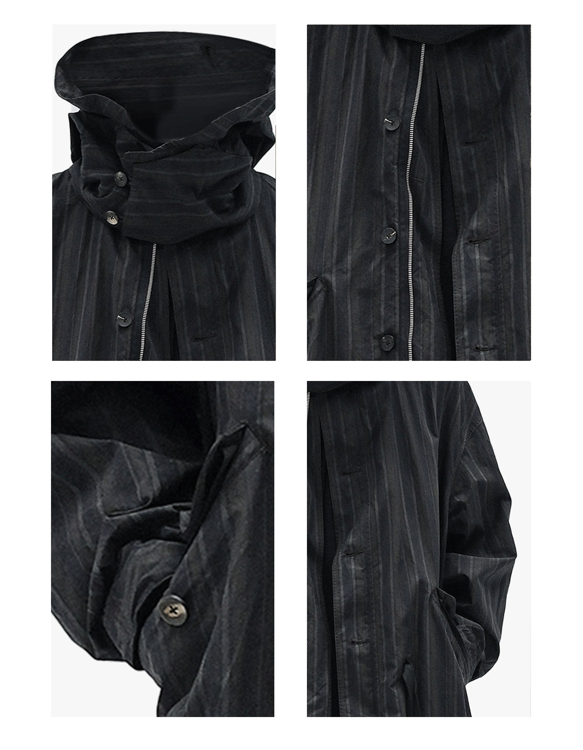 · Eco-friendly hand-dyed finish · Detachable hood · Dual button and zipper front closure · Flap pockets · Textured yarn-dyed stripe fabric · Adjustable cuffs · Fully bound interior seams