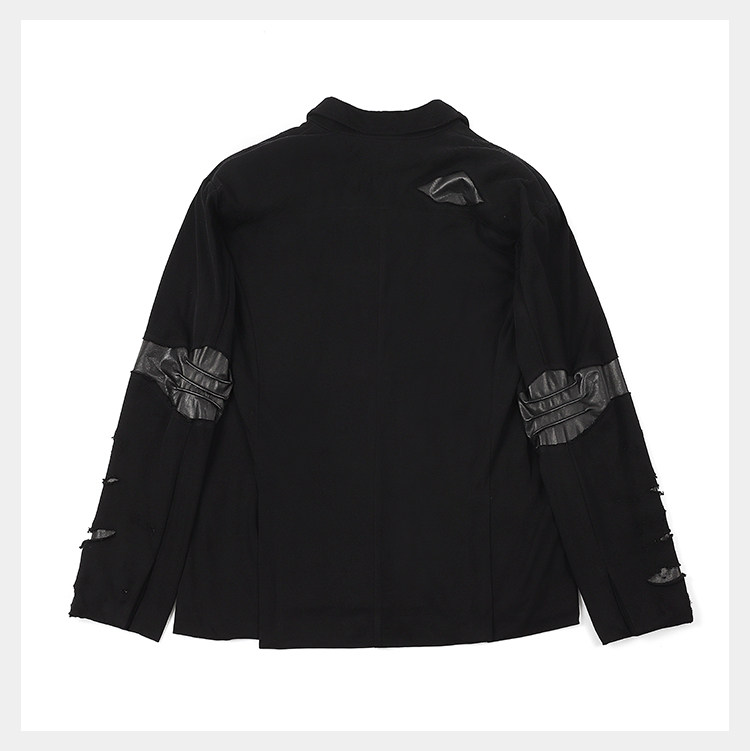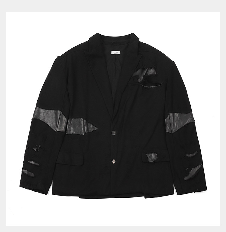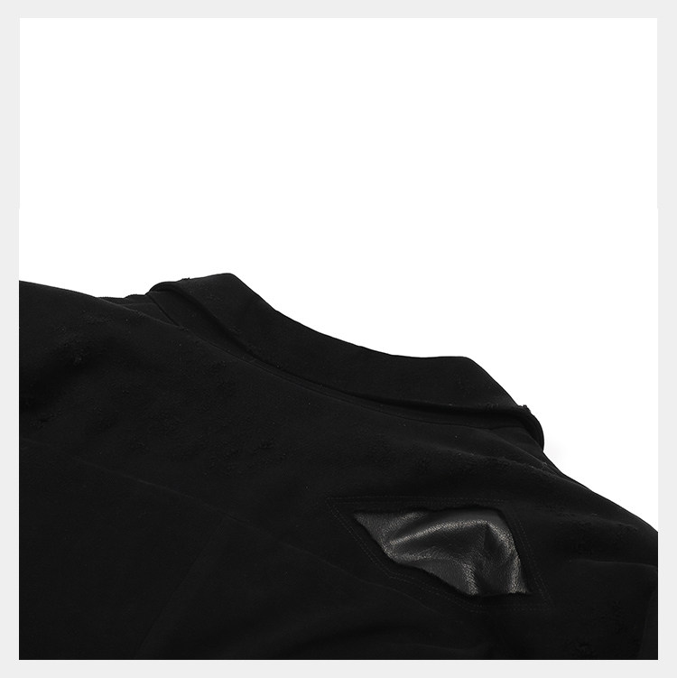 • Featuring an exaggerated oversized silhouette, with structured shoulders that amplify its three-dimensional form. This piece reimagines the classic blazer through D5OVE's distinctive design language, incorporating multiple distressed cuts and rips and delicate lambskin leather paneling for a bold visual and textural contrast. The three-dimensional elbow draping enhances the arm’s outline, while custom distressed buttons complete the one-of-a-kind aesthetic. Crafted from comfortable premium cotton and custom lambskin for warmth and standout texture—loose yet refined, balancing wearability with strong stylistic impact.