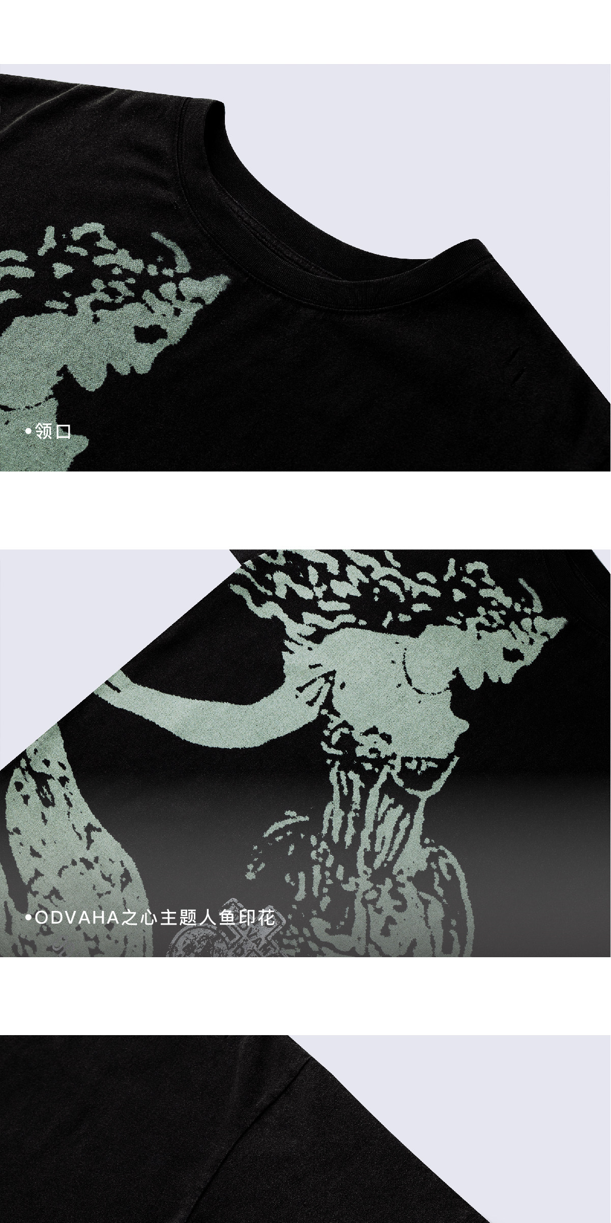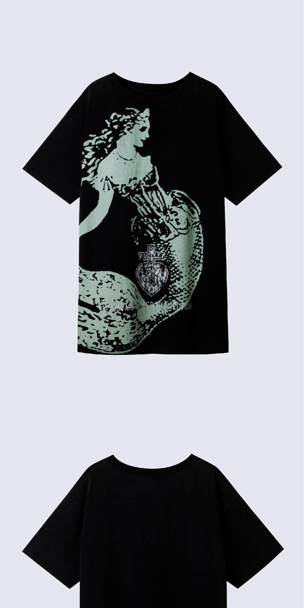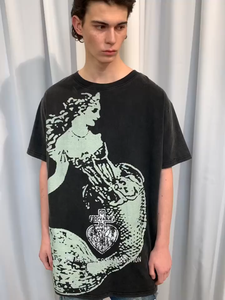 Design Details: Made from 225g pure cotton fabric for lasting shape retention, comfort and breathability, with garment-dyed vintage wash. Features an original ODVAHA Heart mermaid theme print using white ink and glitter printing techniques, combined with multiple handmade destruction holes that enhance the distressed aesthetic when paired with the garment-dyed fabric.