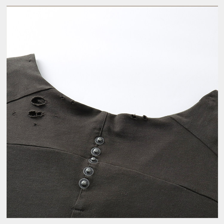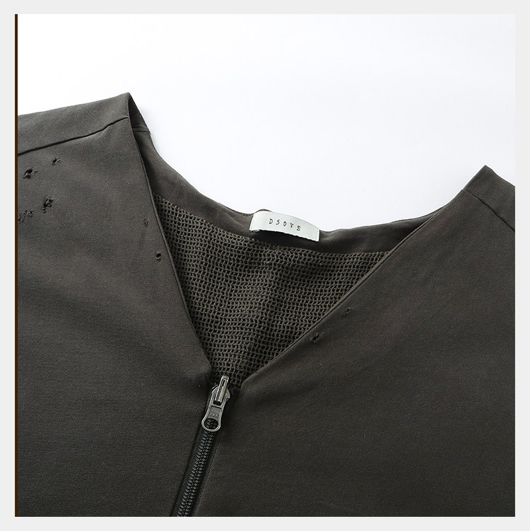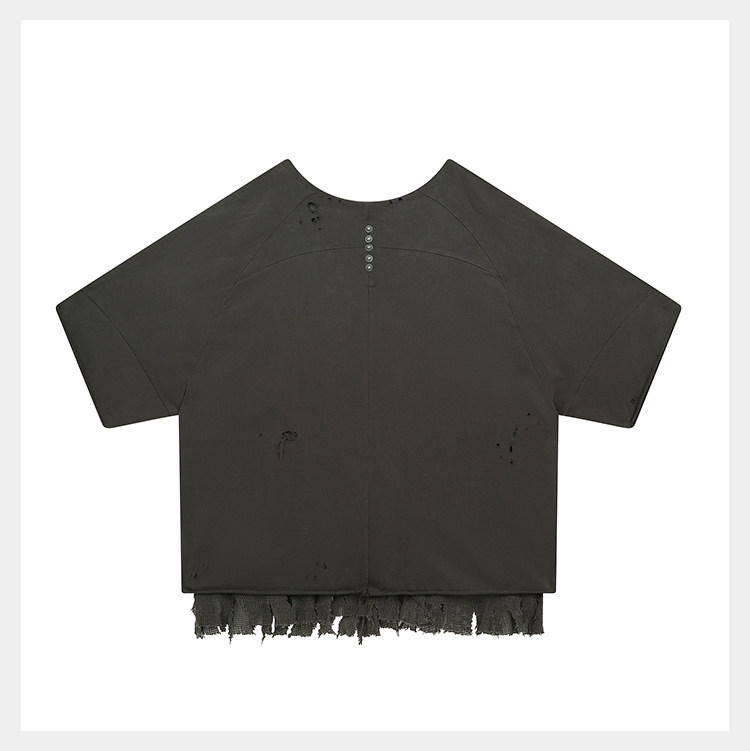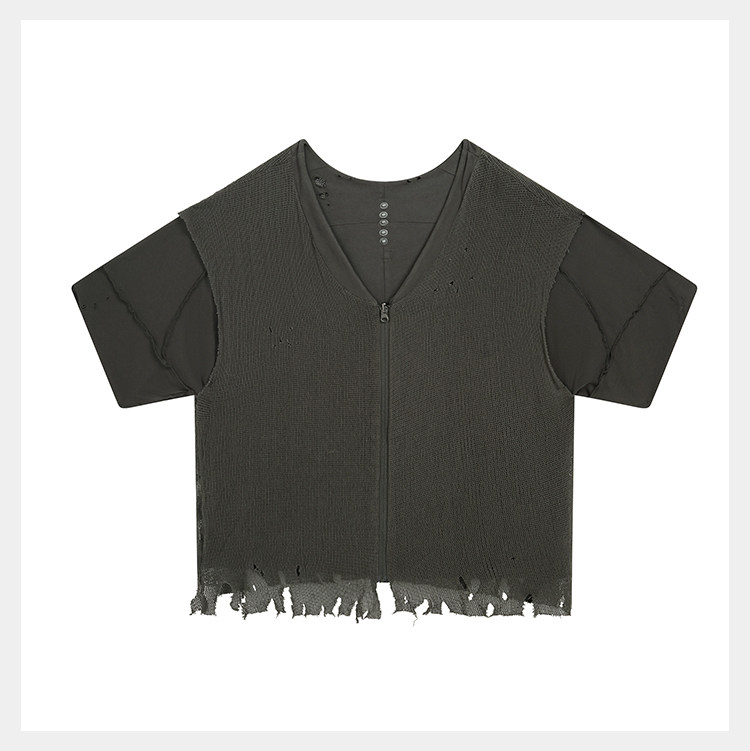 • Featuring a cropped, wide V-neck boxy silhouette designed for reverse wear. The double-faced construction contrasts a brushed knit with cotton mesh for striking textural duality. Streamlined paneling and irregular distressing add fluidity and layered depth, highlighting a distinct post-apocalyptic aesthetic. Made from cotton for breathability and moisture-wicking, with a brushed surface that gains a naturally worn, vintage texture after garment-washing.