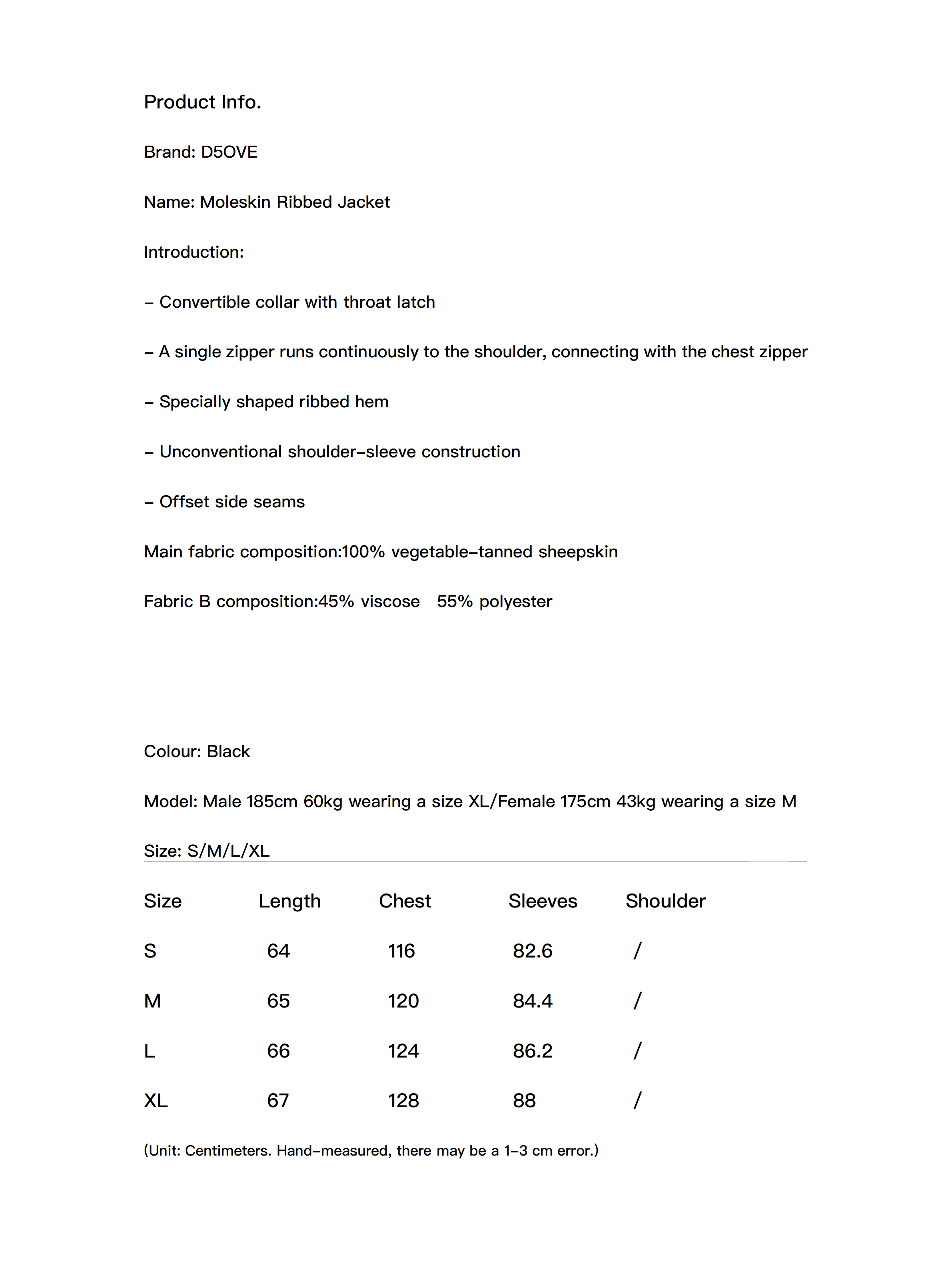 - Convertible collar with throat latch - A single zipper runs continuously to the shoulder, connecting with the chest zipper - Specially shaped ribbed hem - Unconventional shoulder-sleeve construction - Offset side seams