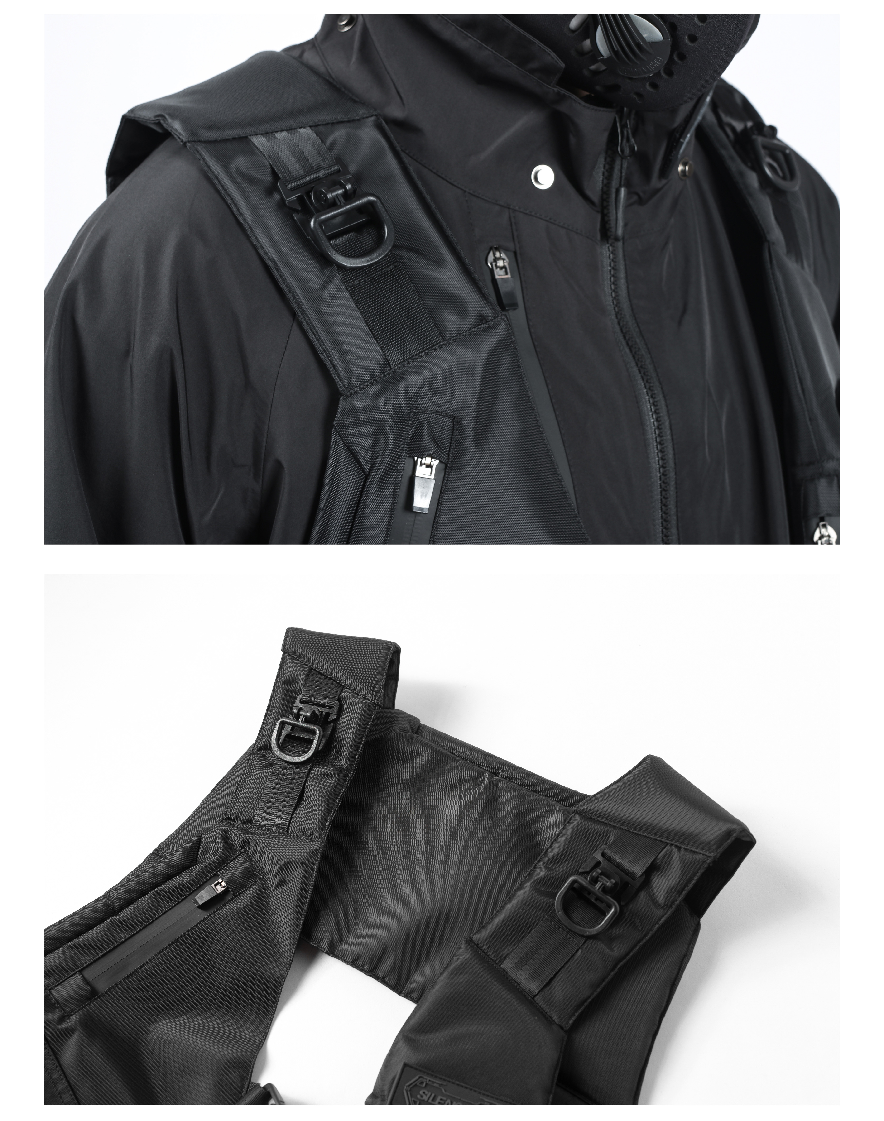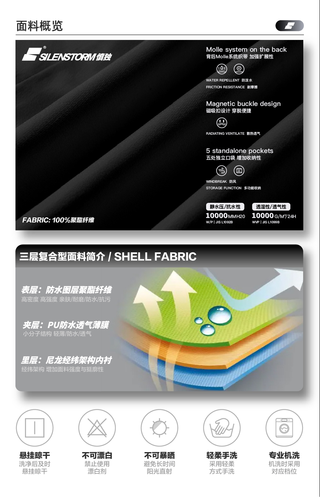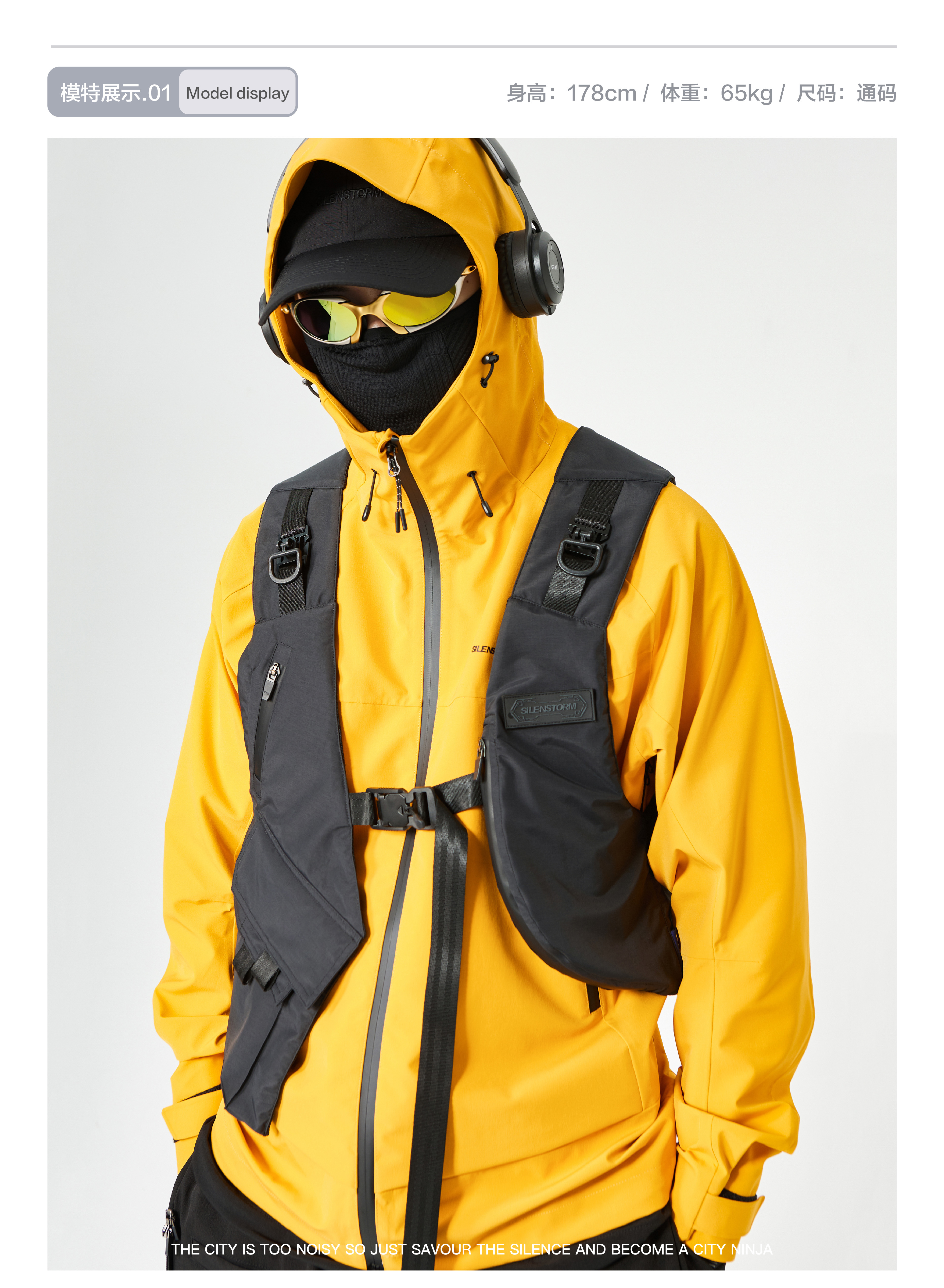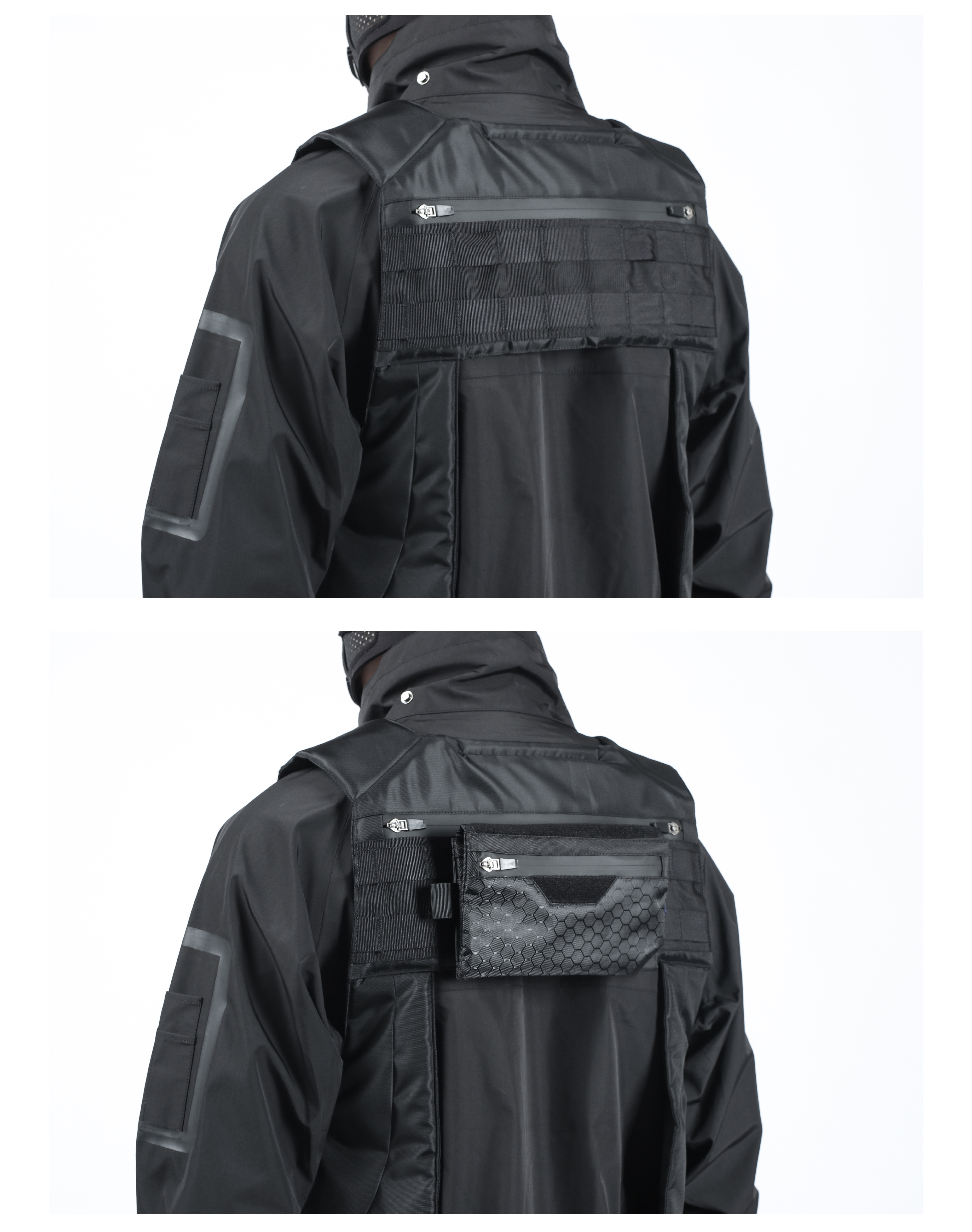 - Crafted with a three-layer composite fabric, featuring a high-density waterproof polyester outer layer, a PU waterproof and breathable membrane for internal protection, and a reinforced nylon lining for durability and structure. This vest integrates a rear MOLLE system for modular expansion, supporting customized attachments and accessories. Equipped with five independent functional pockets, it offers strong storage capacity while maintaining a windproof, water-repellent, and abrasion-resistant performance. The radiating ventilation system enhances breathability, making it suitable for both urban exploration and outdoor missions.