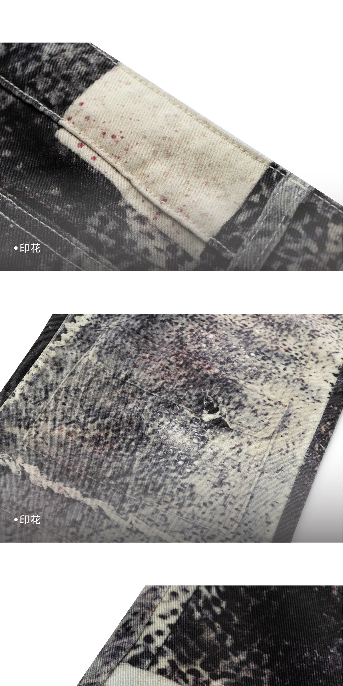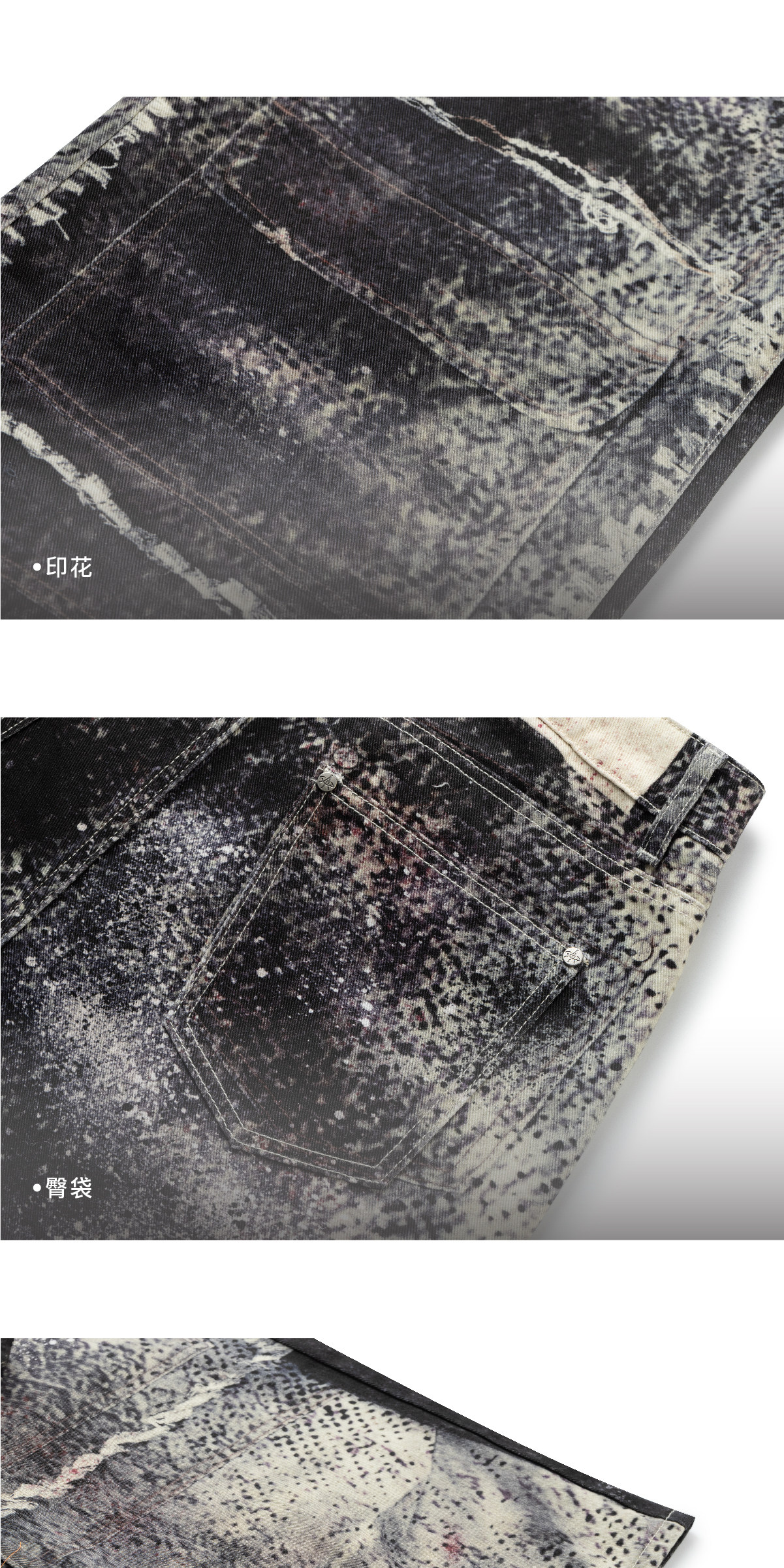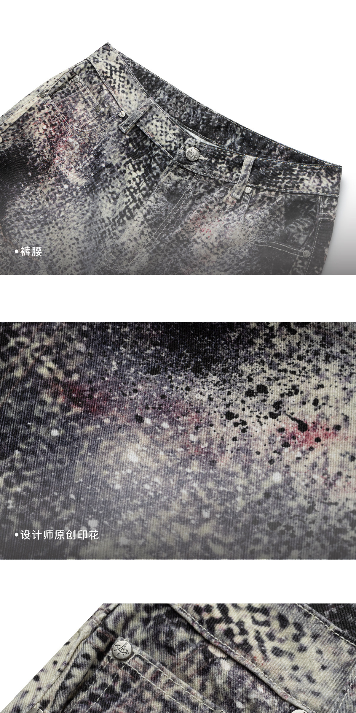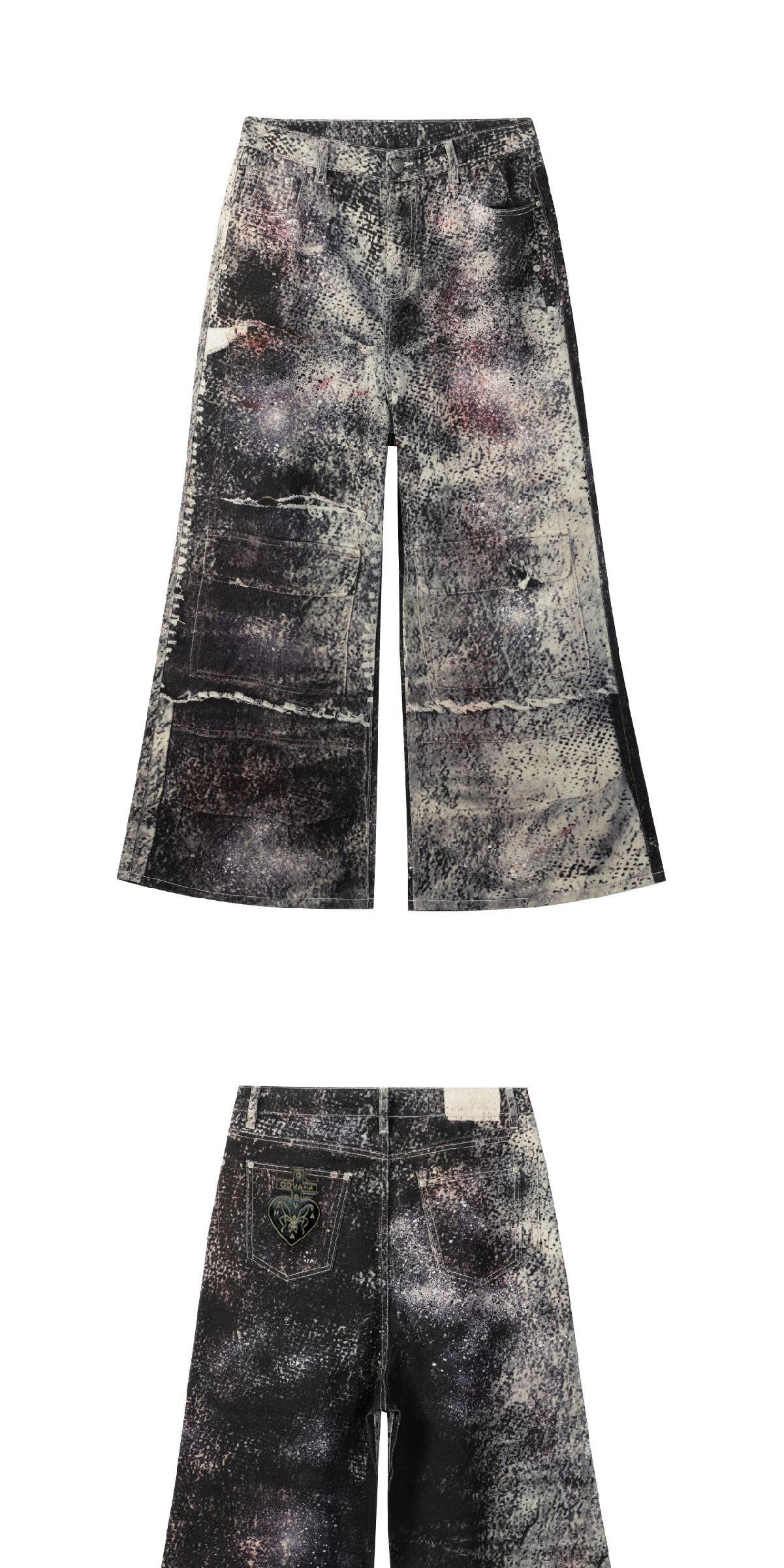Design Details: Crafted from pure cotton fabric for a structured silhouette. Full-body digital print of original artwork. One custom metal button and eight custom metal rivets. Horse leather patch featuring ODVAHA motif sewn on back patch pocket. Hand-distressed by designer before photography and printing. YKK zipper at fly.