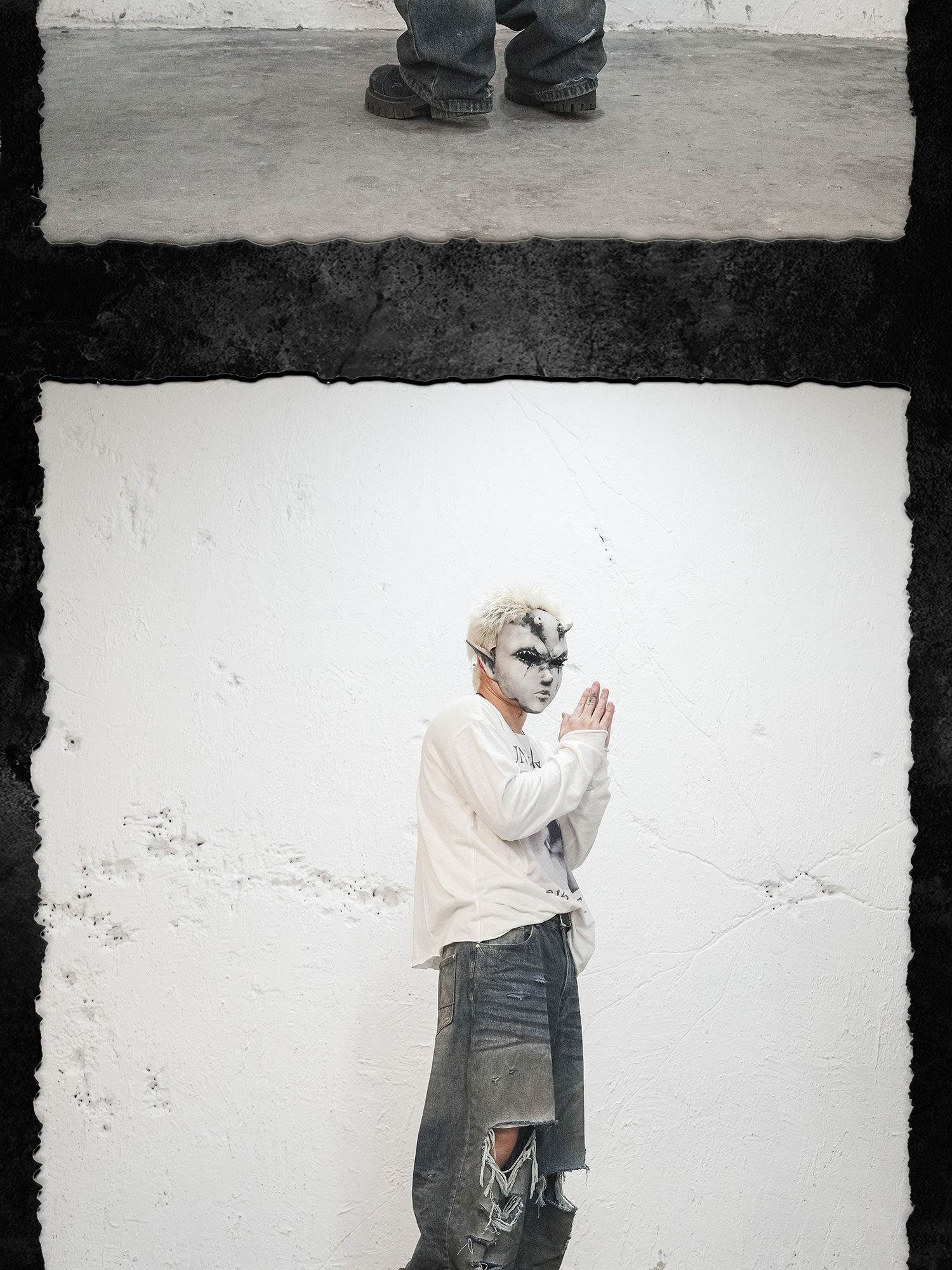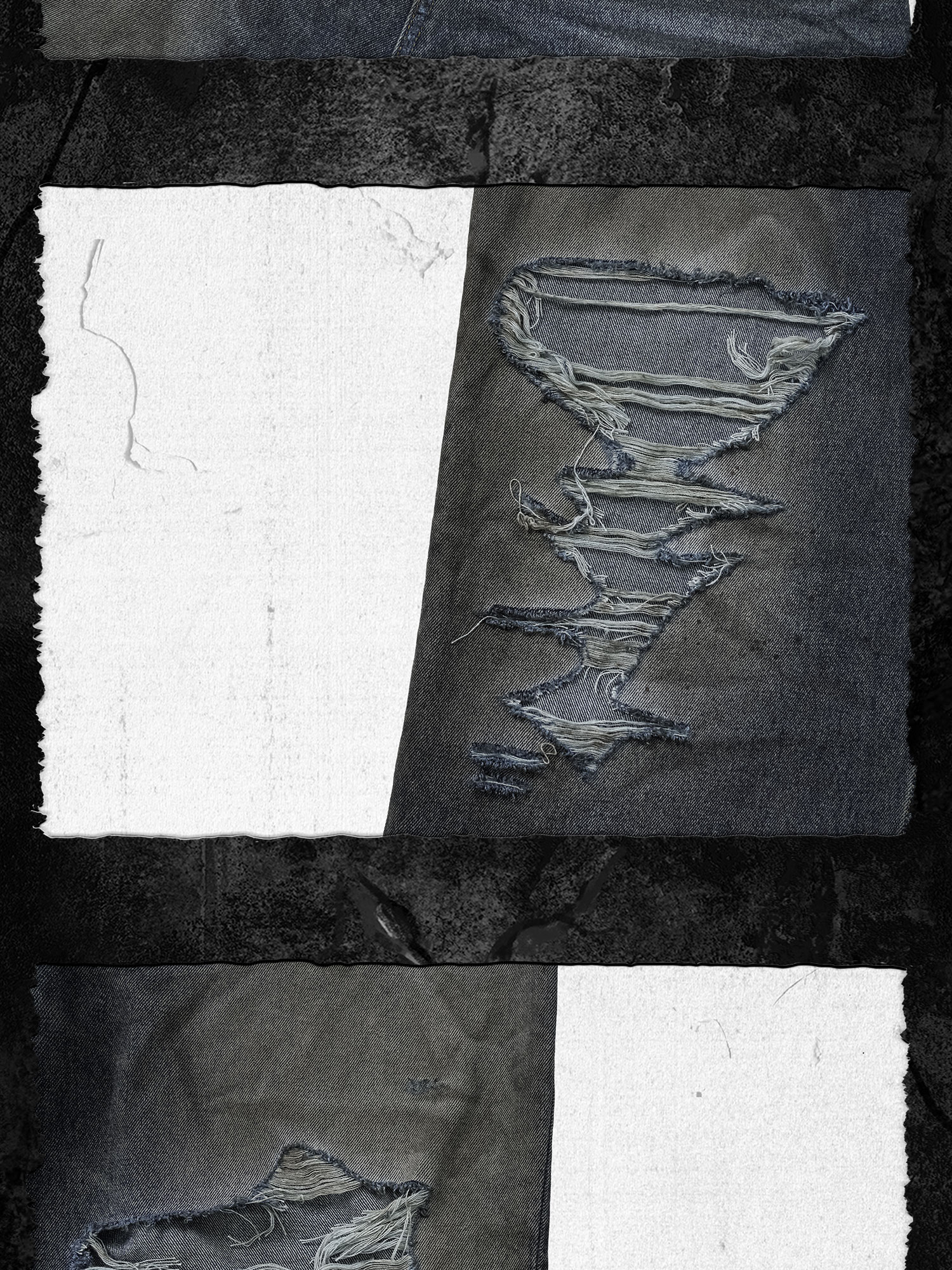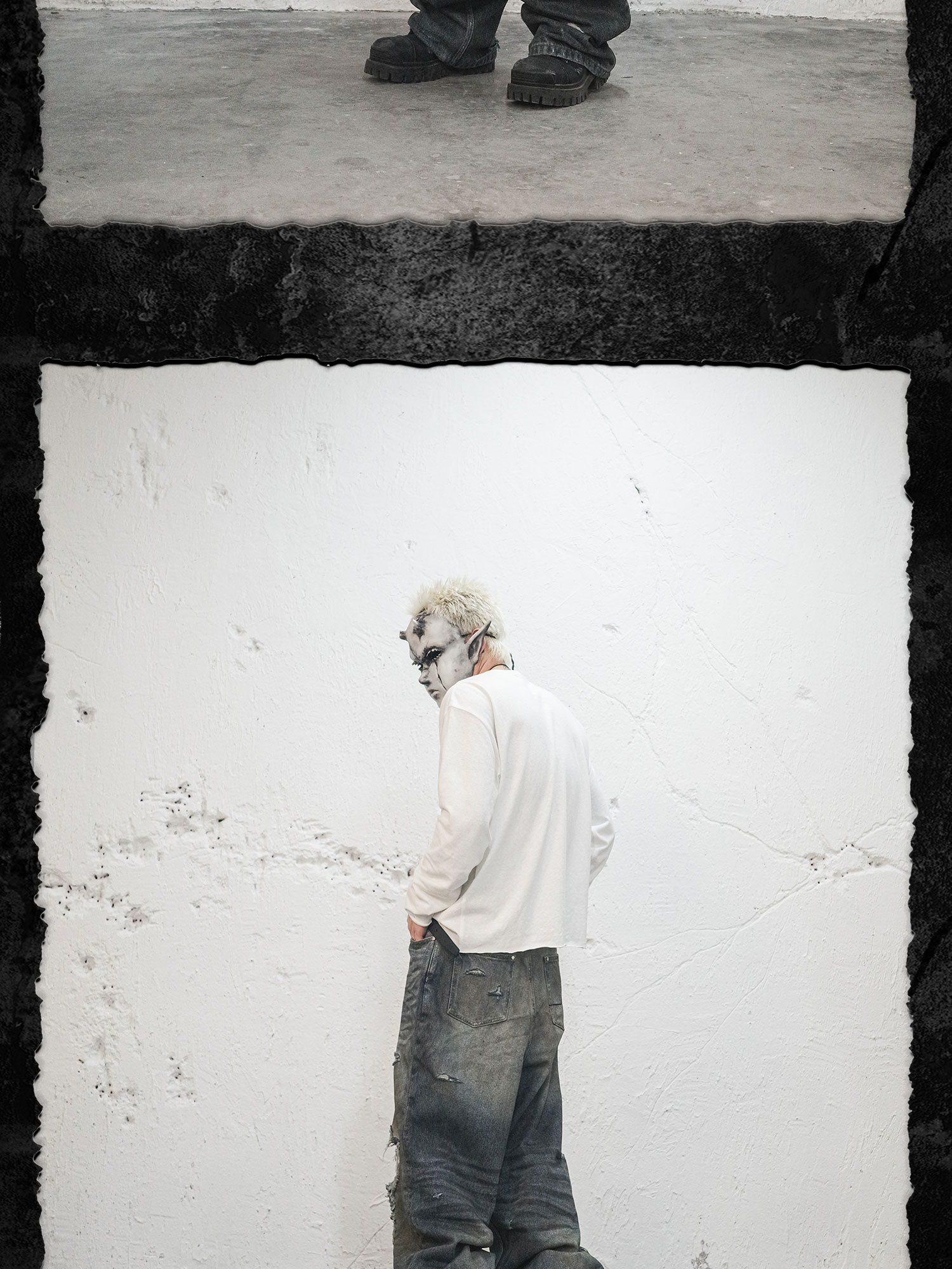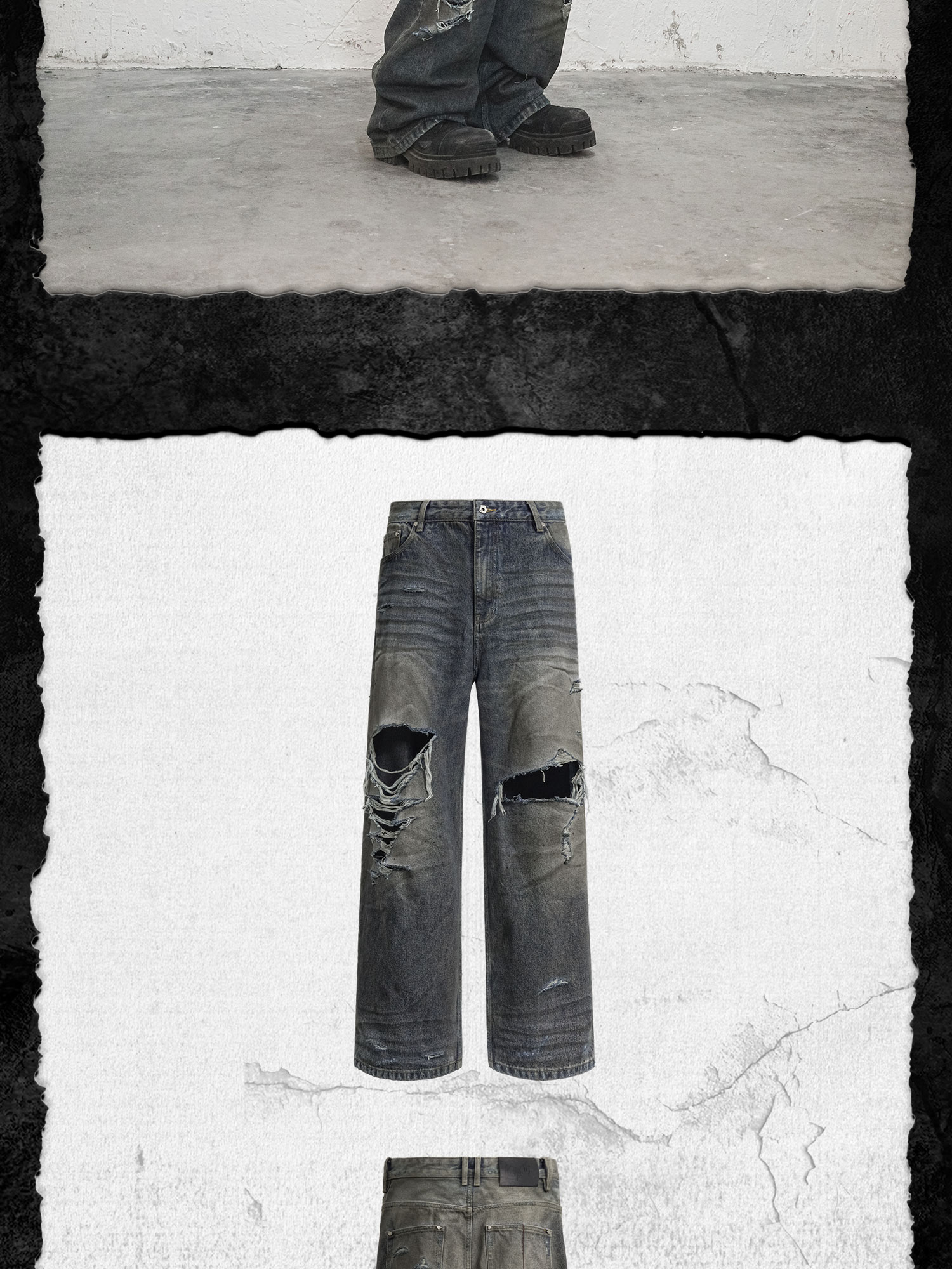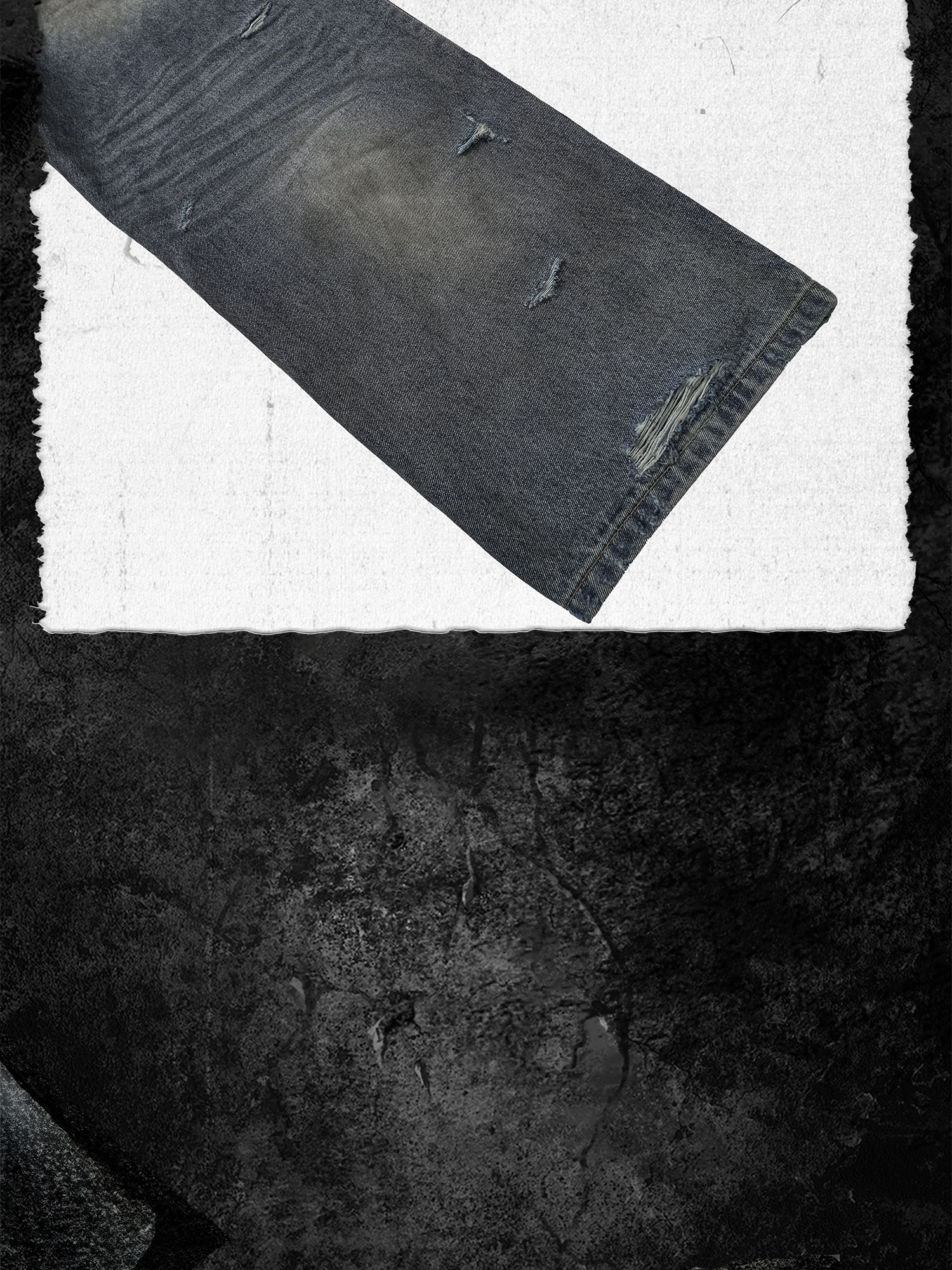 - UW baggy silhouette crafted from denim, treated with industrial washing to achieve a gradient faded, worn-in texture. The pants feature distressed and hand-sanded “cat whisker” details for layered visual depth, with irregular side-seam electrical distressing marking the passage of time and traces of a post-apocalyptic world. Large knife-cut tears at the pant legs expose structured denim in a deliberate, rugged way, like a declaration of life’s harsh trials. The rear waistband is accented with a custom brand leather patch, reminiscent of a subterranean mark, hiding the rebel’s unpolished edges within the coarse fabric folds.