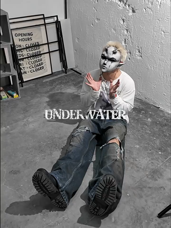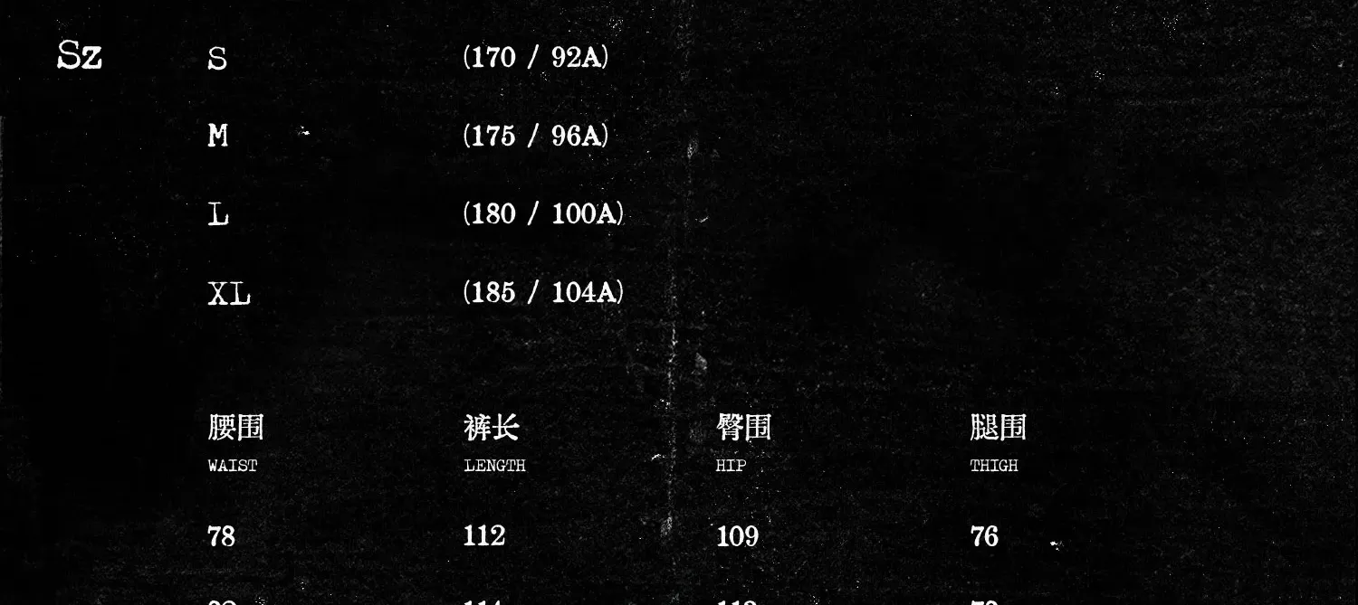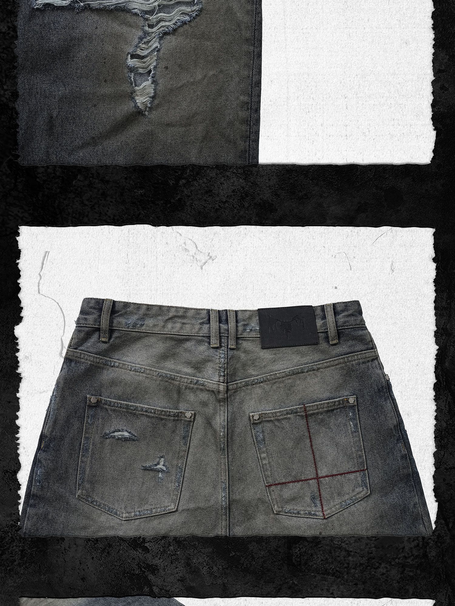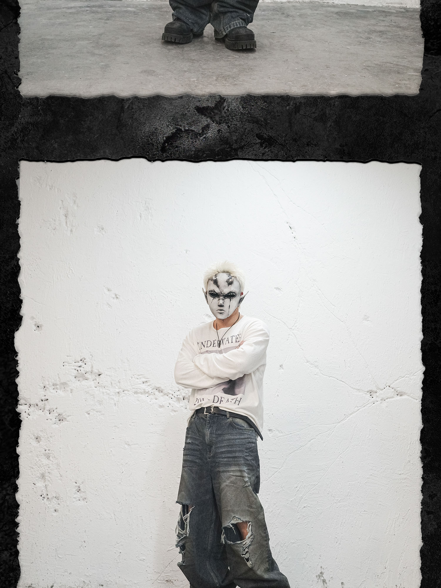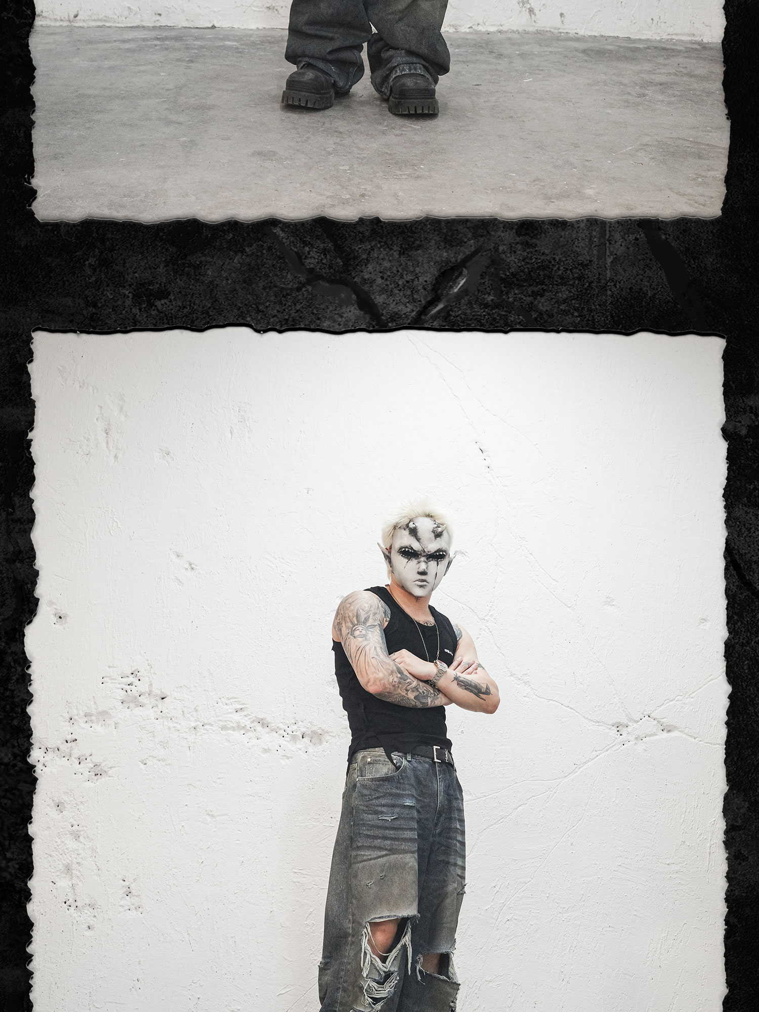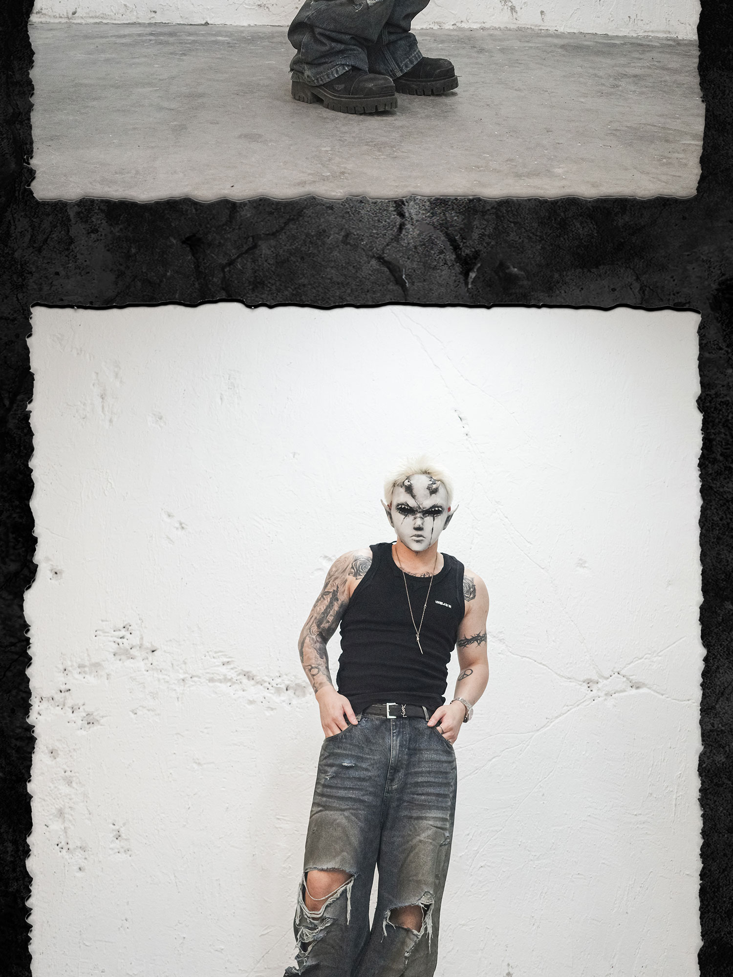 - UW baggy silhouette crafted from denim, treated with industrial washing to achieve a gradient faded, worn-in texture. The pants feature distressed and hand-sanded “cat whisker” details for layered visual depth, with irregular side-seam electrical distressing marking the passage of time and traces of a post-apocalyptic world. Large knife-cut tears at the pant legs expose structured denim in a deliberate, rugged way, like a declaration of life’s harsh trials. The rear waistband is accented with a custom brand leather patch, reminiscent of a subterranean mark, hiding the rebel’s unpolished edges within the coarse fabric folds.