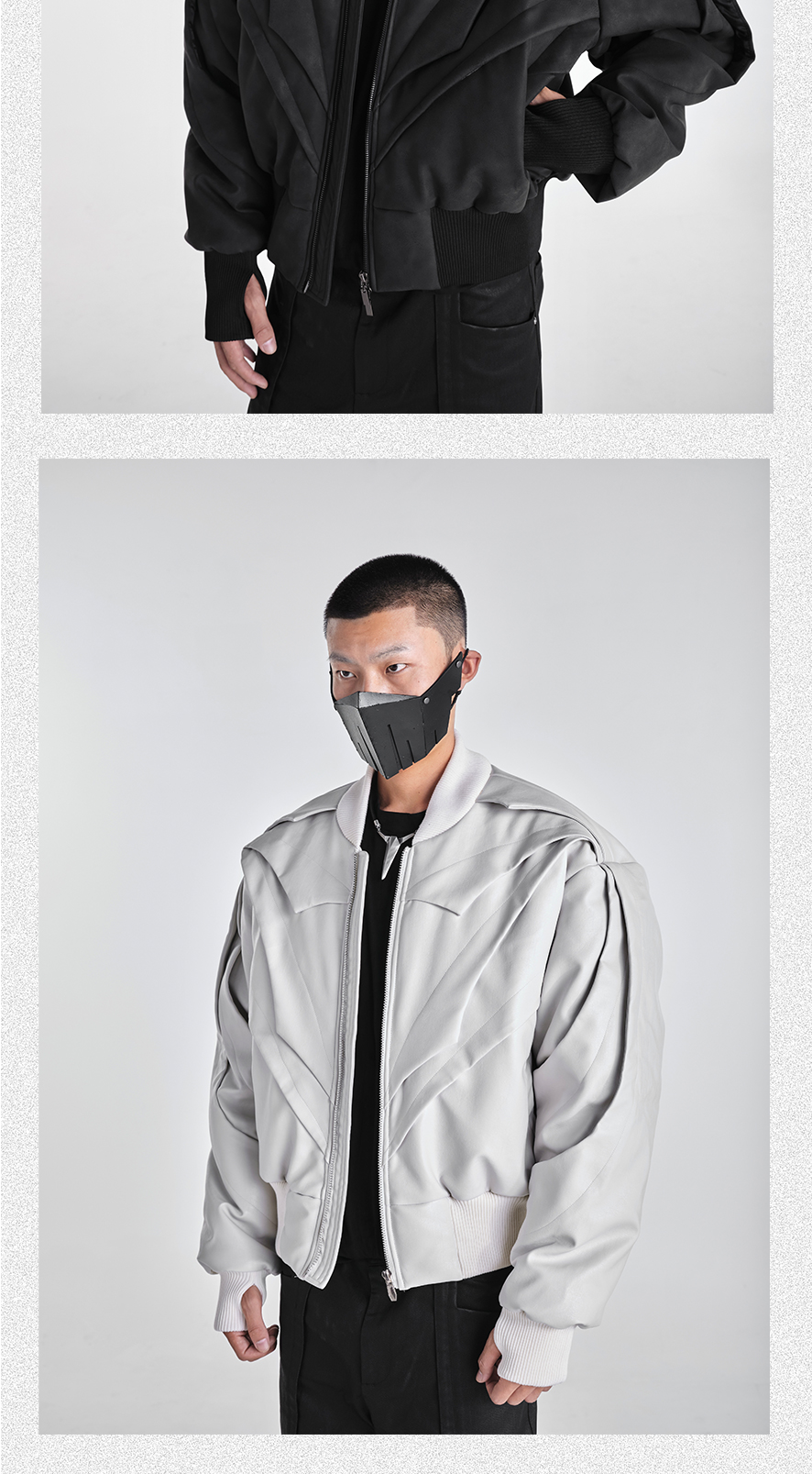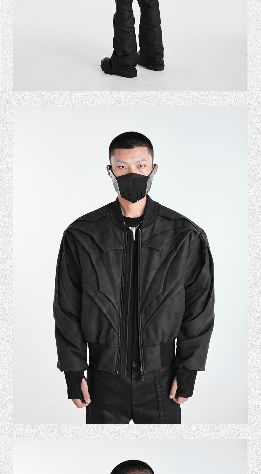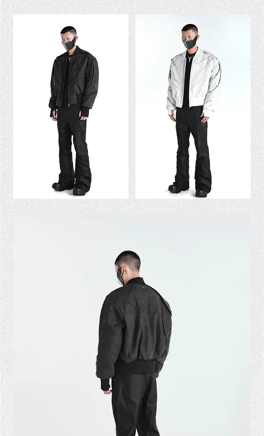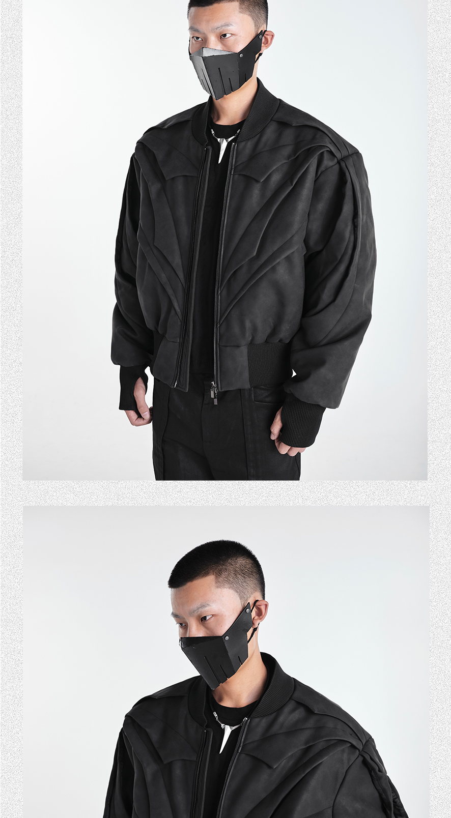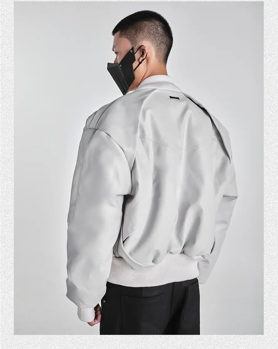 - Crafted with a matte granular texture, this avant-garde jacket features a batwing silhouette and multi-flap structural design that amplifies its three-dimensional layering. The custom metal backplate on the rear reinforces brand identity, while extended shoulder and back proportions create a bold, sculptural shape. Functional details such as finger-insert cuffs and wind-resistant structure make it both visually striking and performance-ready — merging streetwear aesthetics with utilitarian practicality.