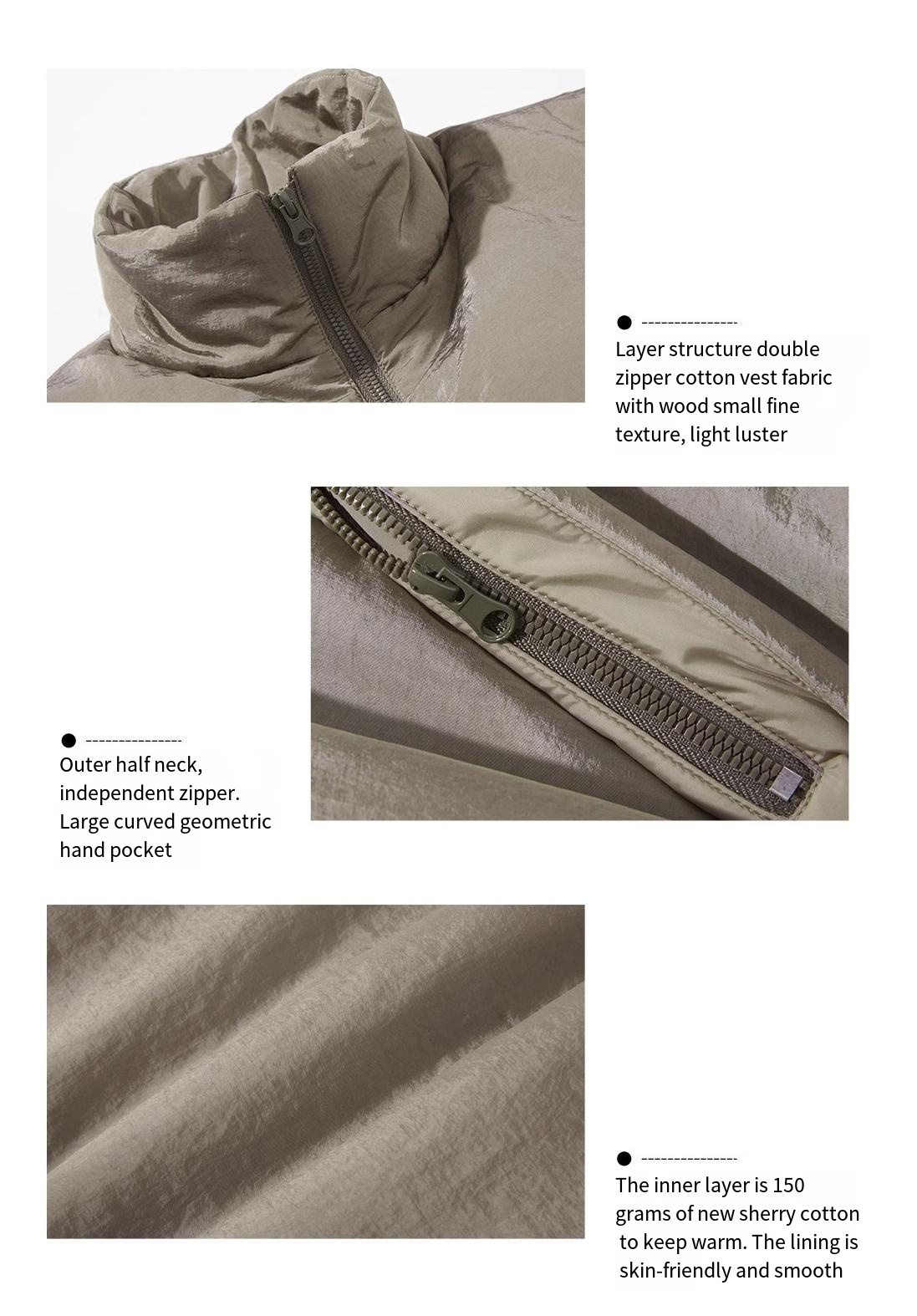 - Multi-layer structure double zipper cotton vest, fabric with wood small fine texture, light luster. The inner layer is 150 grams of new sherry cotton to keep warm. The lining is skin-friendly and smooth. Styles are divided into three layers, superimposed on each other. Outer half neck, independent zipper. Middle U-neck, large arc geometric hand pocket, back side with zipper pocket, easy to store. The inner and middle layers share zippers. Both flap zippers are independent and can be opened up and down.