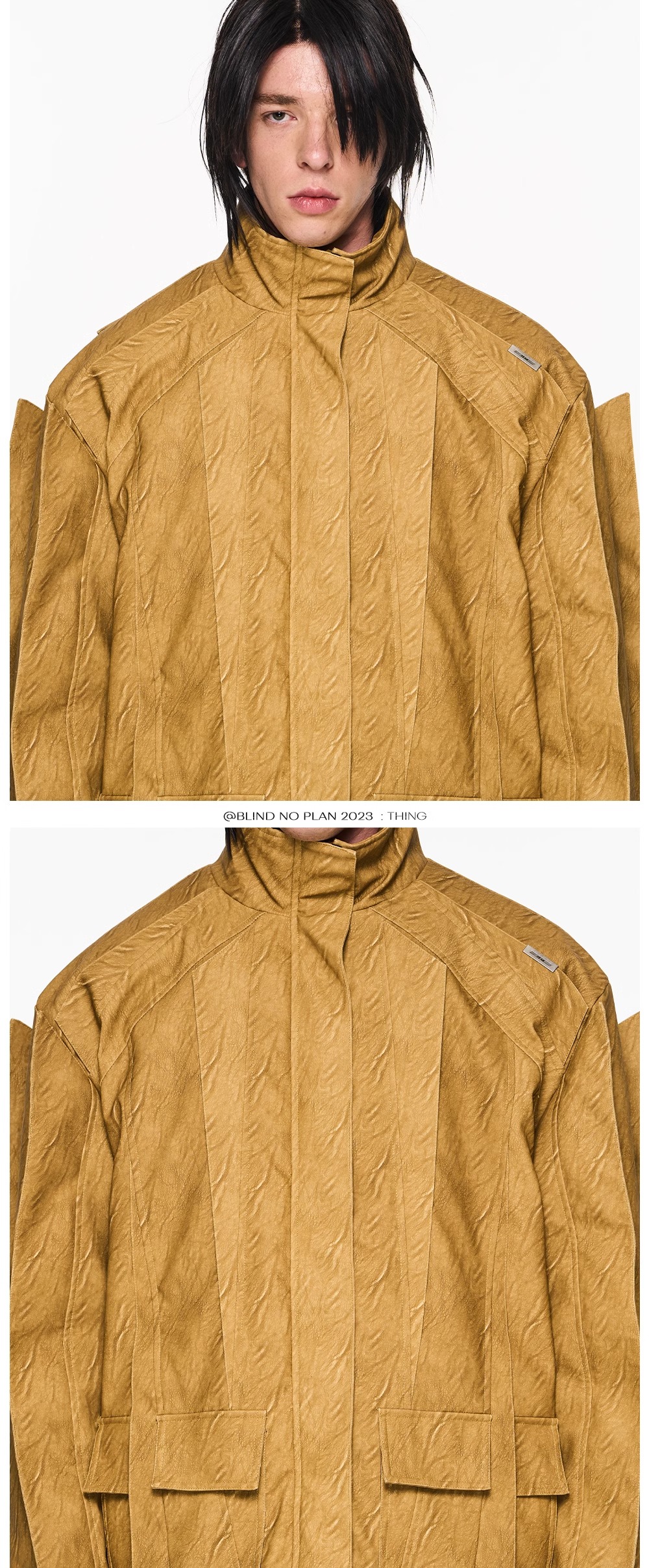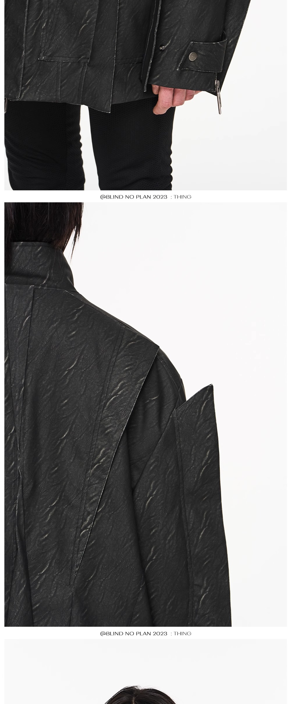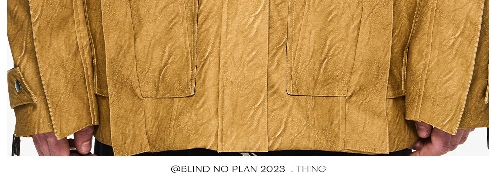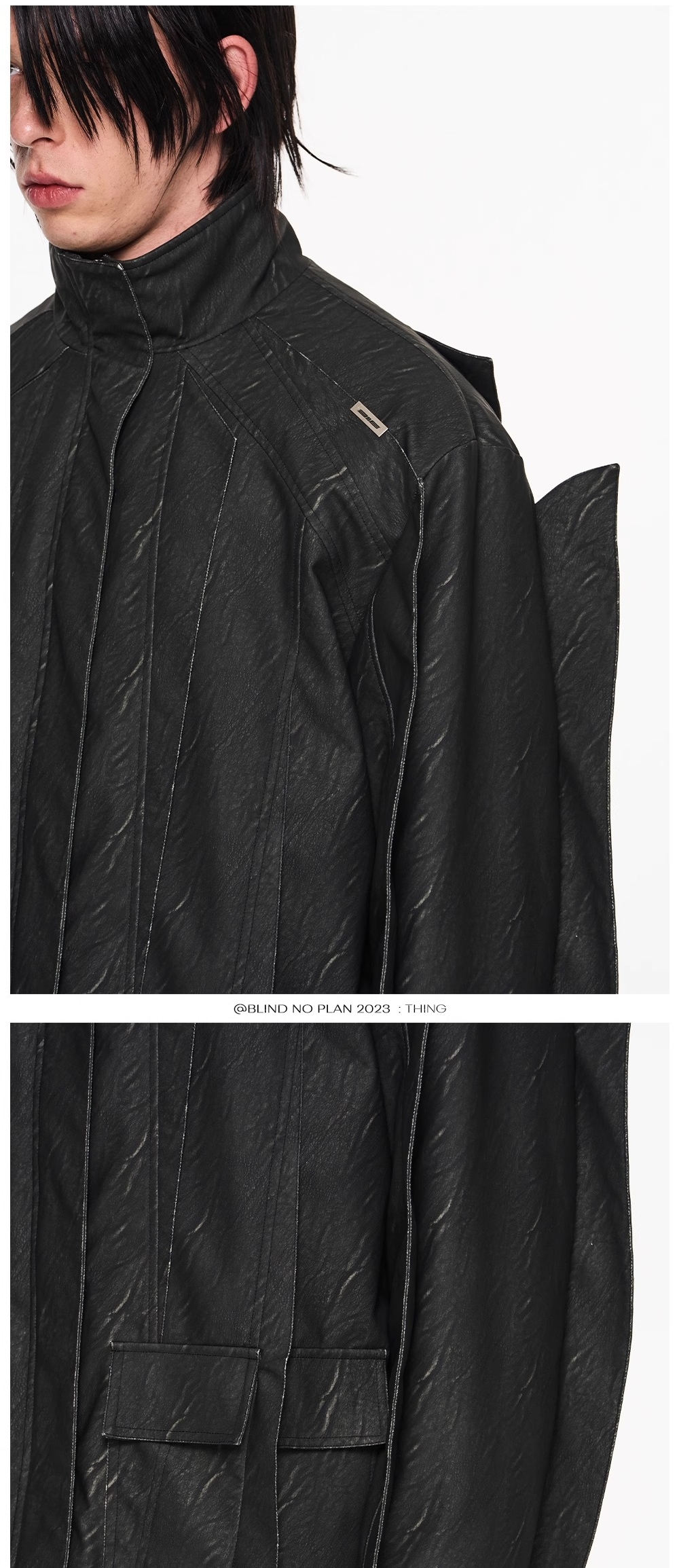 Design Details: Infusing the flying element into the leather jacket, creating a rich layering and visual appeal. The cuffs are adorned with inner buckle fastening, and a custom metal tag adds embellishment. The fabric chosen features a washed texture.