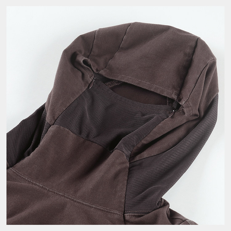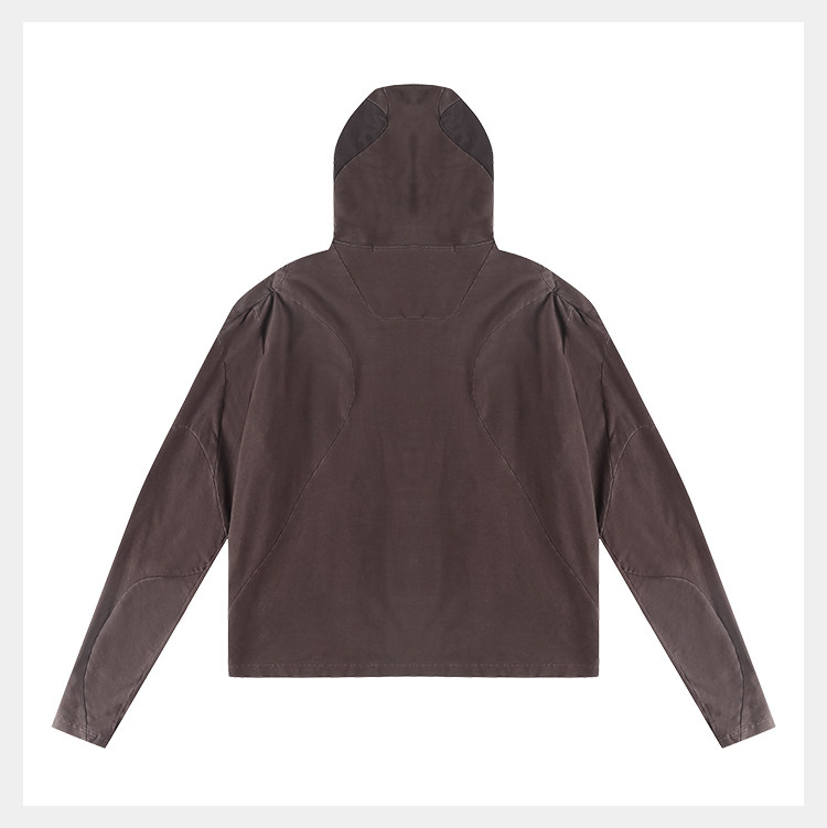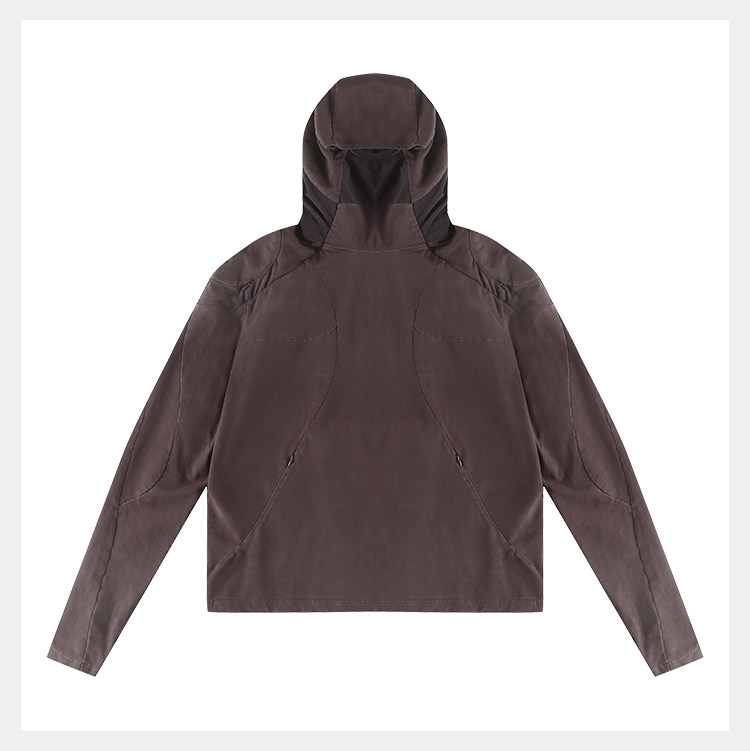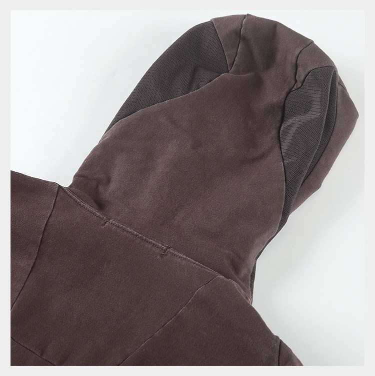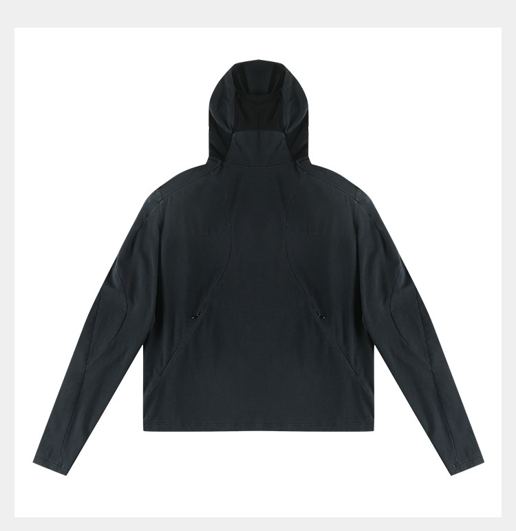• Based on a fitted tactical pullover hoodie silhouette, this piece reimagines the traditional cinched hem with an open cut, integrating structural seam lines and concealed side pockets. The shoulders feature removable structured padding, while the hood combines dense mesh panels for a secure wrap and the front mesh panel ensures strong breathability. A unique horizontal zipper at the neckline adds dimensional detail and shape. Whether worn alone or layered, it delivers a distinct, structured silhouette. Made from a blend of premium stretch cotton and mesh for comfort, breathability, and lightweight mobility—tactical in feel and wearable with standout style.