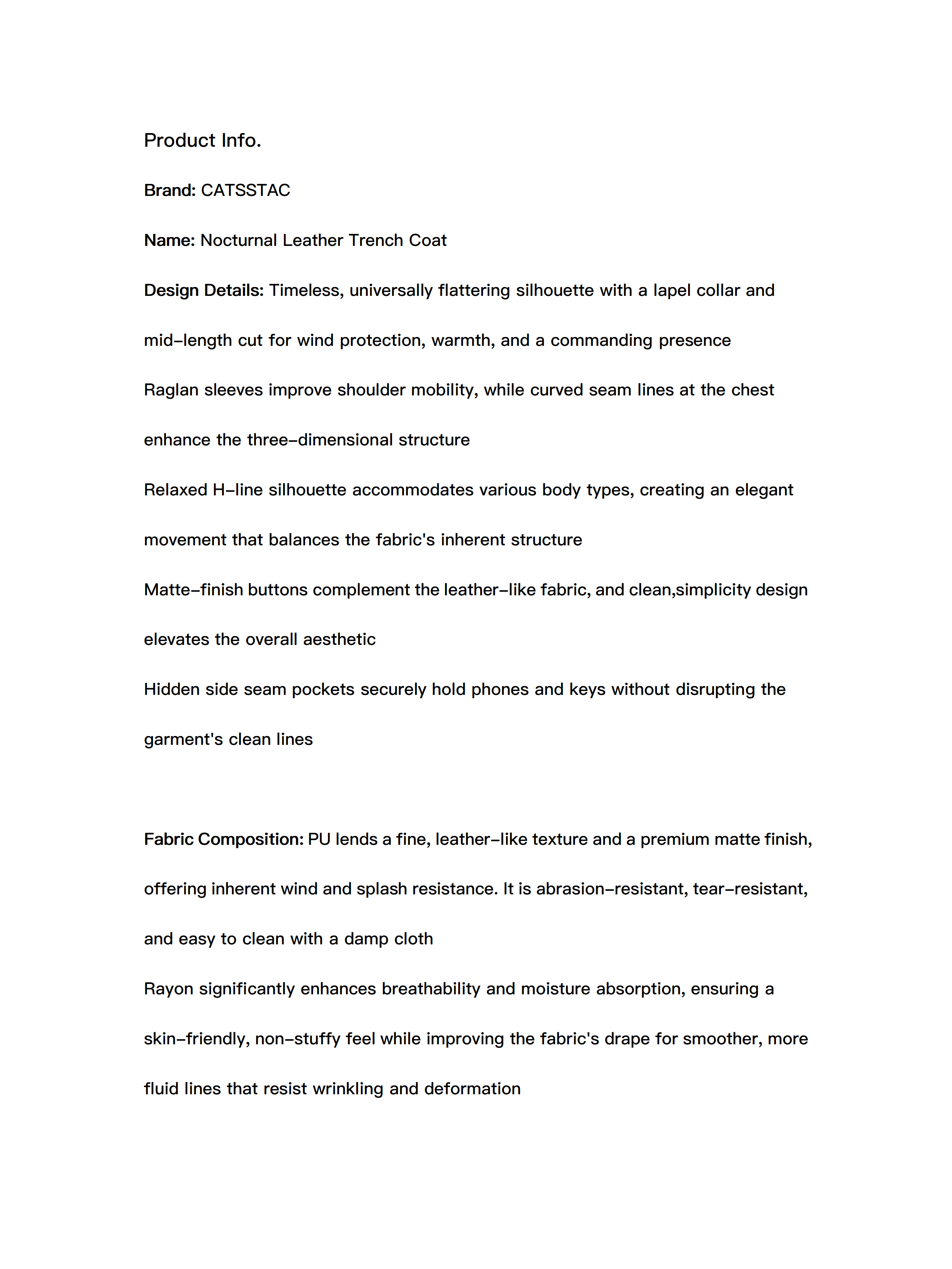 Timeless, universally flattering silhouette with a lapel collar and mid-length cut for wind protection, warmth, and a commanding presence.Raglan sleeves improve shoulder mobility, while curved seam lines at the chest enhance the three-dimensional structure.Relaxed H-line silhouette accommodates various body types, creating an elegant movement that balances the fabric's inherent structure.Matte-fin