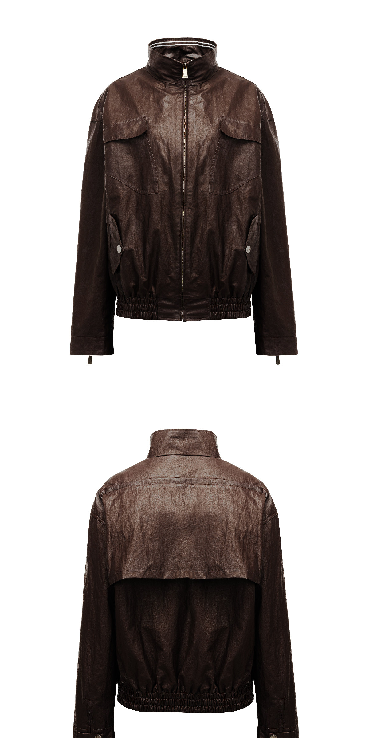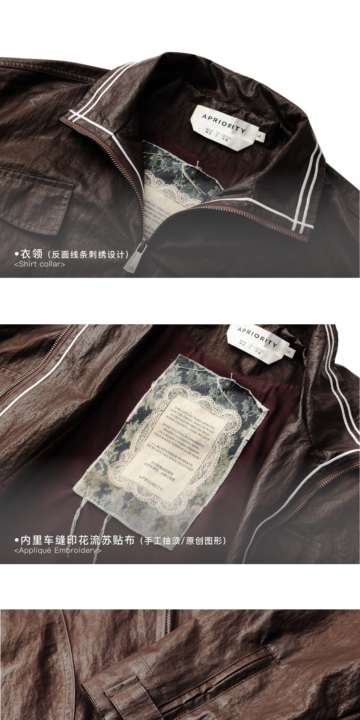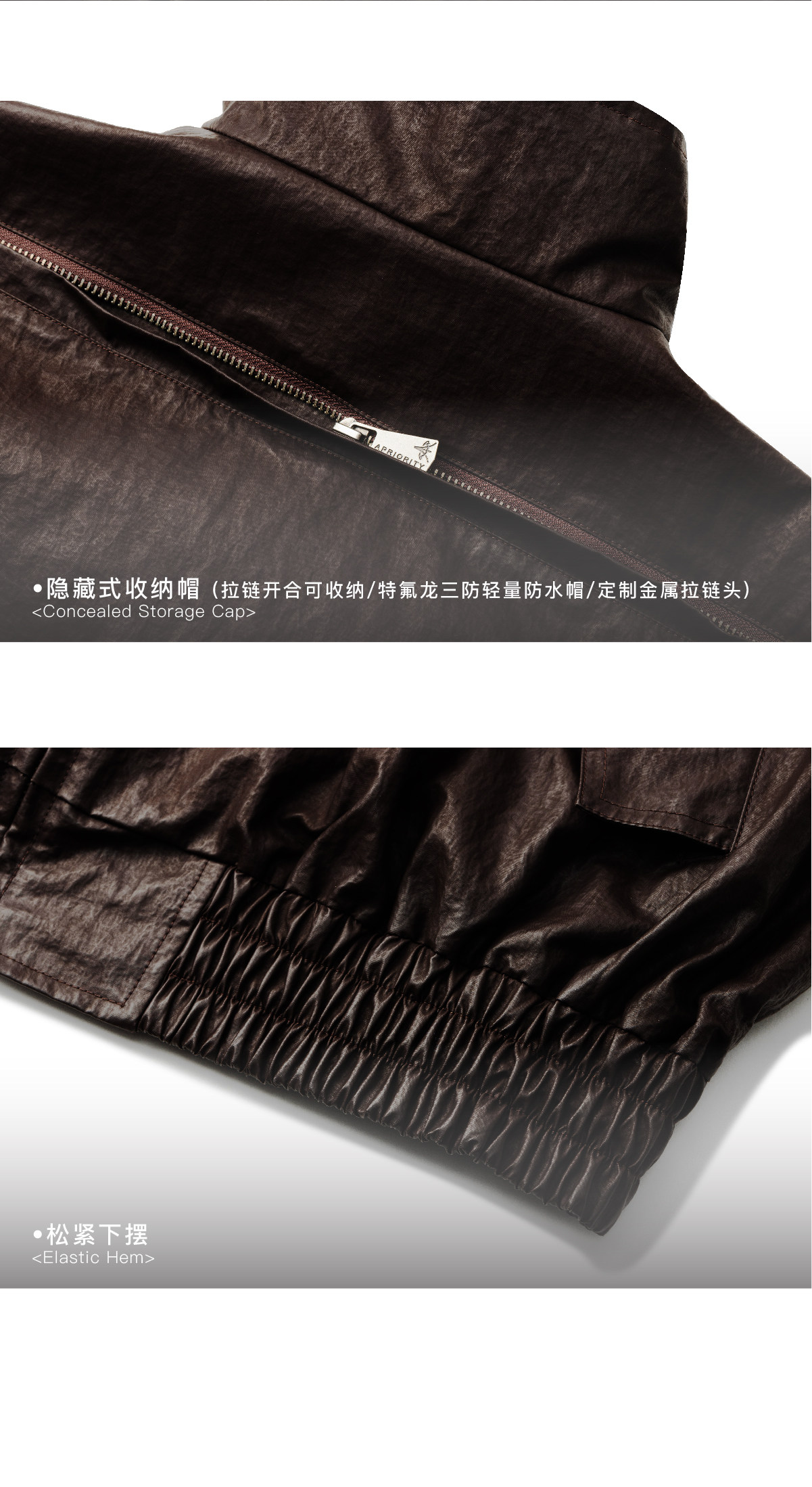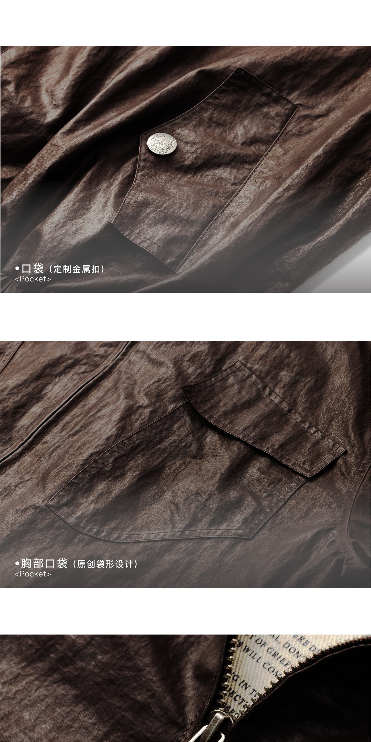 Design Details: Original chest pocket design; back zipper opens to stow waterproof hood; Teflon triple-protection lightweight waterproof hood. Zippered cuffs; embroidered design on reverse side; elasticized hem; custom metal zipper pull. Vintage oil wax coated fabric; garment pre-wash finish; moisture-proof and water-repellent, durable and easy to clean. YKK snap buttons; printed fringe patch sewn inside; back gu