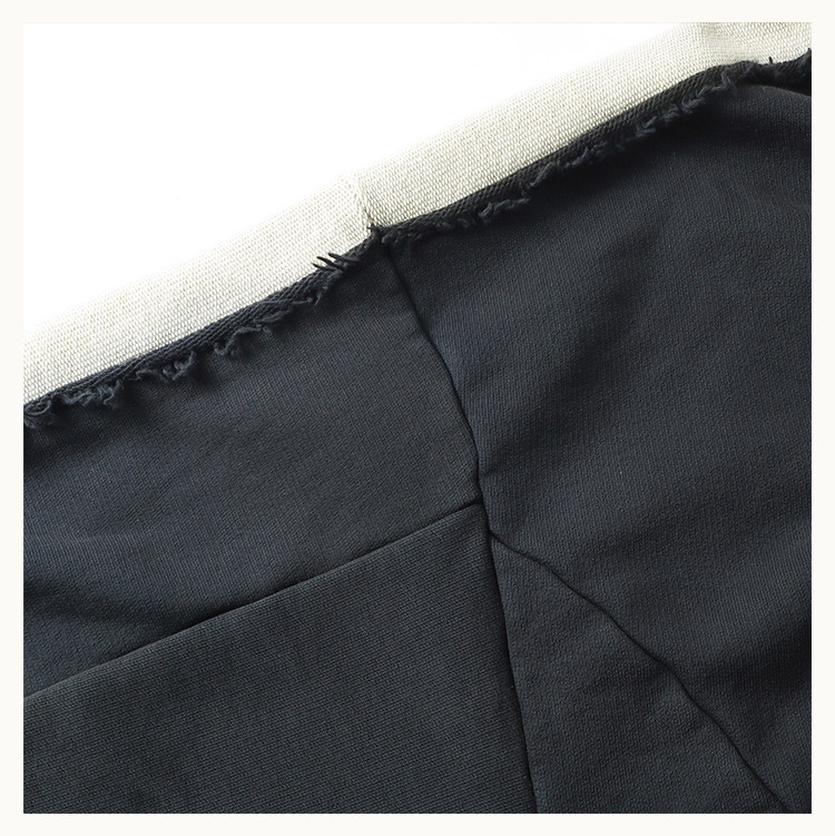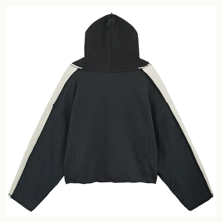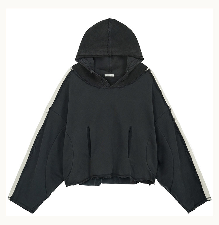 • This hoodie features a cropped, wide silhouette ending above the hips. With an ultra‑relaxed, voluminous shape, the front includes through‑cut parallel pockets. The oversized hood is enhanced with an adjustable snap‑button closure for wind protection and added styling options. Seam lines flow continuously from the body to the sleeves, forming an exaggerated batwing shape. Raw‑edge insets of contrasting fabric connect the shoulders and sleeves. The hood, cuffs, and hem are finished with D5OVE’s signature raw‑edge detailing.