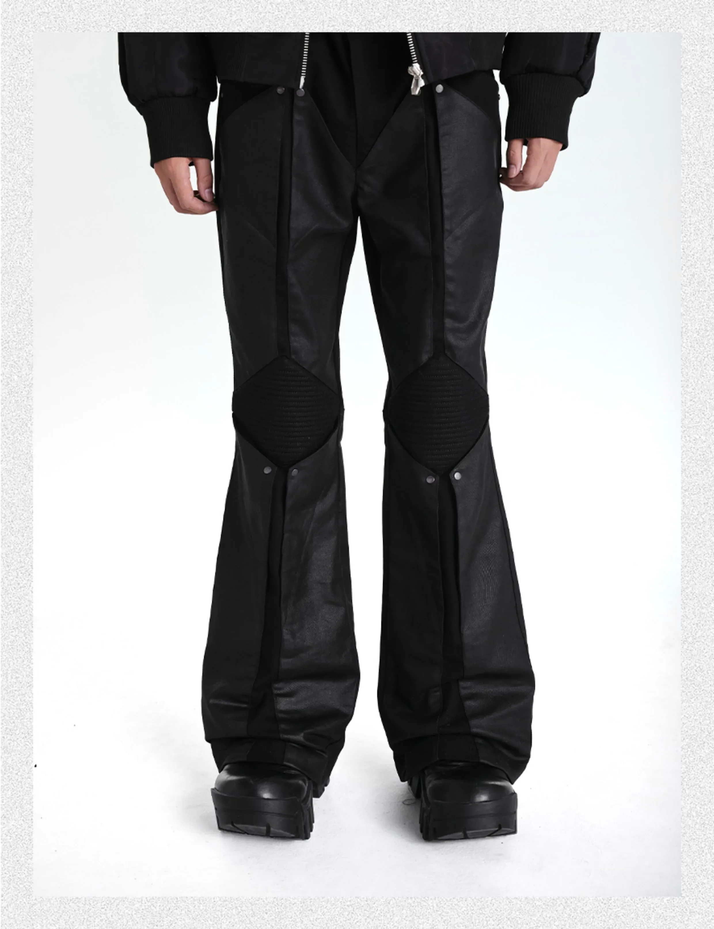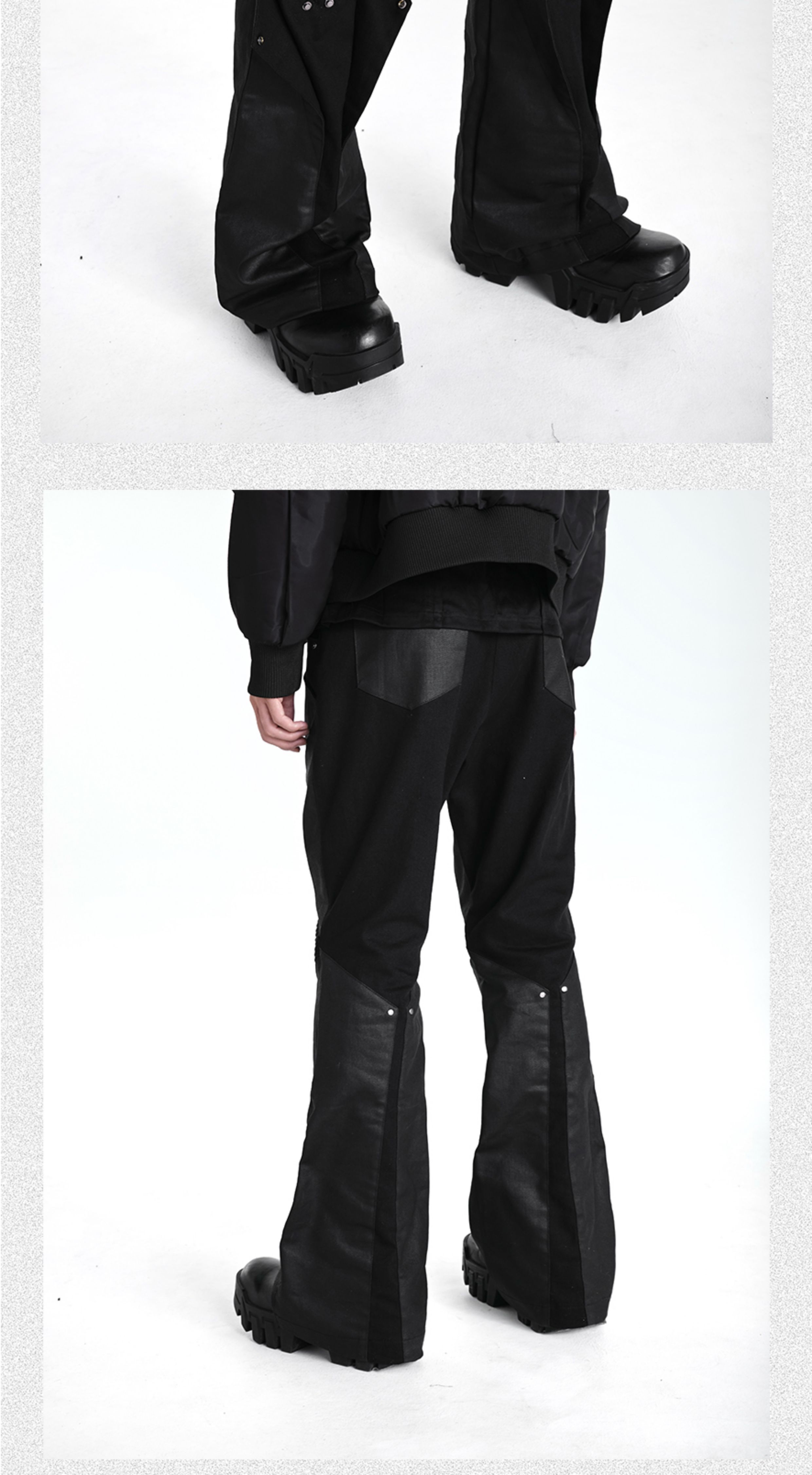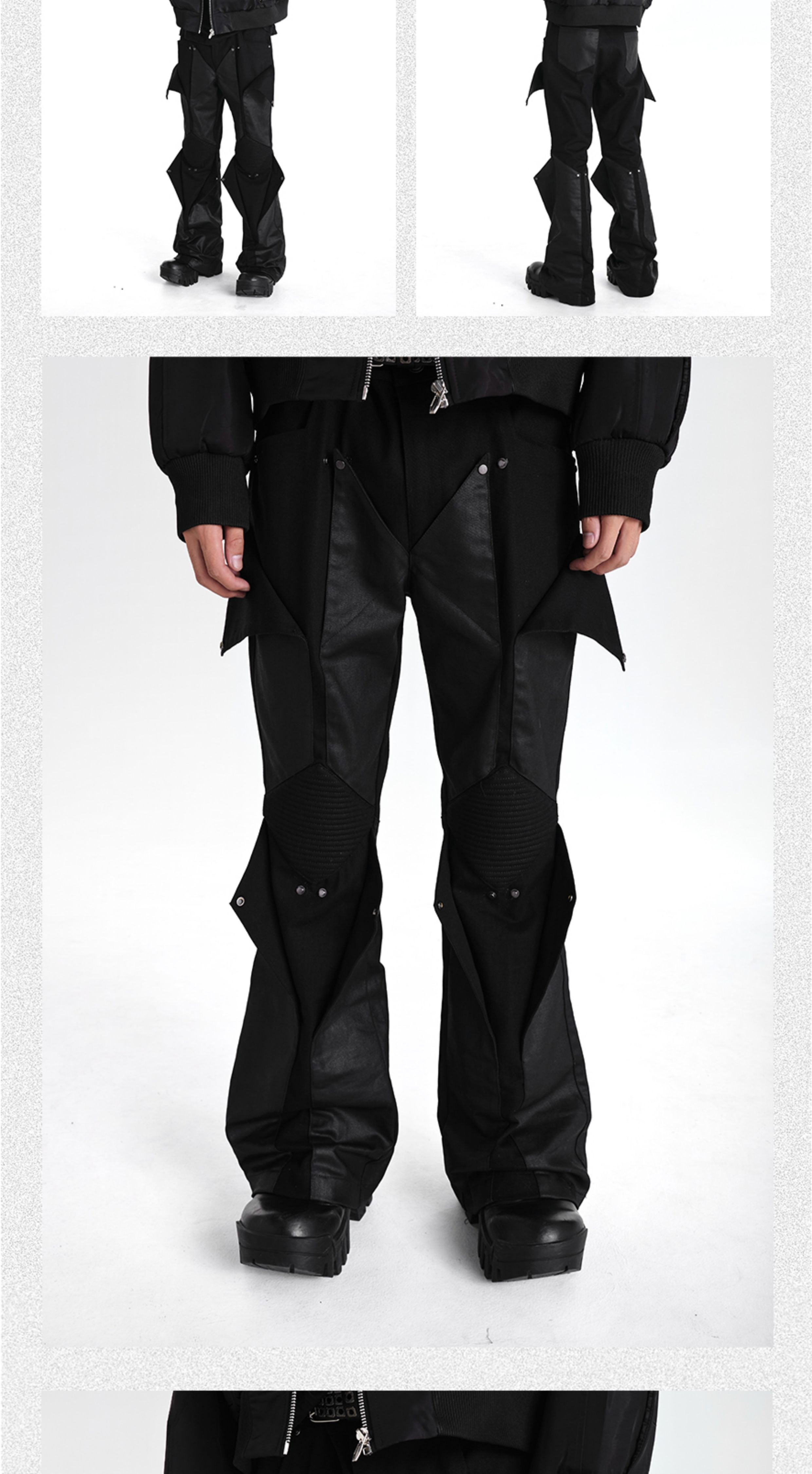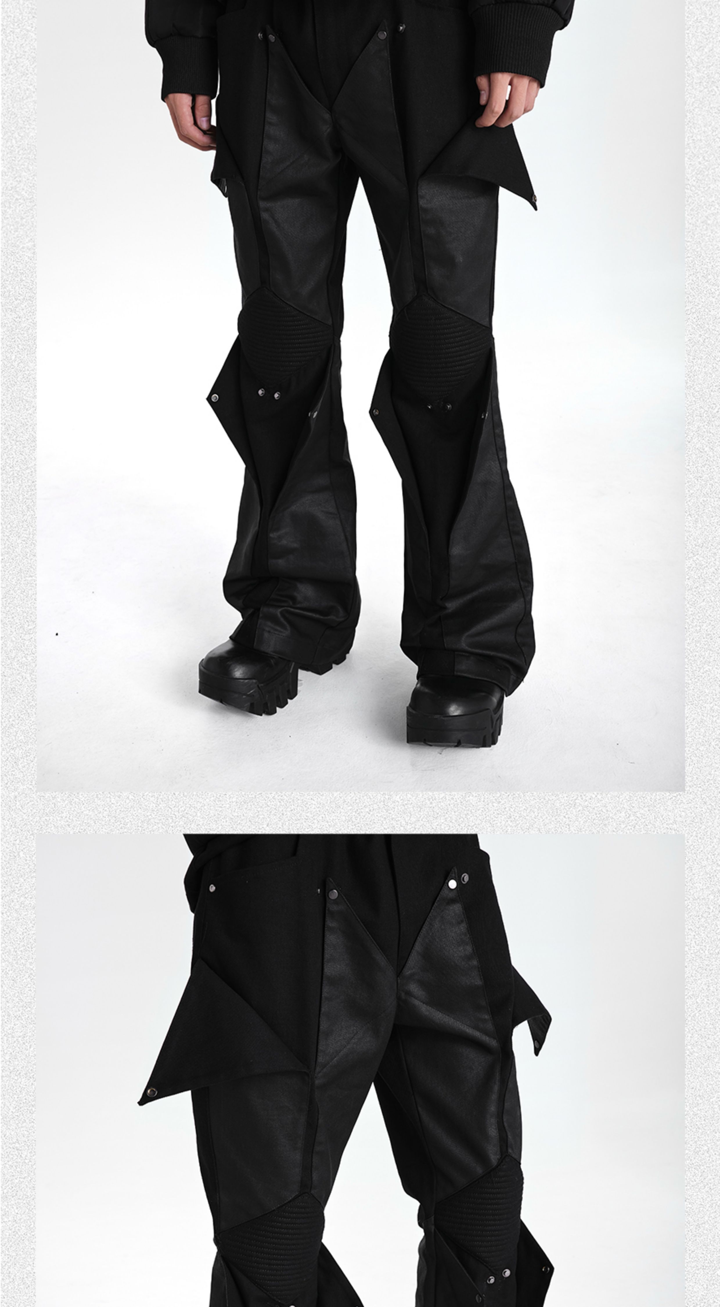 - Crafted with a combination of waxed fabric and black denim, these pants feature a layered scale-like panel design that adds strong dimensionality. The pleated knee construction enhances movement and shape, while metal accessories and snap-button flaps allow for adjustable styling — flip them open to create striking visual effects. A piece that maximizes avant-garde attitude and fashion expression.