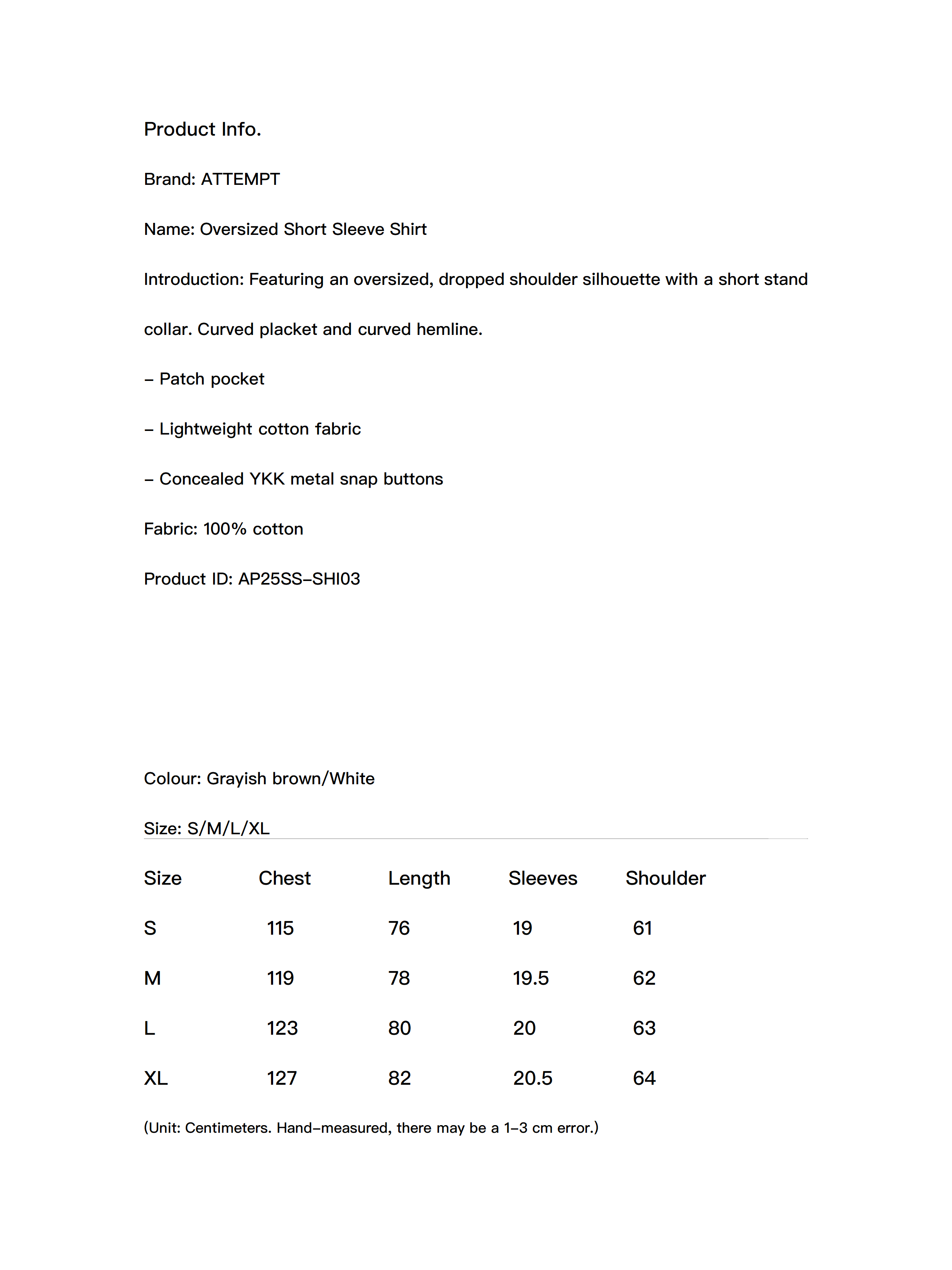 Featuring an oversized, dropped shoulder silhouette with a short stand collar. Curved placket and curved hemline. - Patch pocket - Lightweight cotton fabric - Concealed YKK metal snap buttons